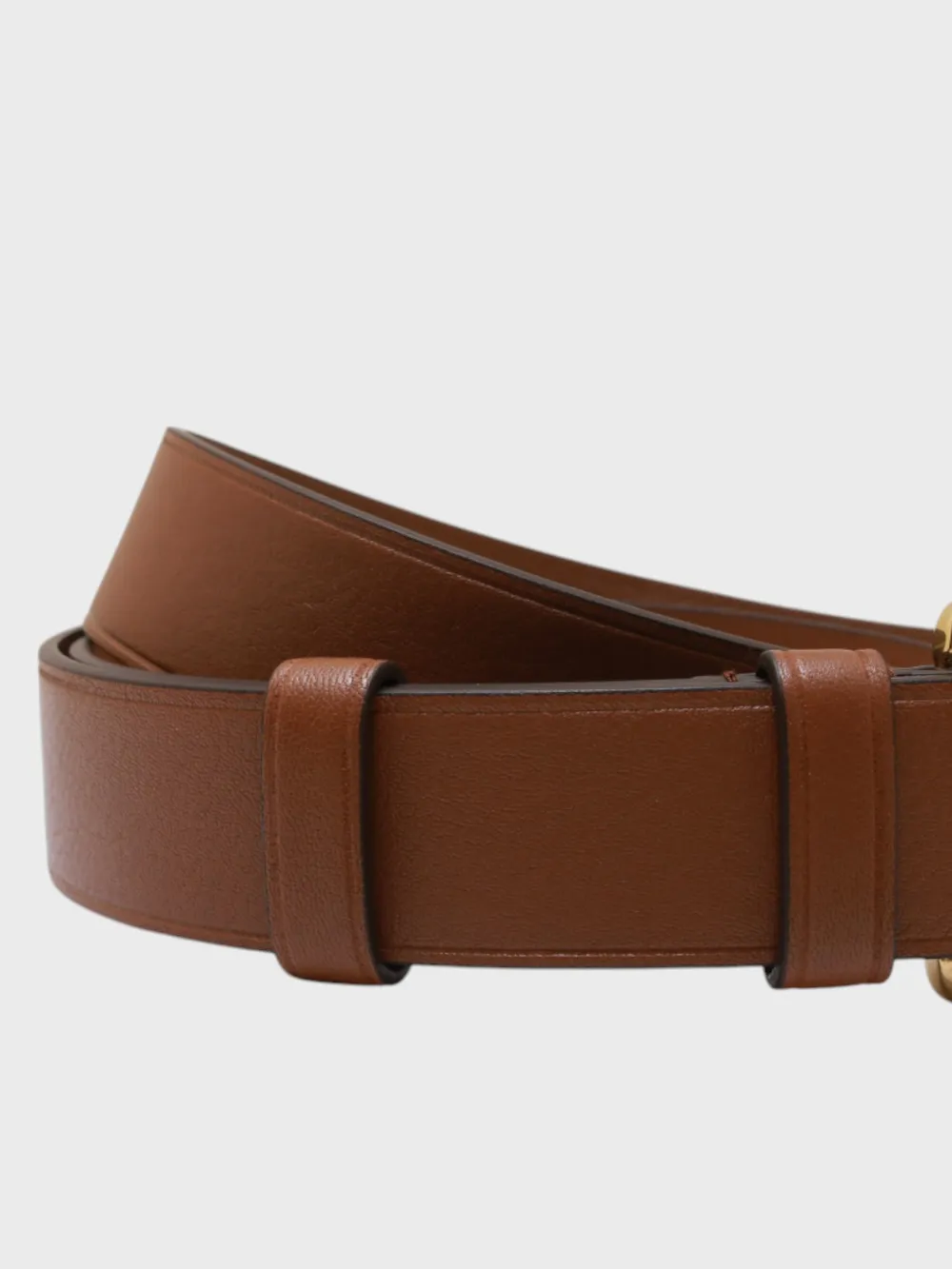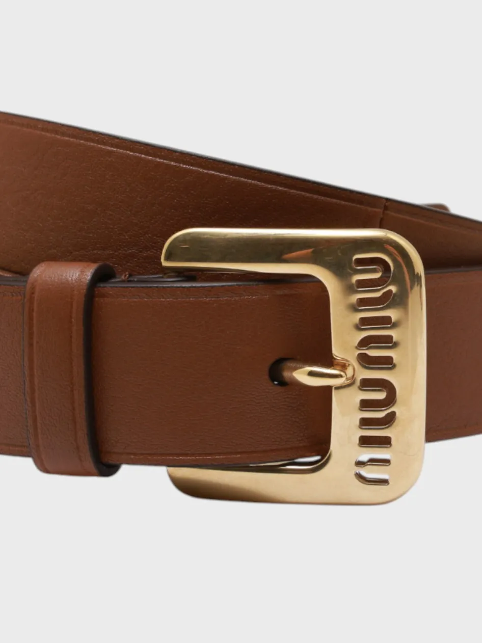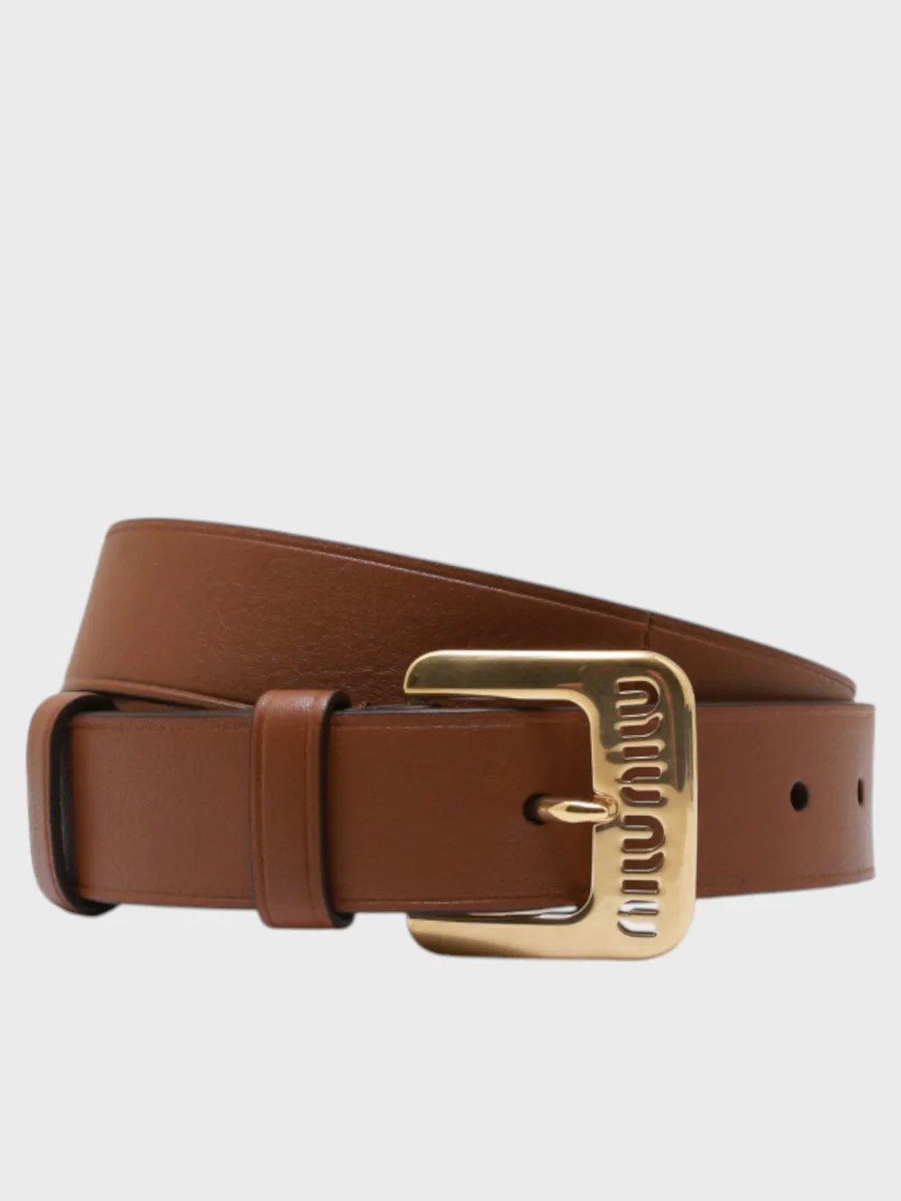 Ремень Miu Miu выполнен из качественной коричневой кожи с фактурным граненым текстурным эффектом. Модель дополнена золотой металлической пряжкой с логотипом бренда, которая придает аксессуару современный и элегантный вид. Широкий ремень идеально подчеркивает силуэт, а его универсальный дизайн позволяет сочетать как с повседневной, так и с деловой одеждой. Идеальный выбор для ценителей премиальных материалов и классического стиля.