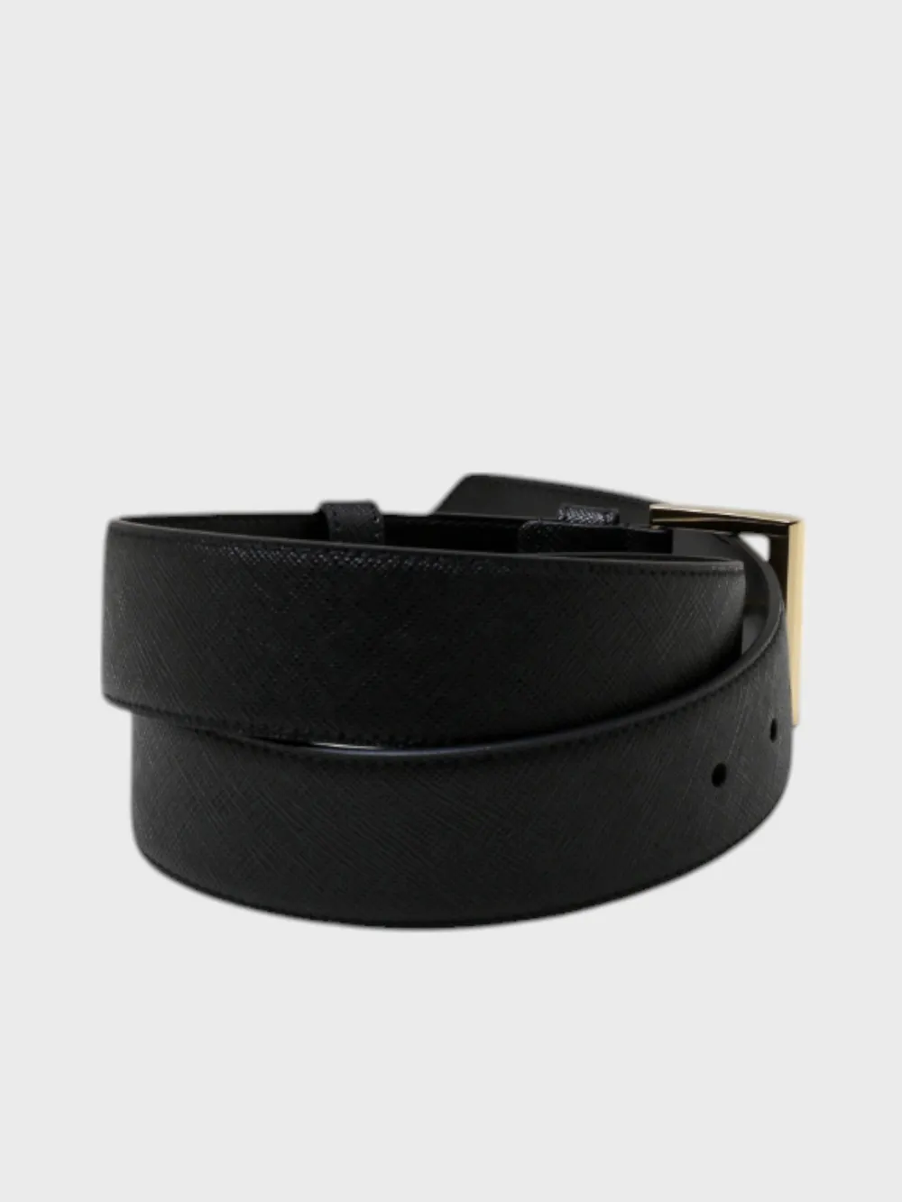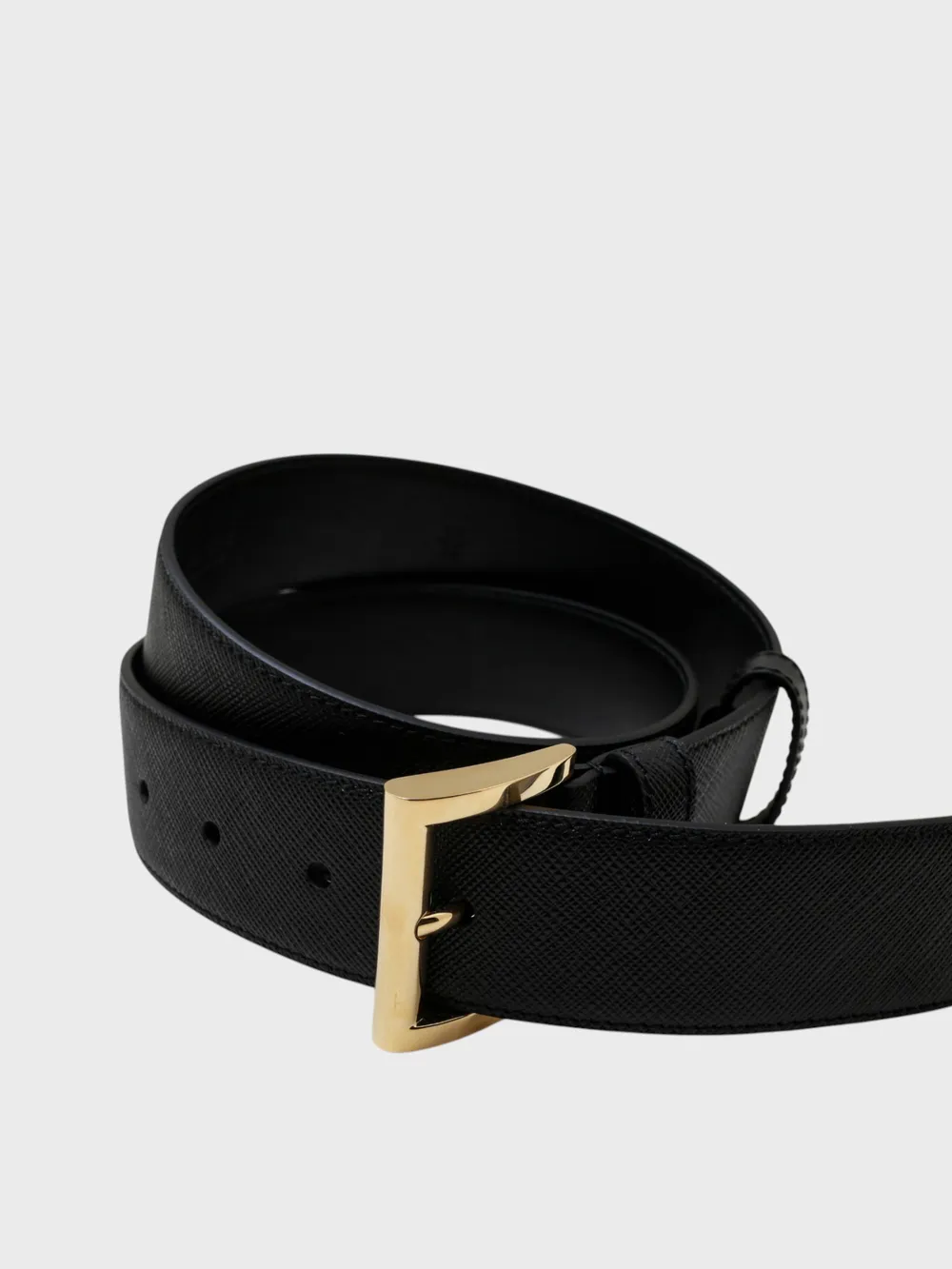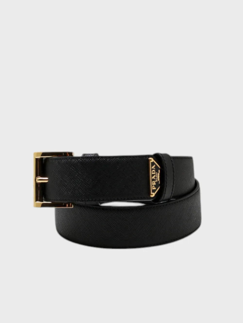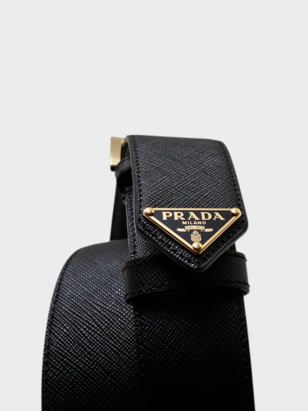 Ремень Prada выполнен из высококачественной кожи черного цвета с фактурным рисунком. Модель отличается лаконичным дизайном и классическим исполнением, что делает ее универсальным аксессуаром для любого образа. Застежка выполнена из золотистого металла с фирменной эмблемой бренда в виде треугольника, которая подчеркивает статусность изделия. Ремень дополнен удобной системой регулировки длины, а его внутренняя сторона оформлена мягкой кожей для максимального комфорта при носке. Идеально сочетается как с деловой, так и с повседневной одеждой, добавляя образу изысканности и премиальности.