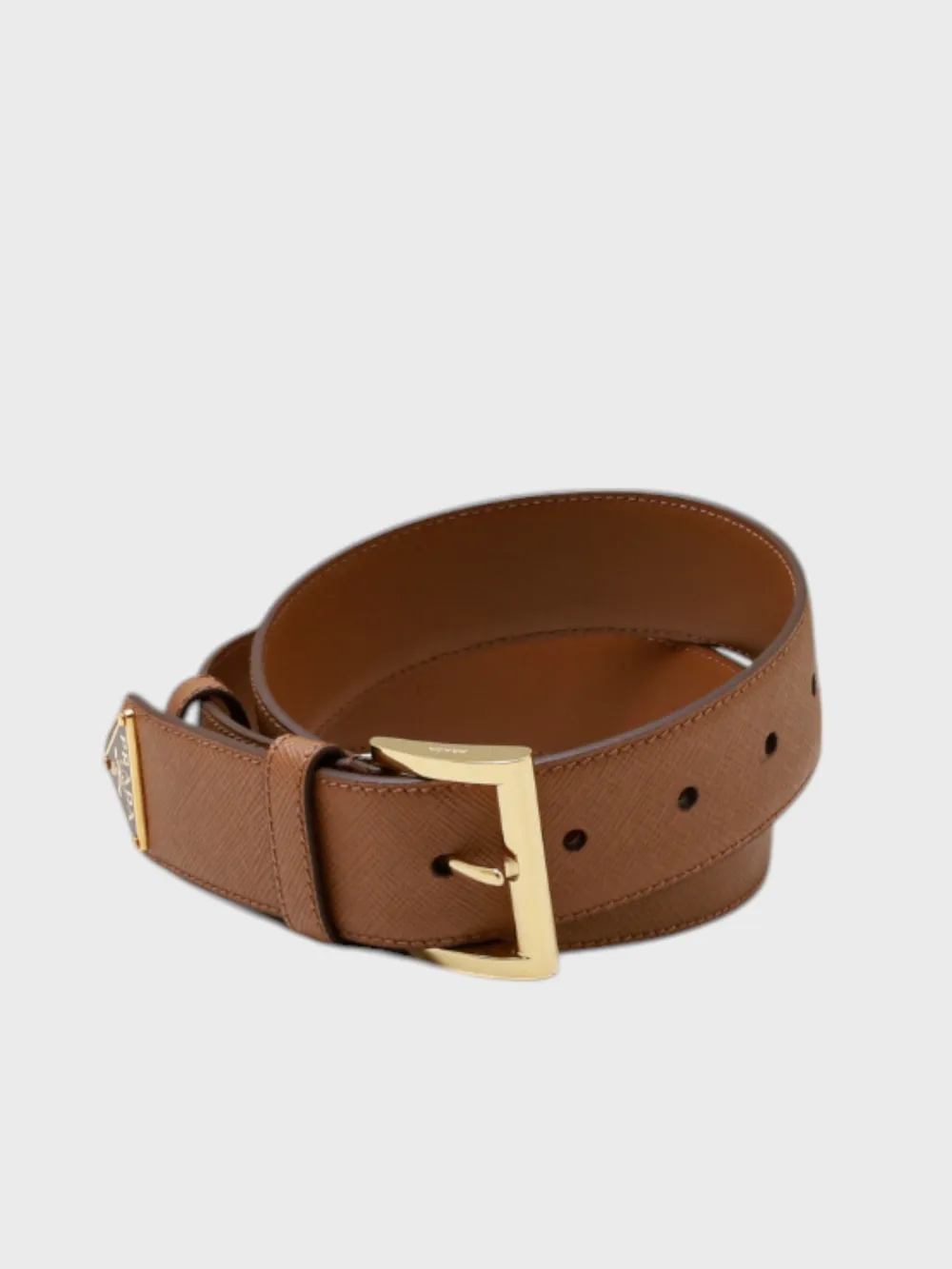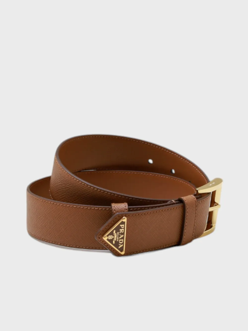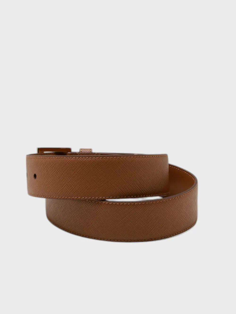 Ремень Prada выполнен из качественной кожи коричневого цвета с фактурным рисунком. Модель отличается лаконичным дизайном и классическим исполнением, что делает ее универсальным аксессуаром для любого образа. Застежка выполнена из золотистого металла с фирменной эмблемой бренда в виде треугольника, которая подчеркивает статусность изделия. Ремень дополнен удобной системой регулировки длины, а его внутренняя сторона оформлена мягкой кожей для максимального комфорта при носке. Идеально сочетается как с деловой, так и с повседневной одеждой, добавляя образу изысканности и премиальности.