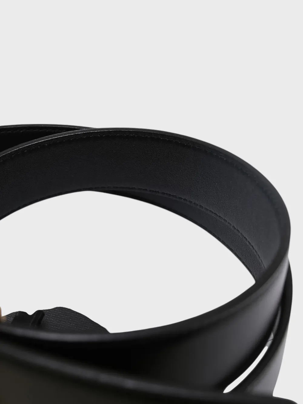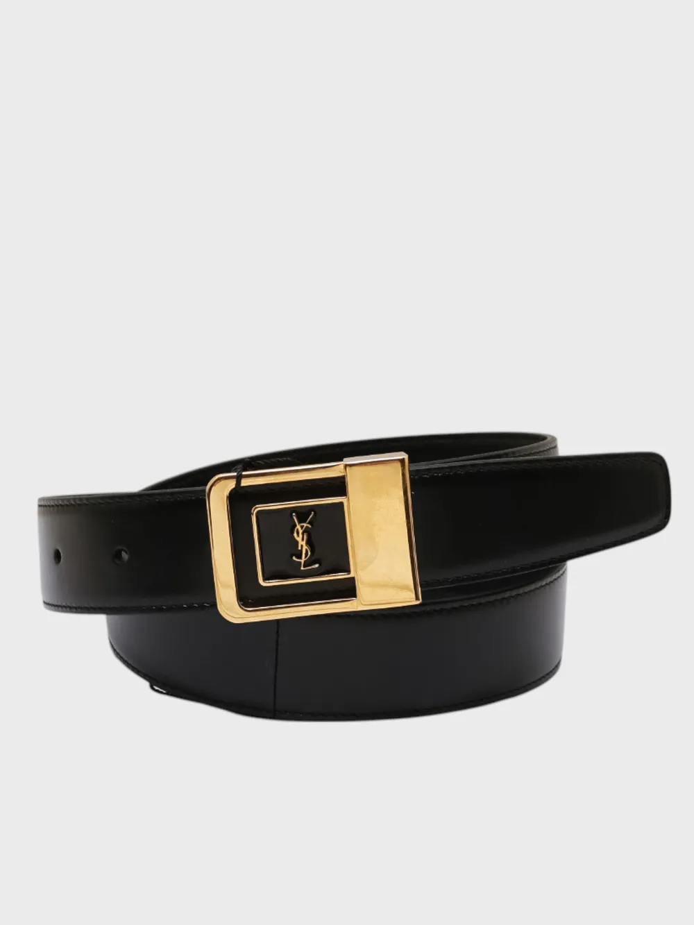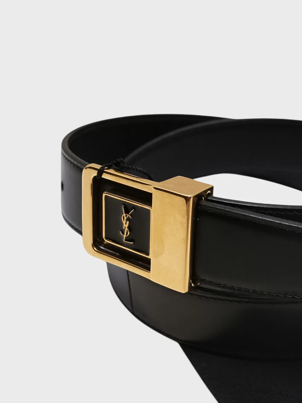 Ремень Saint Laurent выполнен из черной глянцевой кожи с классическим логотипом "YSL" на пряжке. Модель дополнена металлической фурнитурой в тон, которая добавляет элегантности и роскоши. Комбинация текстуры кожи и металла создает премиальный вид, идеально подходящий для завершения деловых или вечерних образов. Ремень обеспечивает комфортную посадку и долговечность благодаря качественным материалам.