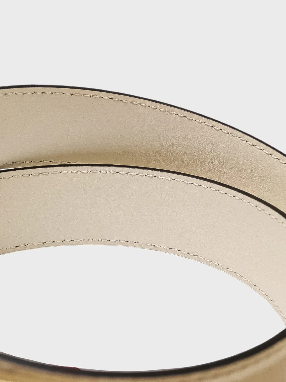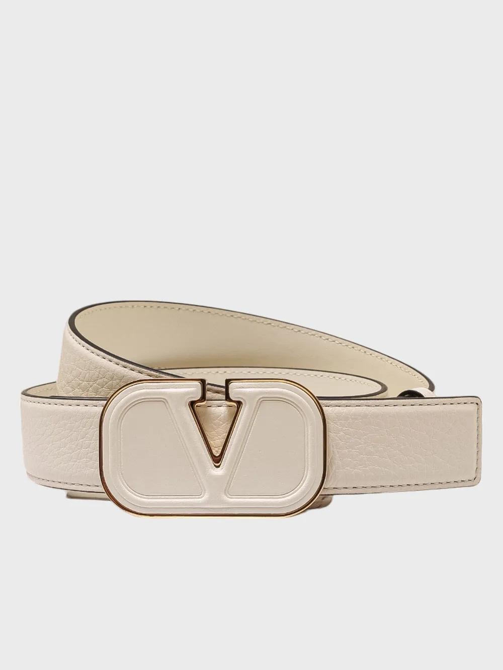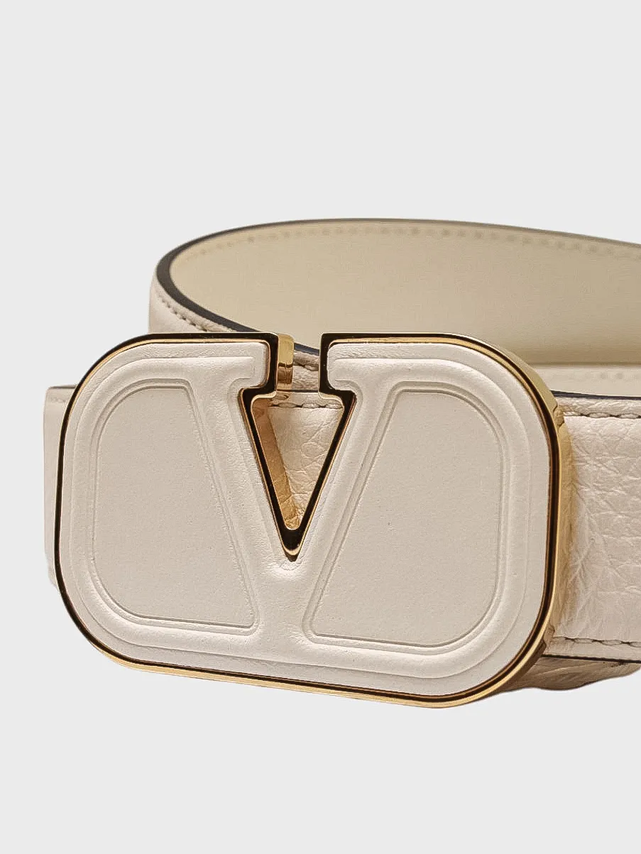Ремень Valentino выполнен из светло-бежевой кожи с текстурой, дополненной золотой пряжкой в виде логотипа "V". Модель сочетает классический дизайн с современными деталями: гладкая поверхность ремня и акцент на металлическую фурнитуру создают элегантный и роскошный вид. Простой и универсальный аксессуар, который идеально подходит для повседневной носки или делового стиля.