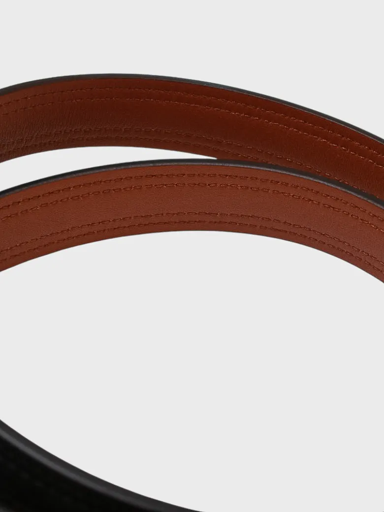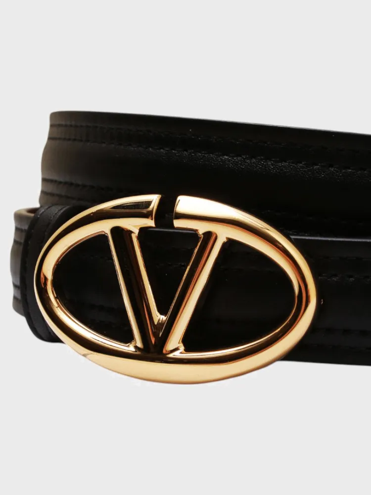 Ремень Valentino выполнен из черной кожи с текстурой, дополненной золотой пряжкой в виде логотипа "V". Модель сочетает классический дизайн с современными деталями: гладкая поверхность ремня и акцент на металлическую фурнитуру создают элегантный и роскошный вид. Простой и универсальный аксессуар, который идеально подходит для повседневной носки или делового стиля.
