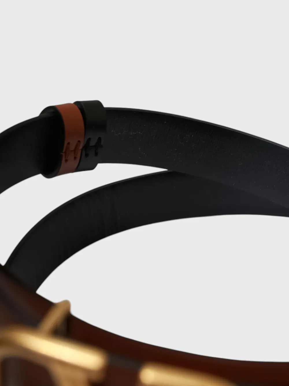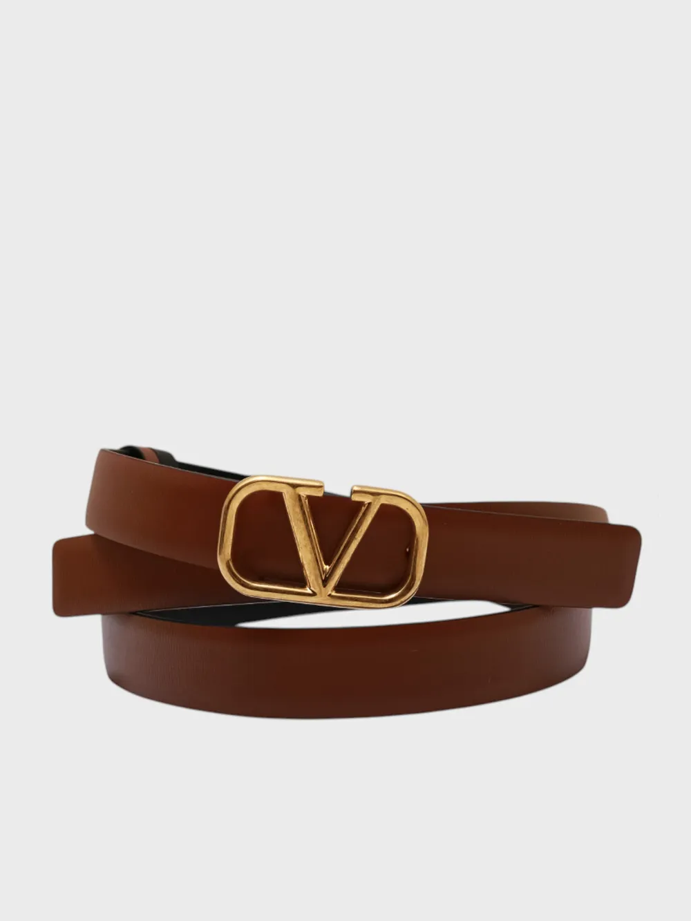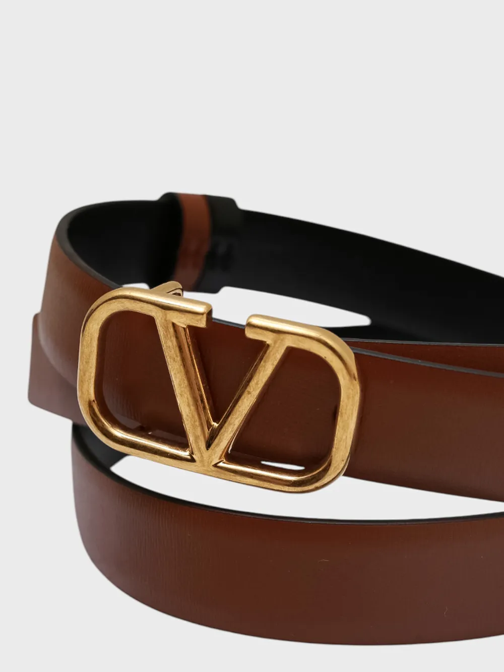 Ремень Valentino выполнен из высококачественной коричневой кожи с глянцевым эффектом. Модель дополнена золотистым металлическим пряжкой с фирменным логотипом бренда, которая придает изделию современный и элегантный вид. Двусторонняя конструкция позволяет менять внешний дизайн — черная или коричневая сторона. Идеальный аксессуар для завершения делового или повседневного образа.