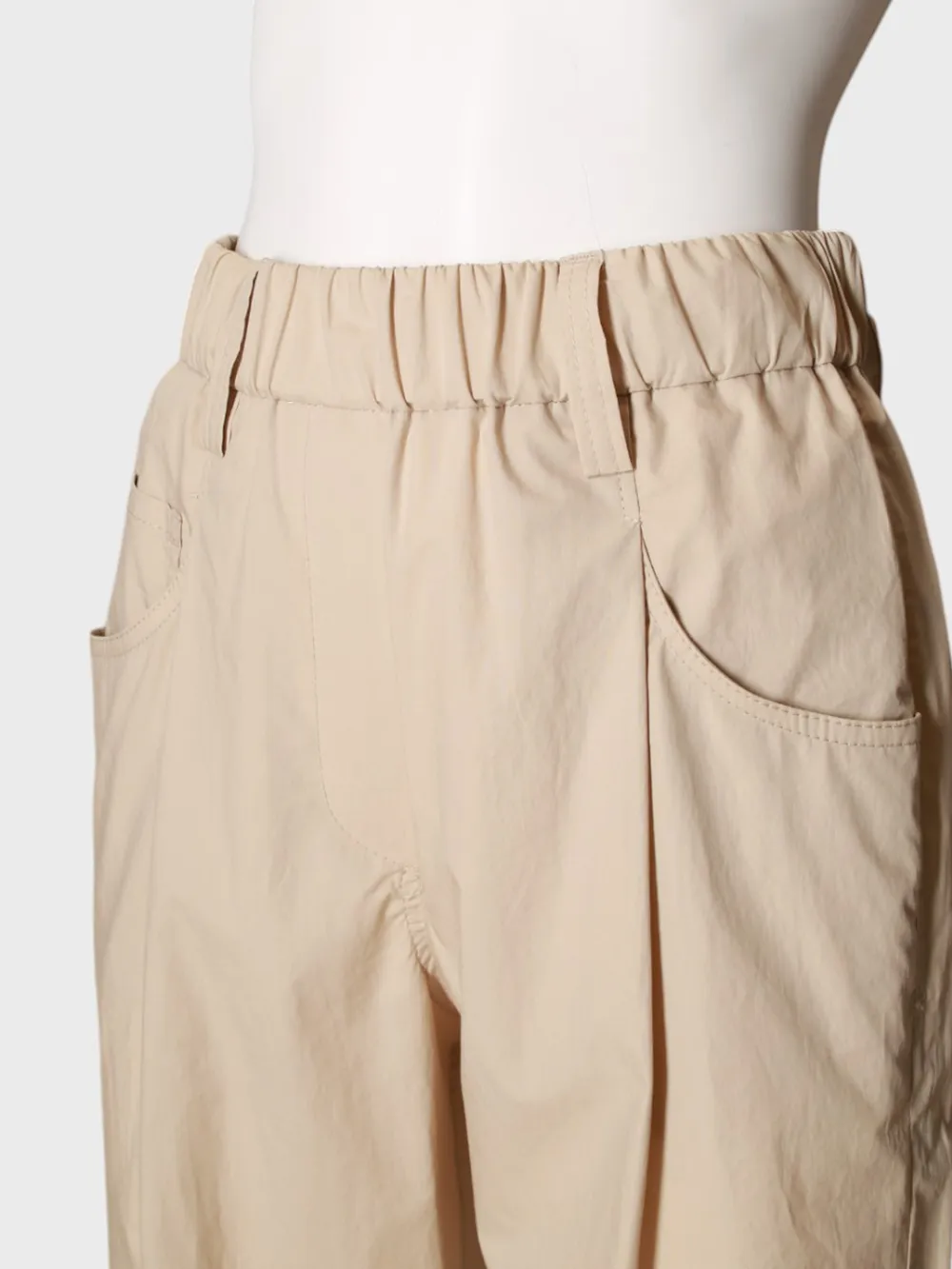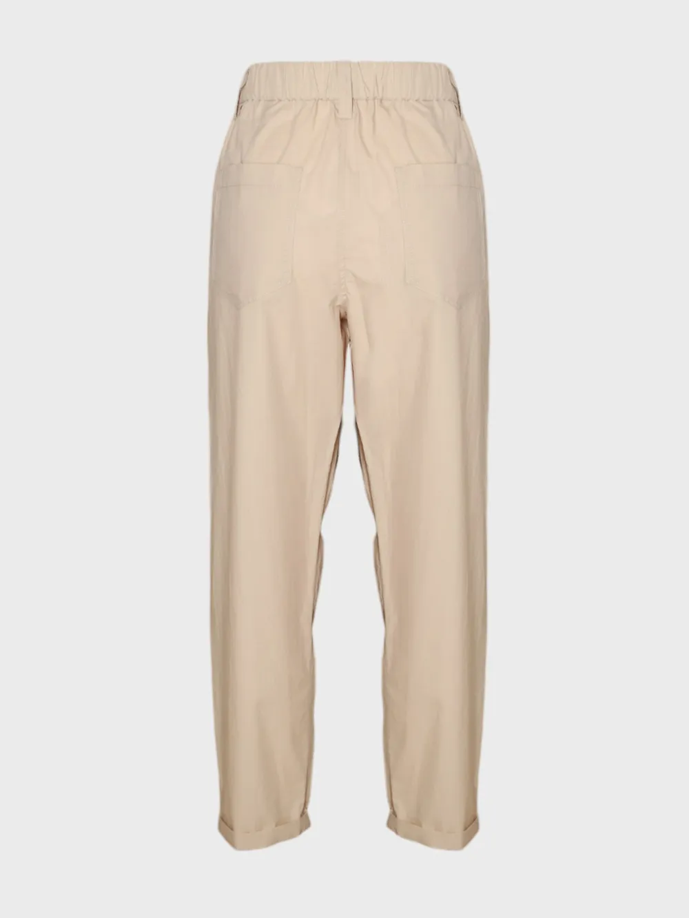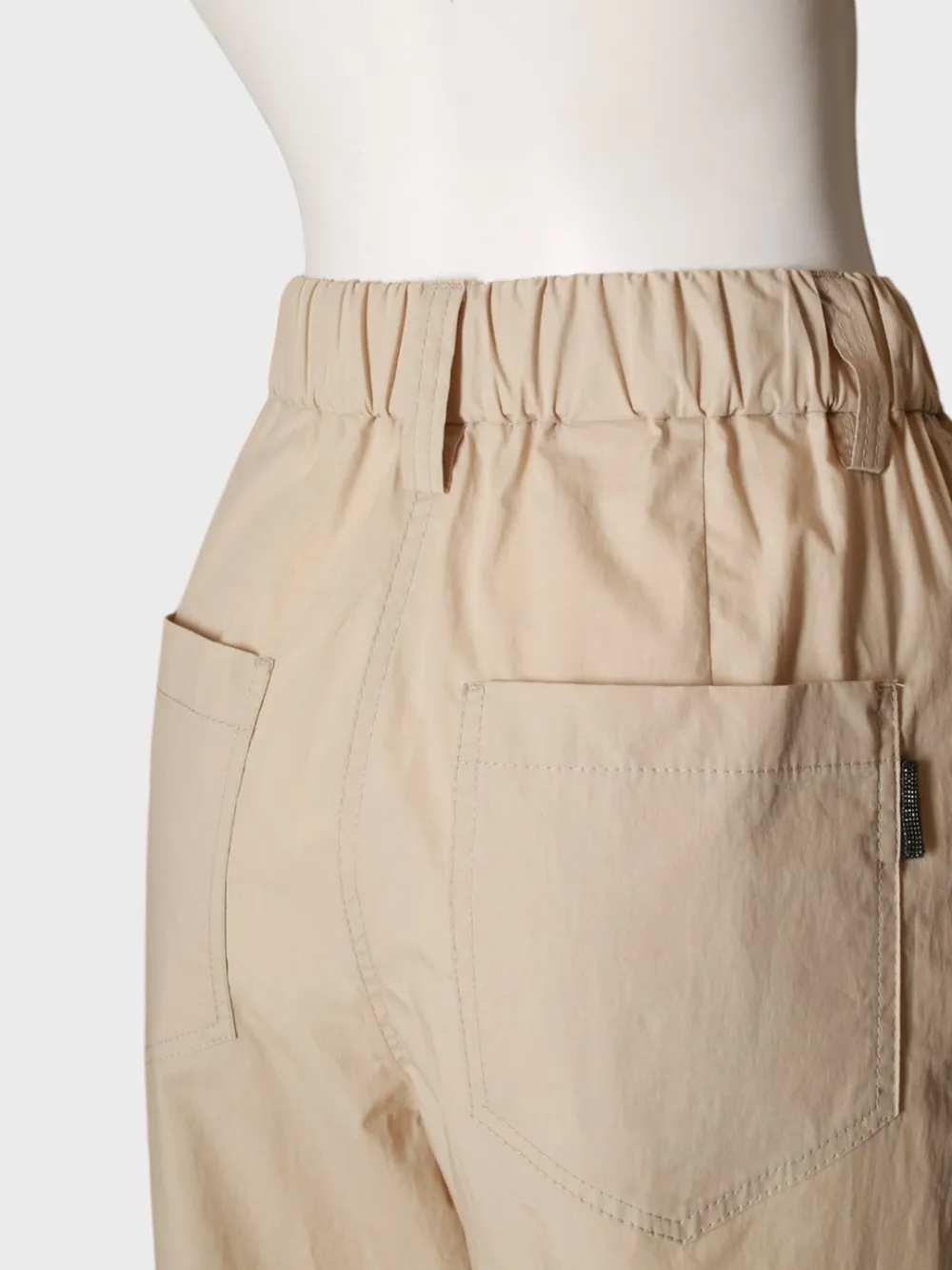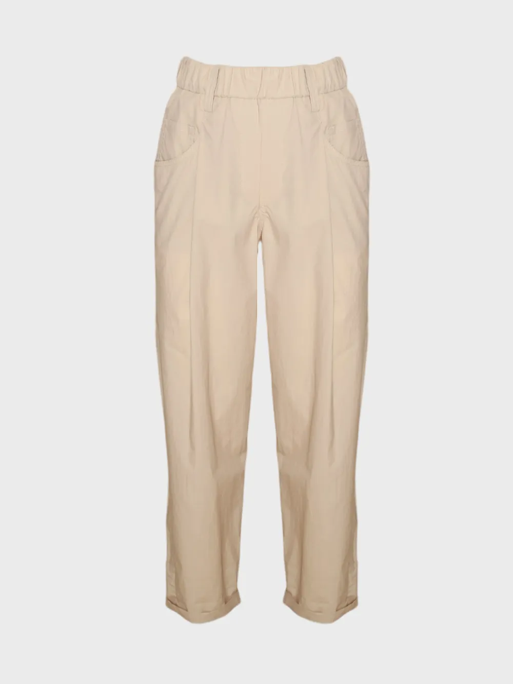 Брюки Brunello Cucinelli выполнены из качественного светло-бежевого материала с классическим кройом. Модель дополнена эластичной талией и несколькими карманами спереди и сзади. Простой дизайн и комфортная посадка делают брюки идеальным выбором для повседневной носки или как базовый элемент в гардеробе.