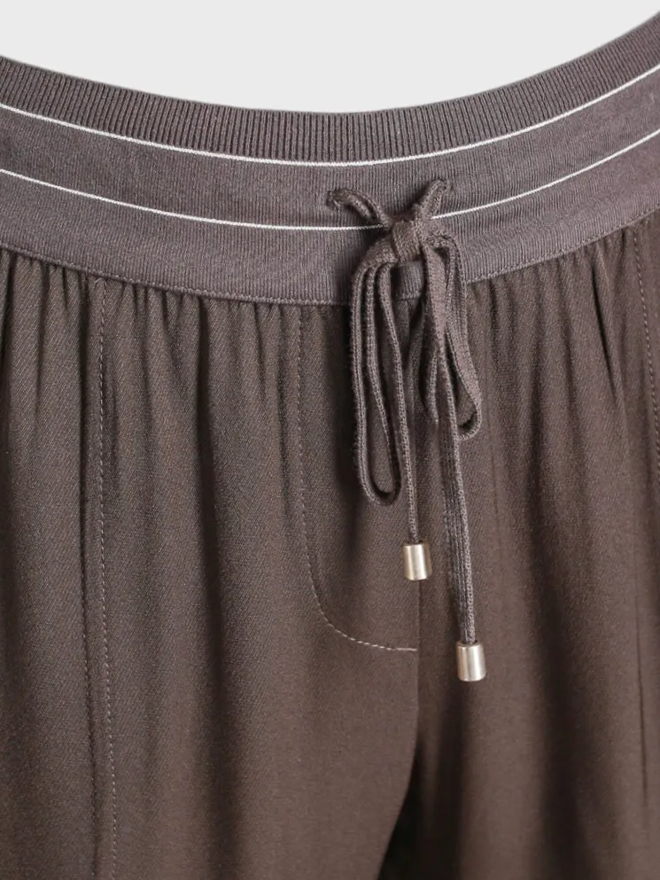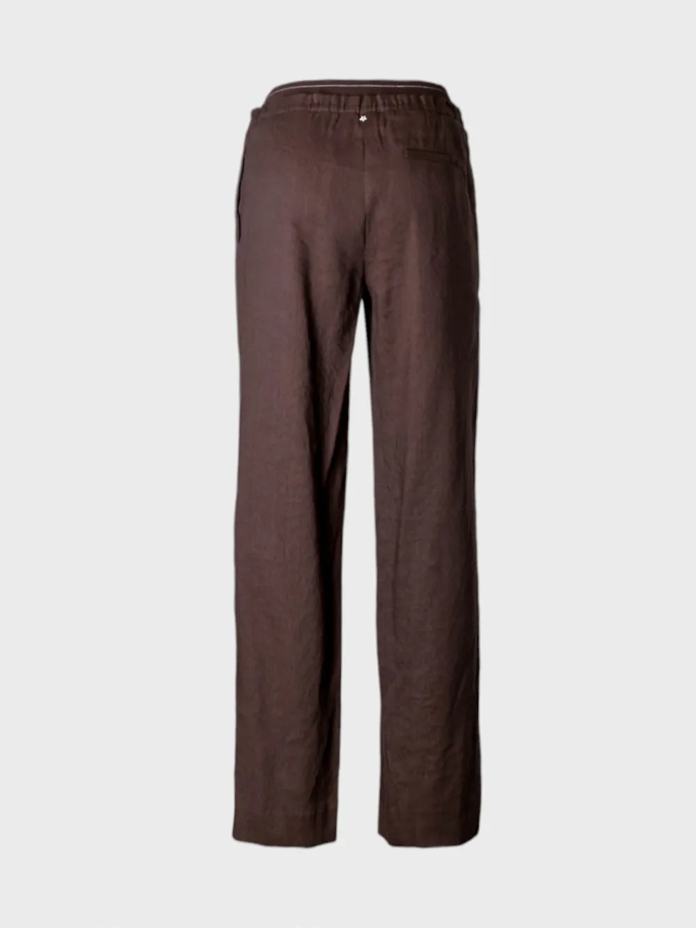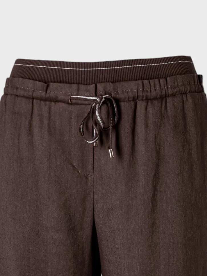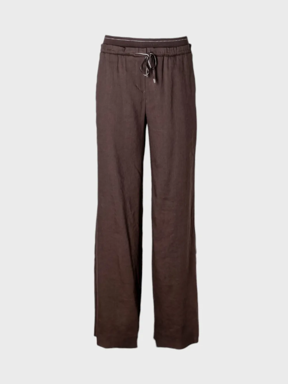 Брюки от бренда Lorena Antoniazzi выполнены из темно-коричневой ткани с легкой текстурой. Модель имеет прямой крой и эластичный пояс с шнурком для регулировки размера. Дизайн простой и функциональный, подчеркивающий комфорт и универсальность. Штаны подходят для повседневной носки или отдыха.