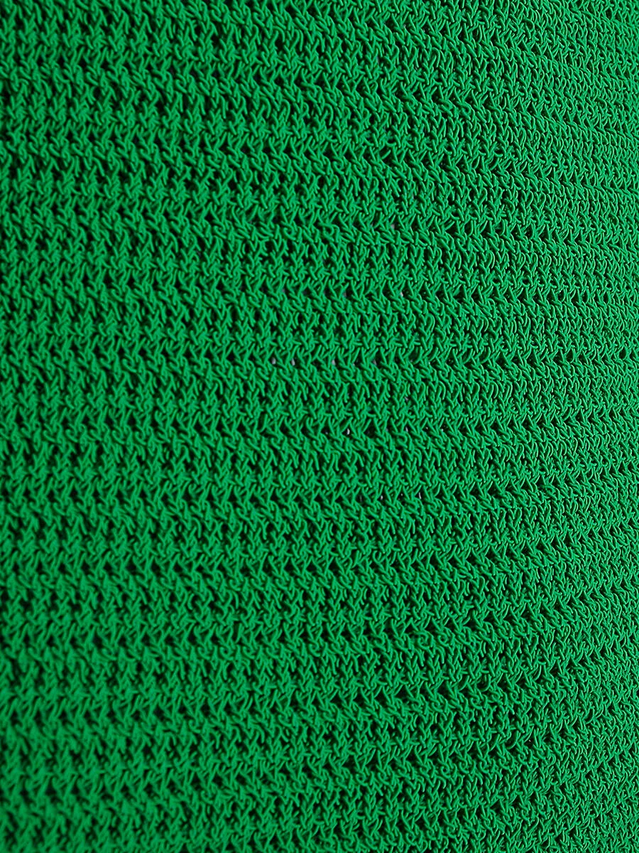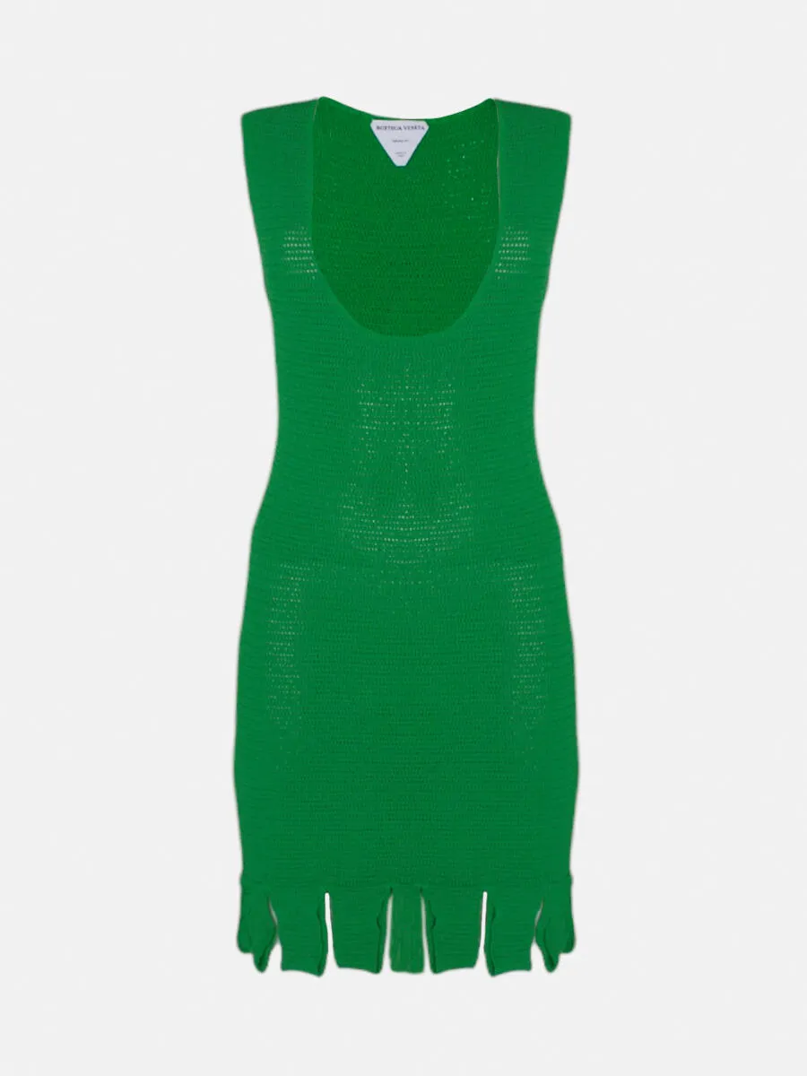 Платье Bottega Veneta выполнено из плотного фактурного трикотажа насыщенного зелёного цвета с характерной перфорацией и асимметричным кроем. Модель без рукавов с округлым вырезом и декоративными разрезами по низу сочетает минимализм и современный дизайн — идеальный выбор для смелых и элегантных образов в духе итальянской роскоши.