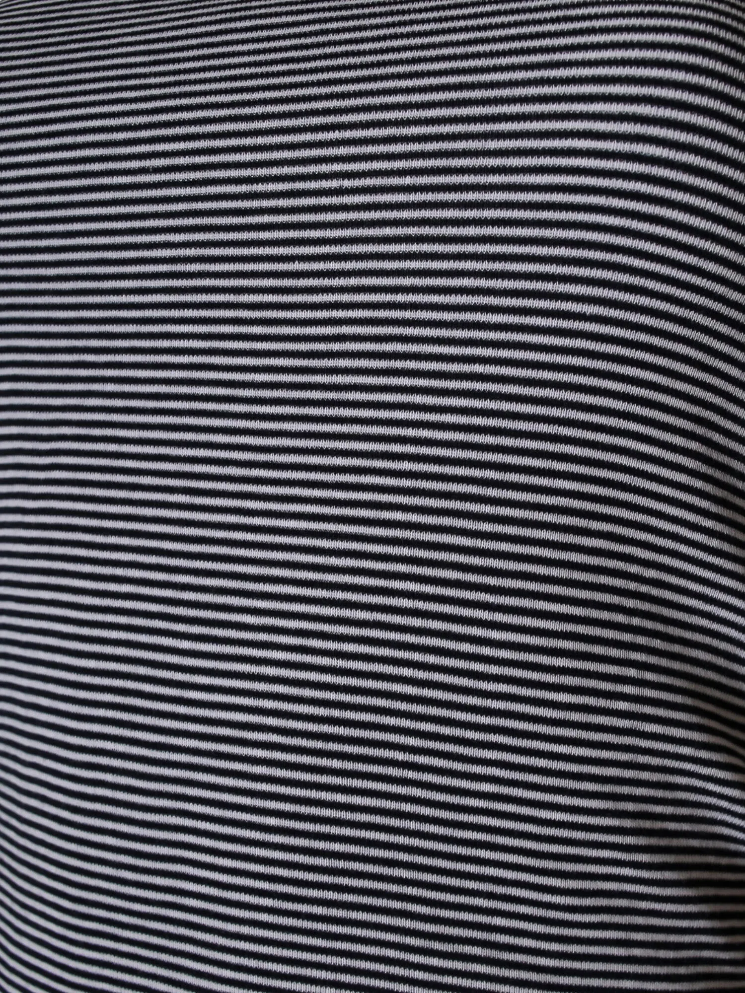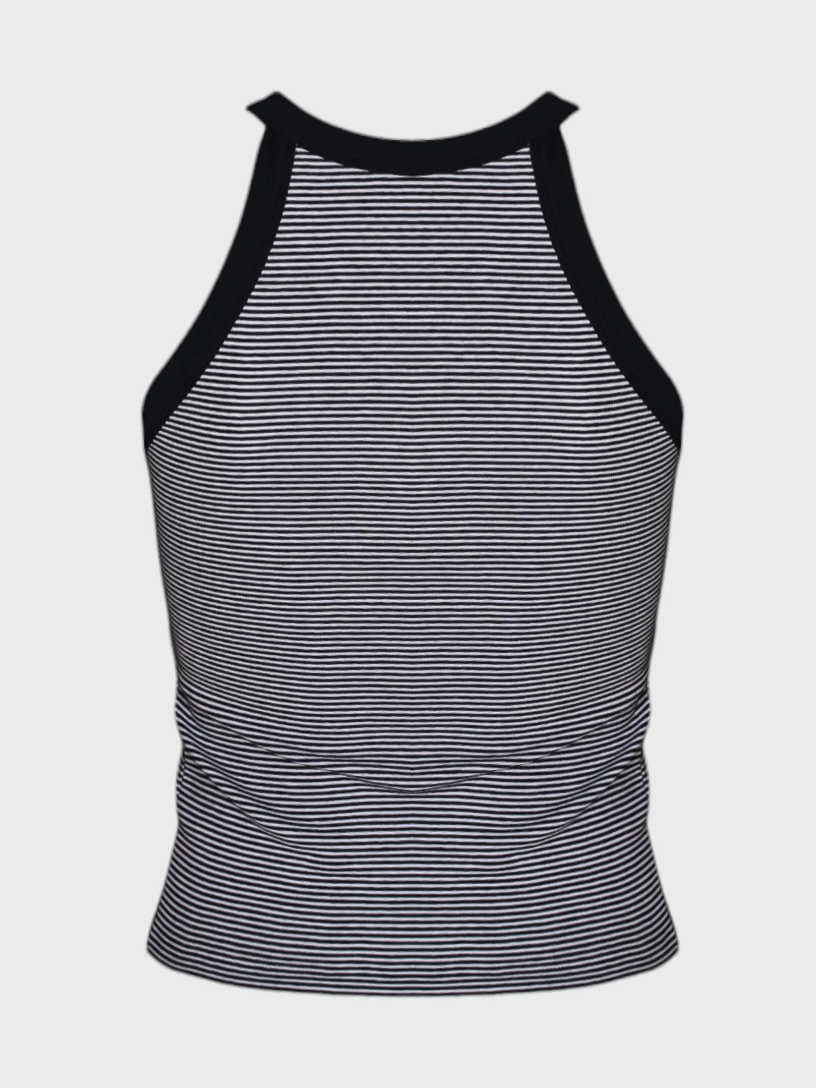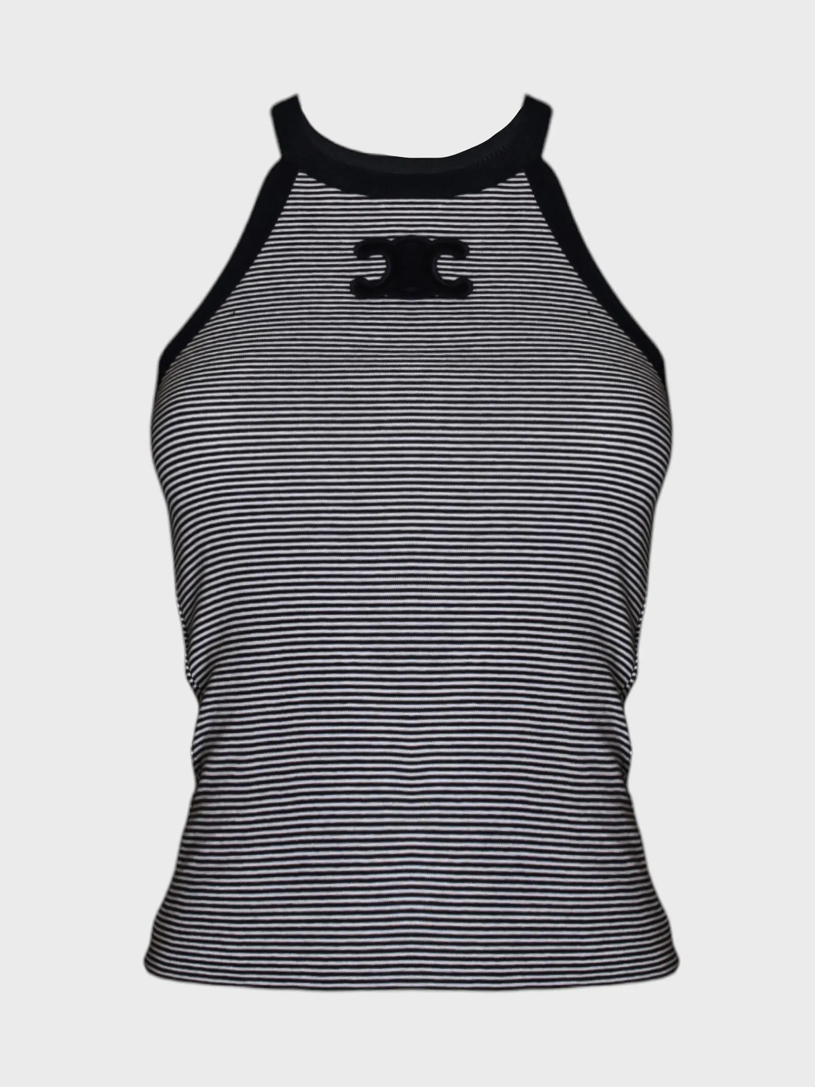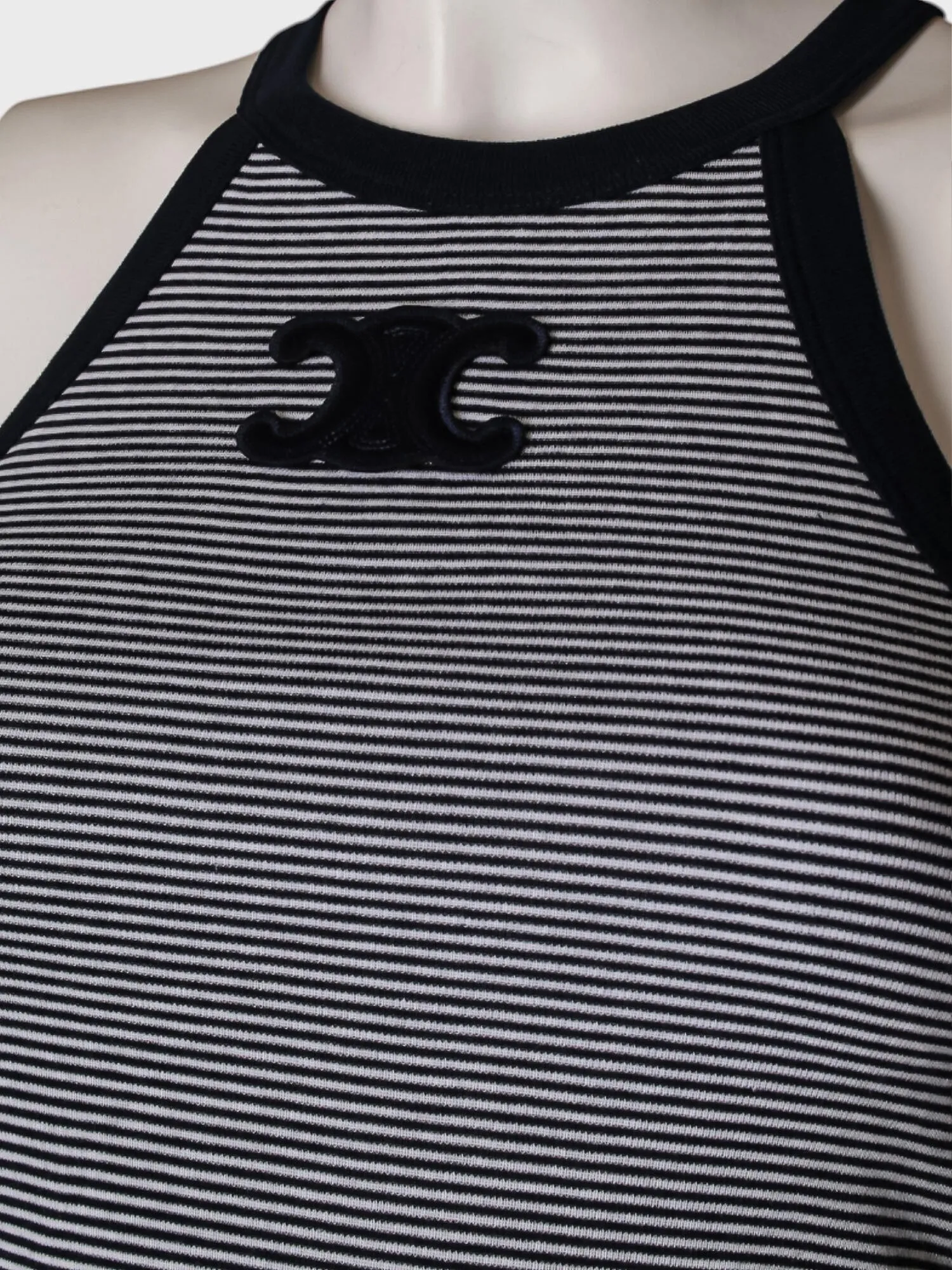Майка Celine выполнена из качественного эластичного материала в черно-белую полоску. Модель с высоким горлом и без рукавов дополнена контрастным логотипом бренда на груди, что придает ей современный и стильный вид. Прямой крой и комфортная посадка обеспечивают удобство носки. Идеально подходит для создания модных повседневных образов.