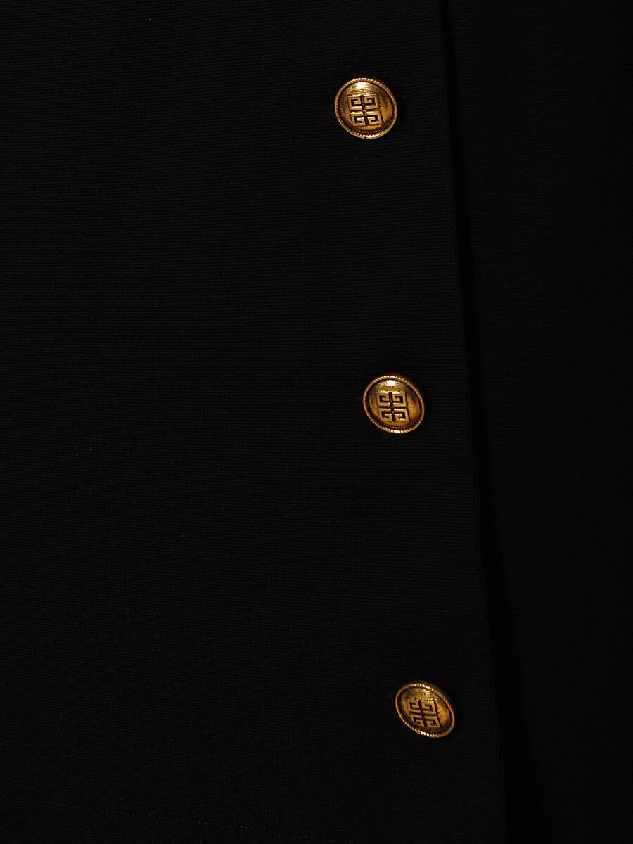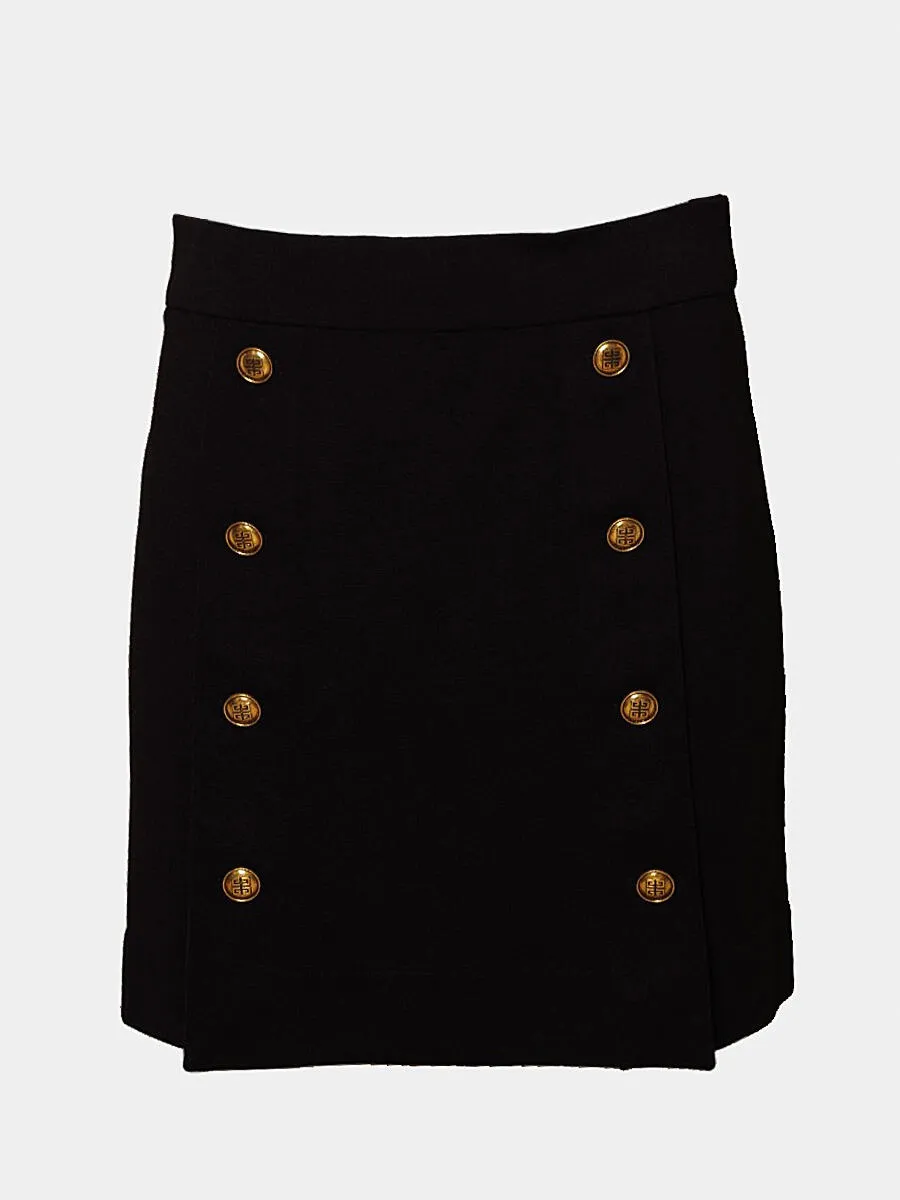 Юбка Givenchy выполнена из плотной черной ткани с четкой посадкой и строгим силуэтом. Модель дополнена декоративными золотыми пуговицами с фирменным логотипом бренда, расположенными вдоль центральной застежки, что придает изделию характерный военно-морской стиль. Прямой крой и высокая посадка создают эффектную пропорцию фигуры — универсальный вариант для делового или вечернего образа. Ткань: 86% вискоза 10% полиамид 4% эластан Подкладка: 59% вискоза 40% хлопок 1% полиэстер Откройте для себя Givenchy — французскую элегантность в её самой смелой форме. Бренд сочетает аристократическую строгость, авангардный дизайн и глубокую индивидуальность. От культовых пальто с графичными плечами до минималистичных топов и фирменных аксессуаров — каждое изделие дышит роскошью, сдержанностью и внутренней силой. Идеально для тех, кто ценит чистые линии, хай-фешн эстетику и стиль, который не кричит, а заявляет. Givenchy — шик как оружие.