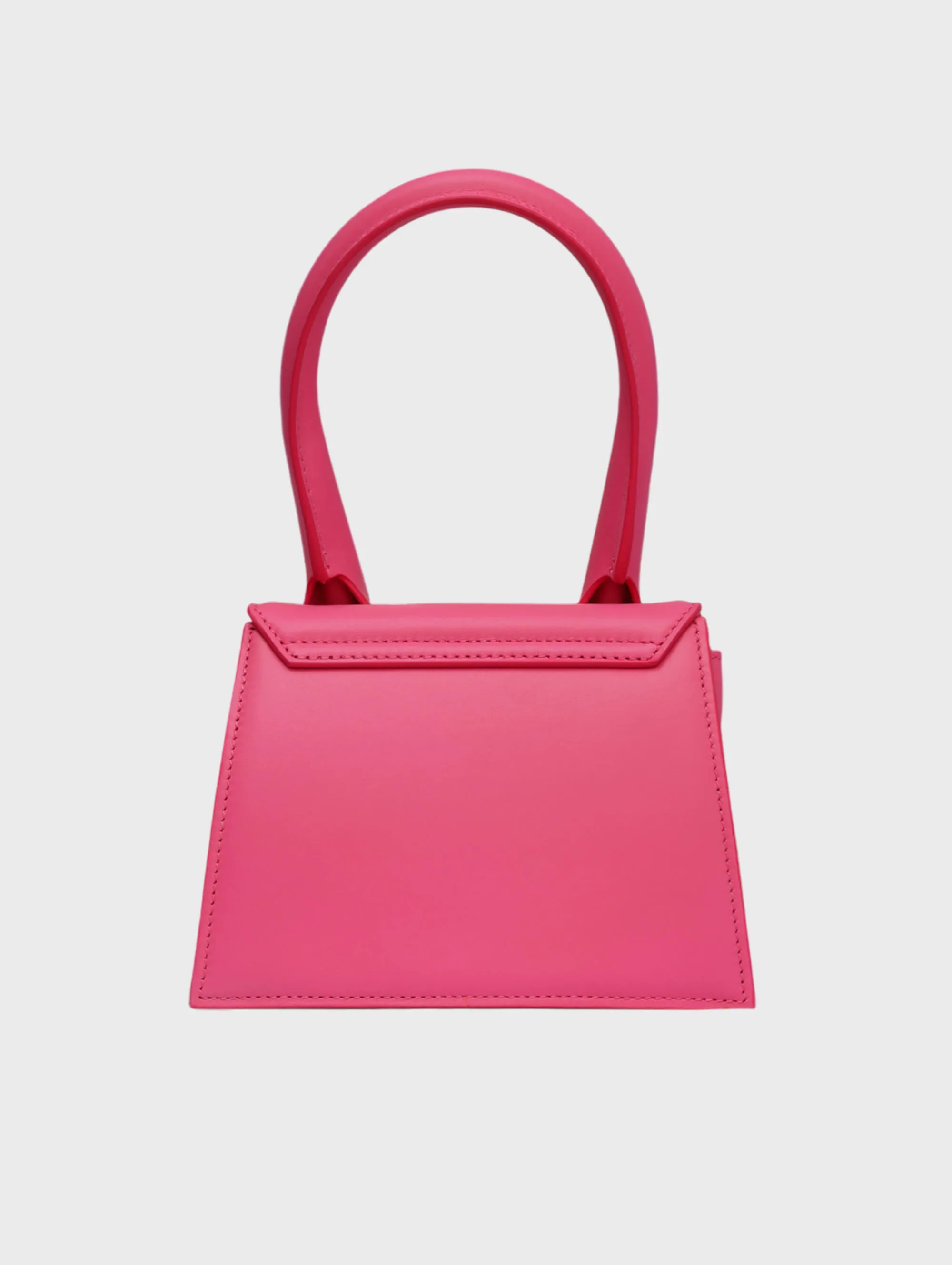 Ярко-розовая миниатюрная сумка Jacquemus из гладкой кожи с округлыми ручками и контрастной застёжкой на магните. Прямоугольный силуэт с закруглёнными углами и фирменным логотипом «Jacquemus» из золотистого металла сочетает смелый колорит и минималистичный дизайн. Эксклюзивный аксессуар для тех, кто ценит современный шик и нестандартные решения.