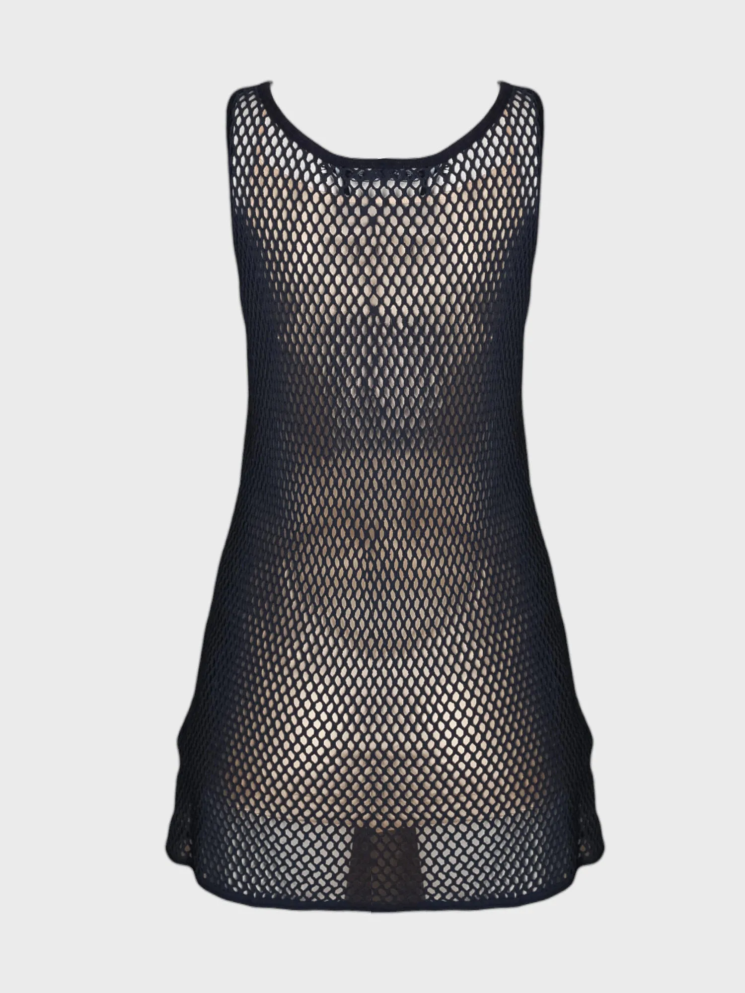Майка Prada выполнена из темно-синего сетчатого материала с округлым вырезом. Модель дополнена металлическим треугольным логотипом бренда на груди, который добавляет современный и стильный акцент. Прямой крой и комфортная посадка обеспечивают удобство носки. Идеально подходит для создания летних образов или вечерних луков, сочетая элегантность и модные тенденции.