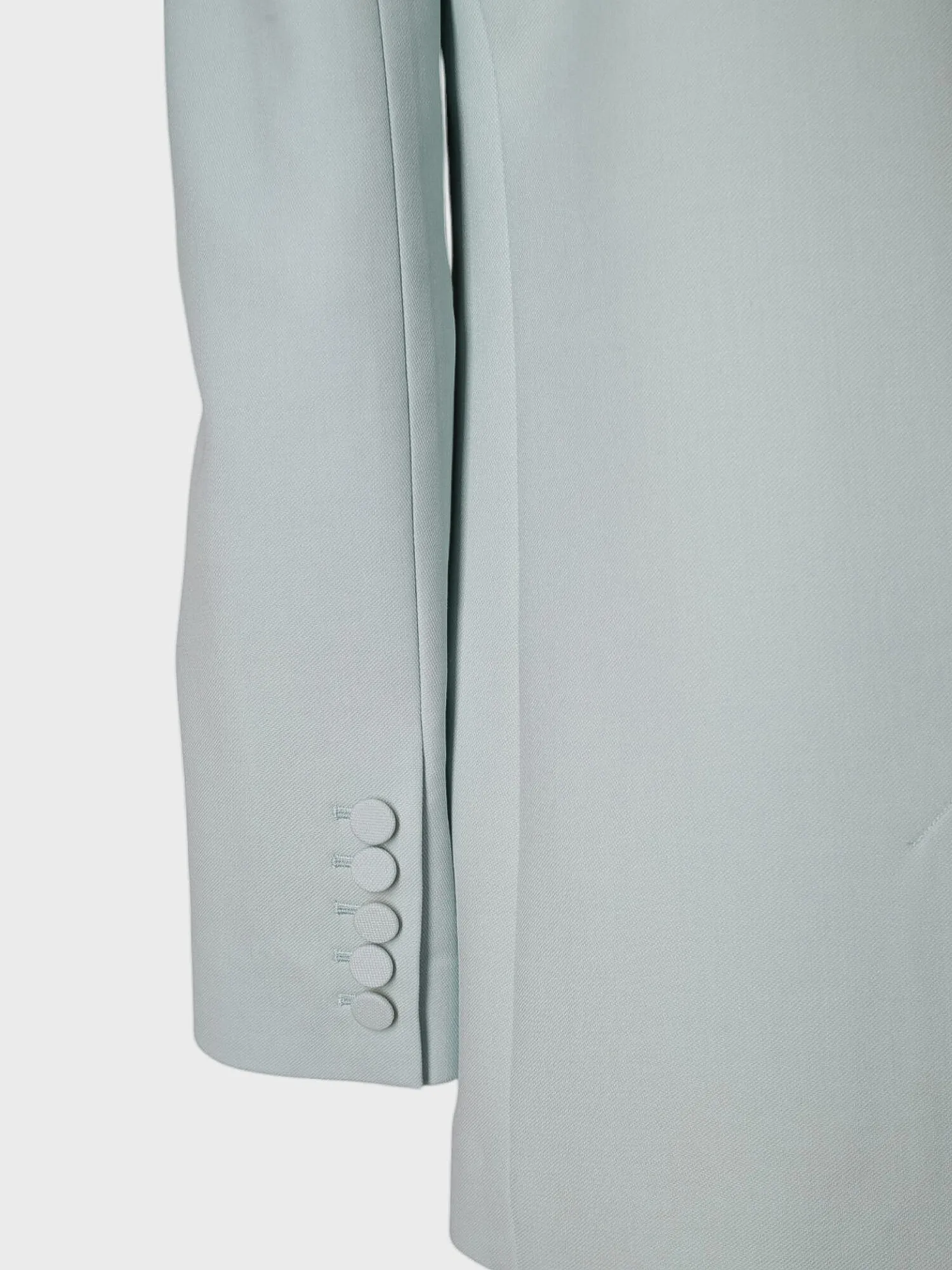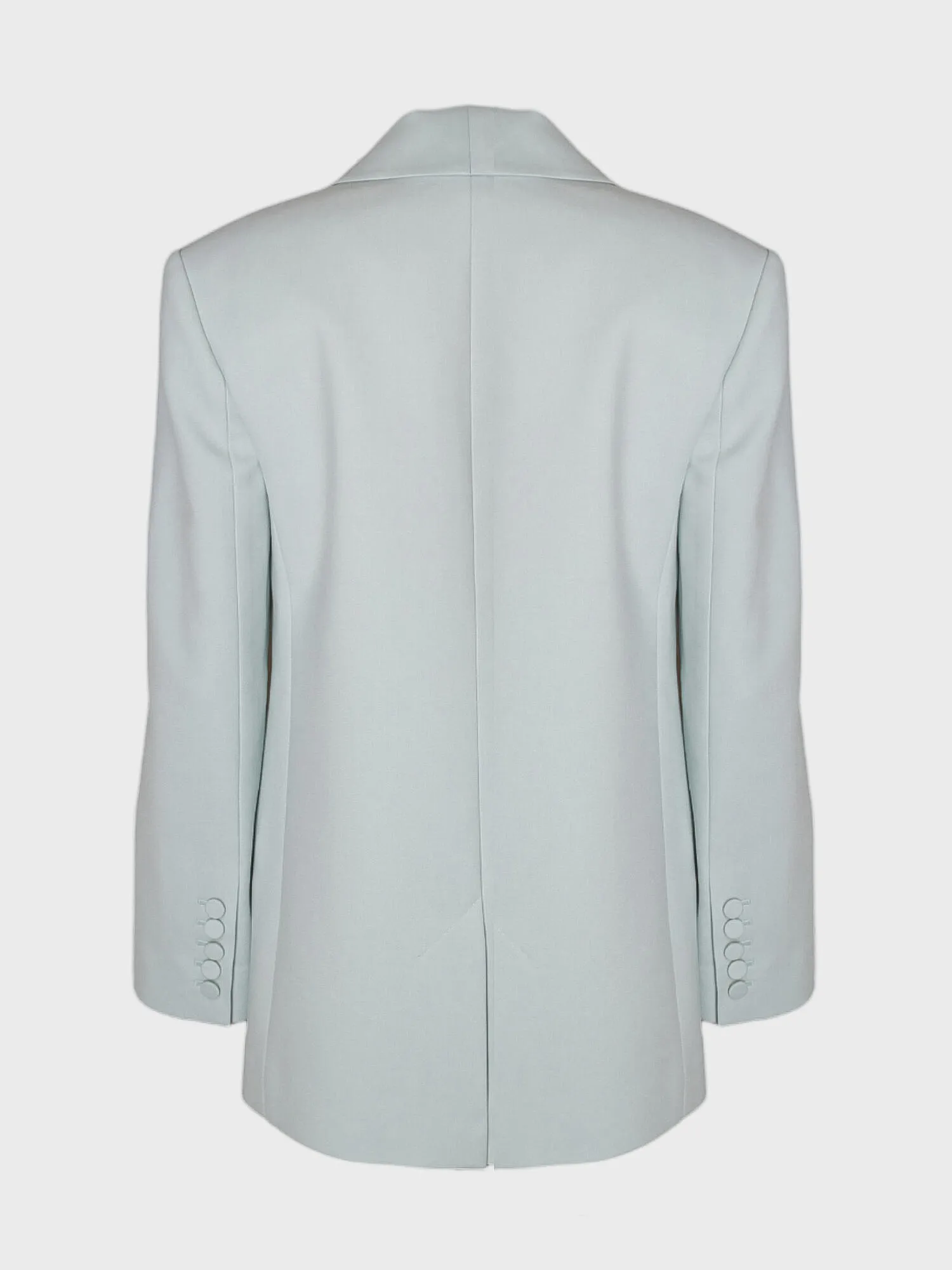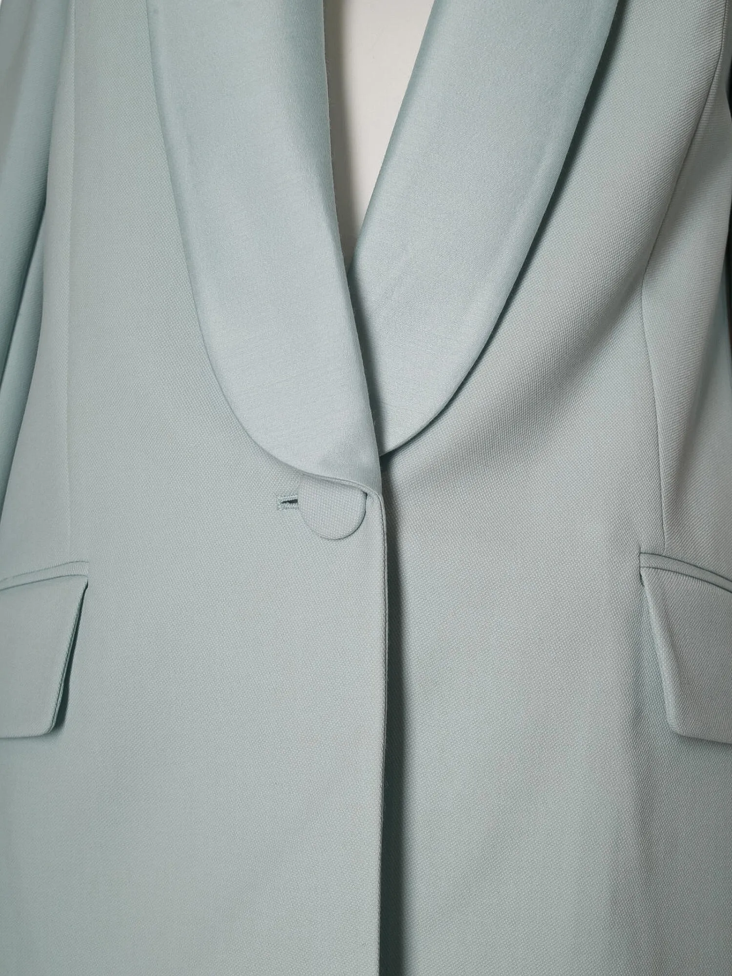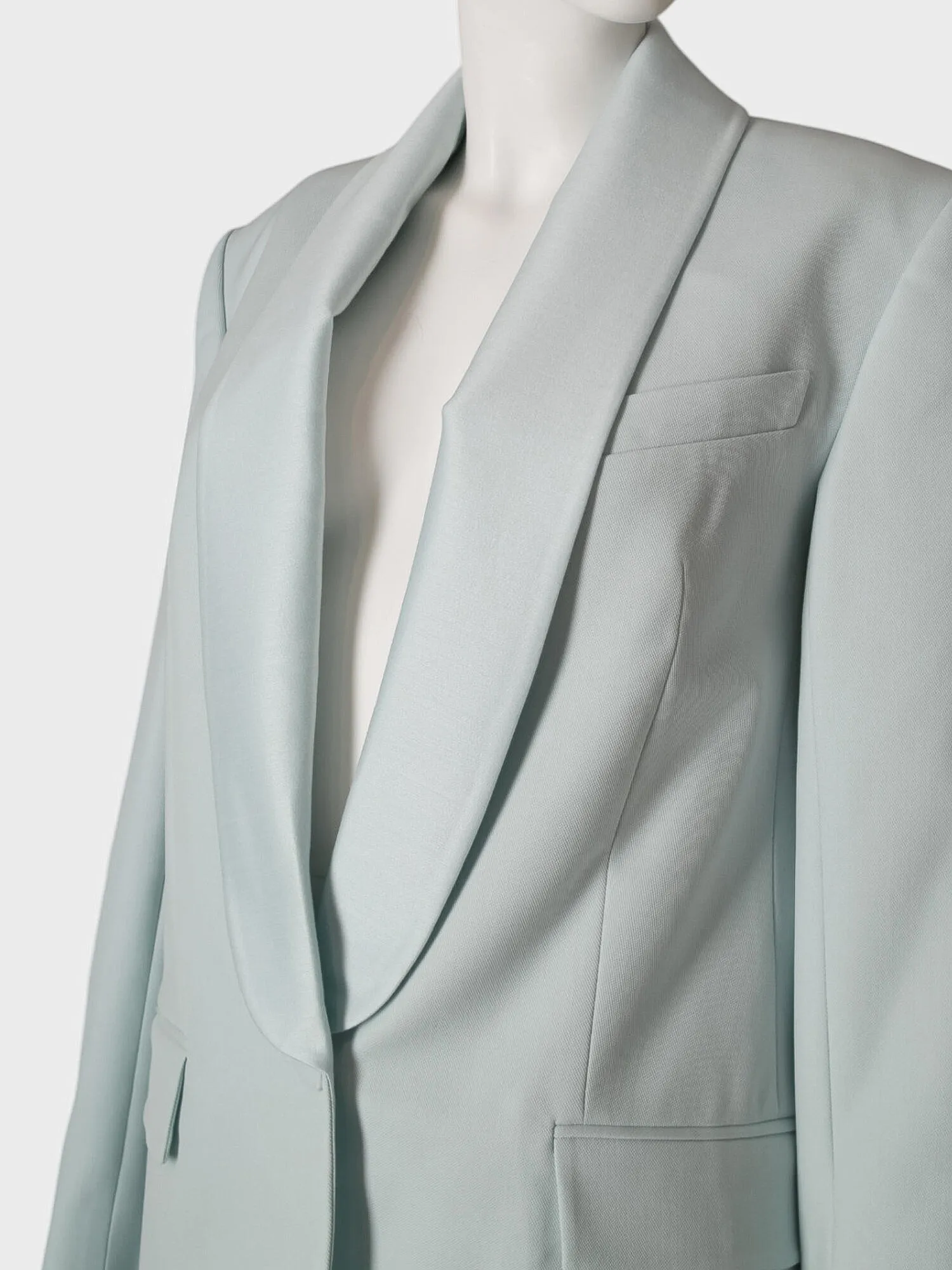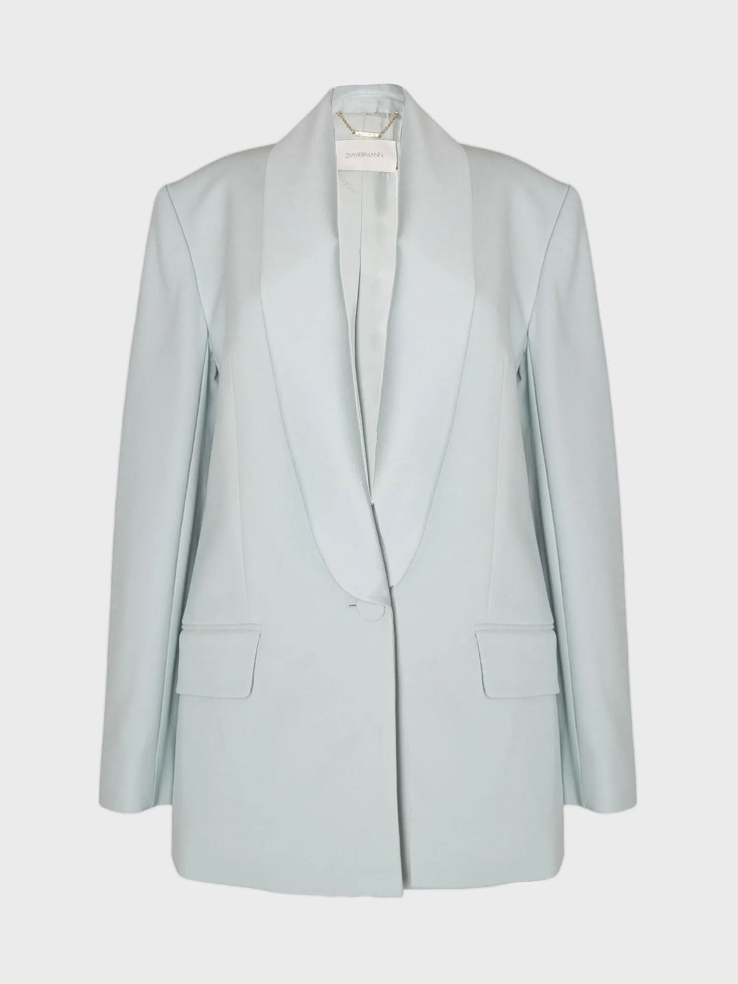 Пиджак Zimmermann выполнен из гладкой структурной ткани нежно-голубого оттенка, сочетает широкие лацканы, приталенный крой и минималистичный дизайн без пуговиц — элегантное и современное изделие для деловых и вечерних образов.