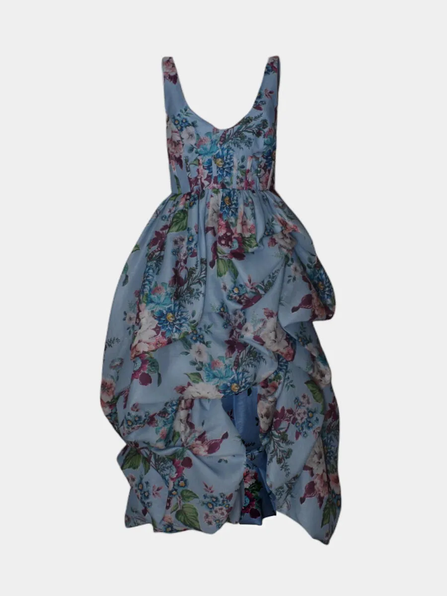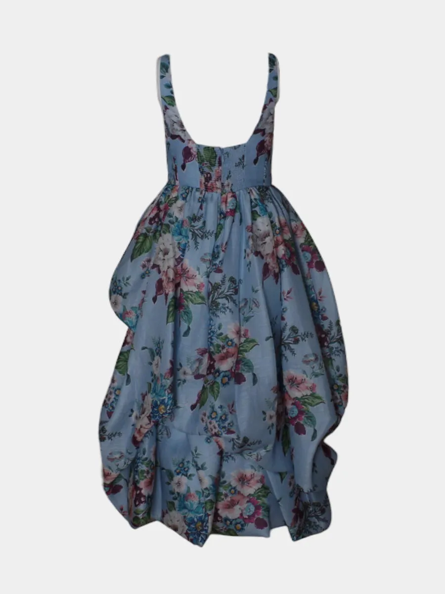 Платье Zimmermann из легкой ткани с нежным голубым фоном и насыщенным цветочным принтом — сочетание романтики и современного кроя. Модель с открытыми плечами, глубоким V-образным вырезом и асимметричной юбкой с драпировками создает эффект объема и движения. Утонченный силуэт подчеркивает женственность, а качественная отделка и текстура ткани подтверждают высокий уровень исполнения. Идеальный выбор для летних мероприятий и образов, где важна индивидуальность и стиль.