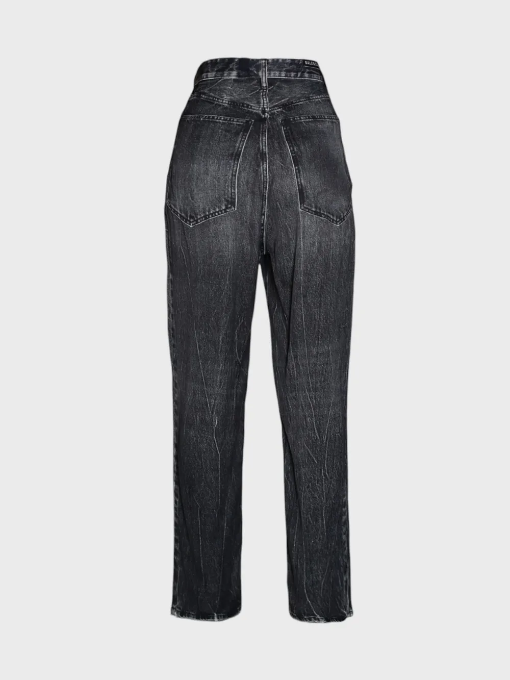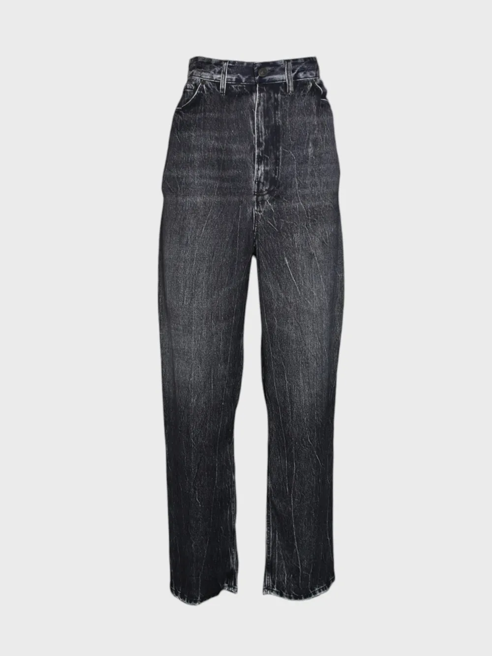Джинсы Balenciaga выполнены из темно-синей денимовой ткани с эффектом потертости, что придает им роскошный и современный вид. Модель является широкими брюками прямого кроя с высокой посадкой, которые идеально подходят для создания модного и стильного образа. Брюки имеют классическую застежку на пуговицу и молнию спереди, а также стандартные карманы на передней и задней части. Детали, такие как контрастные швы и логотип бренда на внутренней стороне пояса, подчеркивают качество исполнения. Эти брюки сочетают в себе комфорт и модный дизайн, подходящий для повседневной носки или вечерних мероприятий.