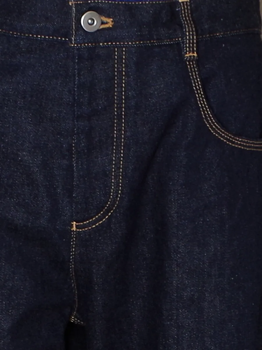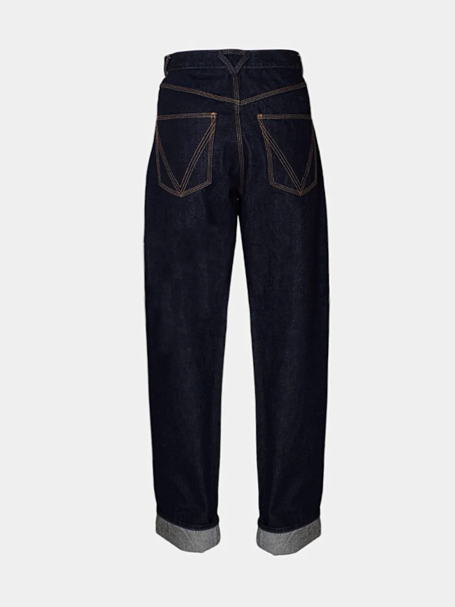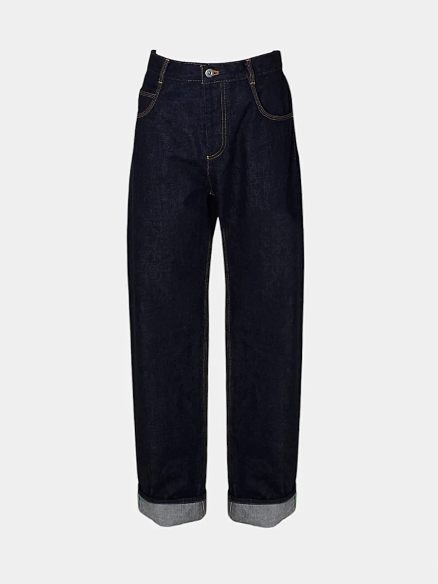 Джинсы Bottega Veneta выполнены из плотного тёмно-синего денима с прямым кроем и высокой посадкой; контрастная строчка, классические карманы и отвороты на низу штанин с зелёной окантовкой придают изделию современный акцент — стильный элемент повседневного образа.