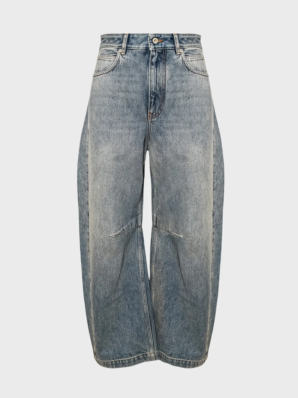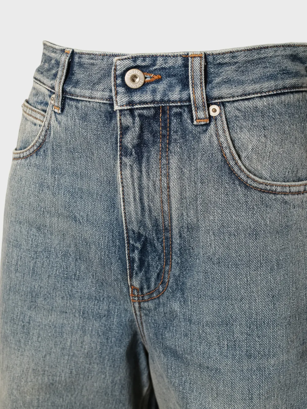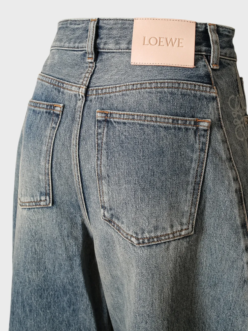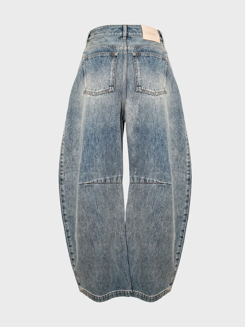 Джинсы выполнены из качественного денима средней плотности с эффектом потертости, что придает им современный и стильный вид. Дизайн лаконичный и универсальный, акцентирован брендовым логотипом "LOEWE" на заднем кармане. Модель оснащена высокой посадкой, широкими брючинами и классической застежкой на пуговицу. Прочный материал и качественная отделка гарантируют долговечность и комфортную носку. Идеально подходит для повседневной носки или как базовый элемент гардероба.