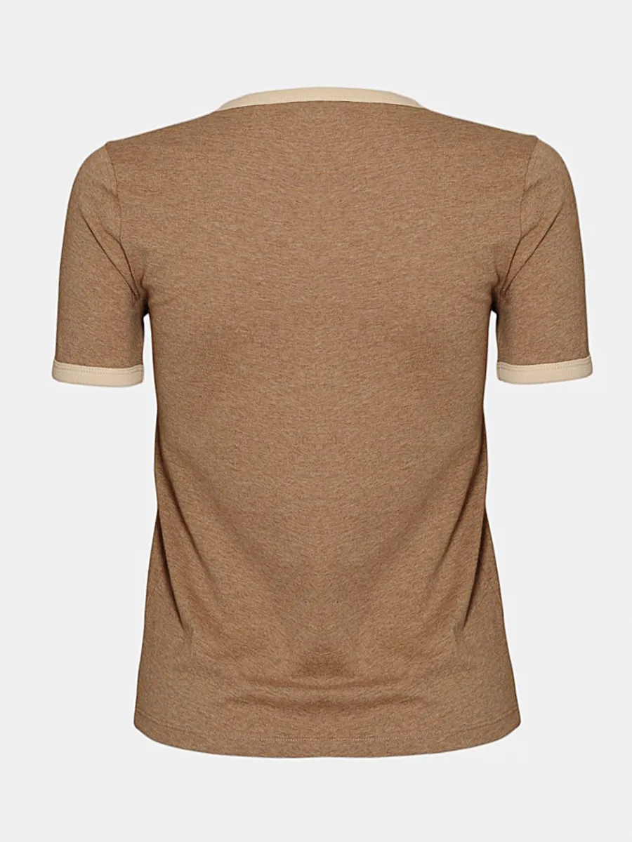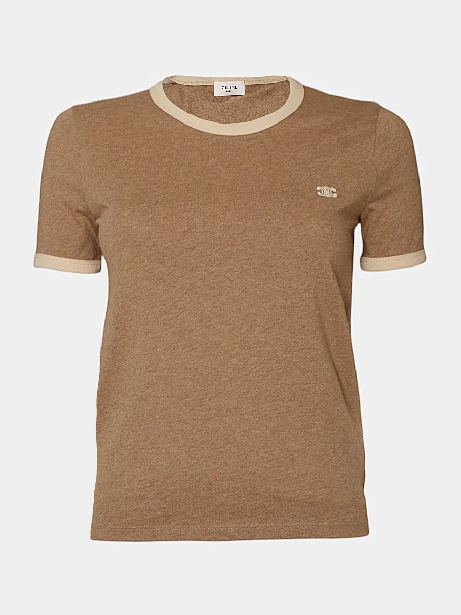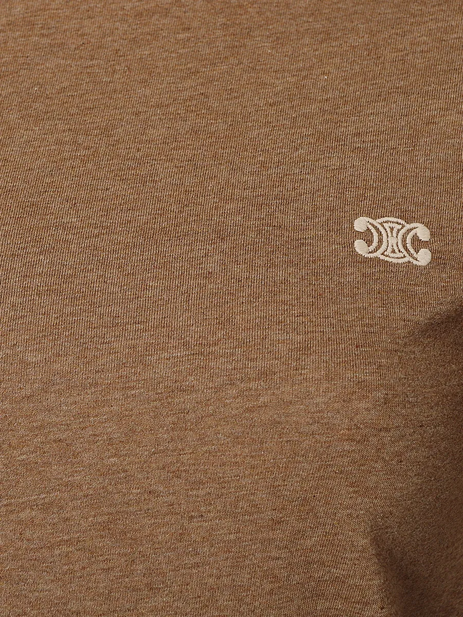 Футболка Celine выполнена из хлопковой ткани коричневого оттенка с контрастной окантовкой по воротнику и манжетам, сочетает минимализм и утончённый стиль. Модель с круглым вырезом и небольшим вышитым логотипом на груди подчеркивает качество исполнения — идеальный элемент для повседневных образов в духе парижской элегантности.