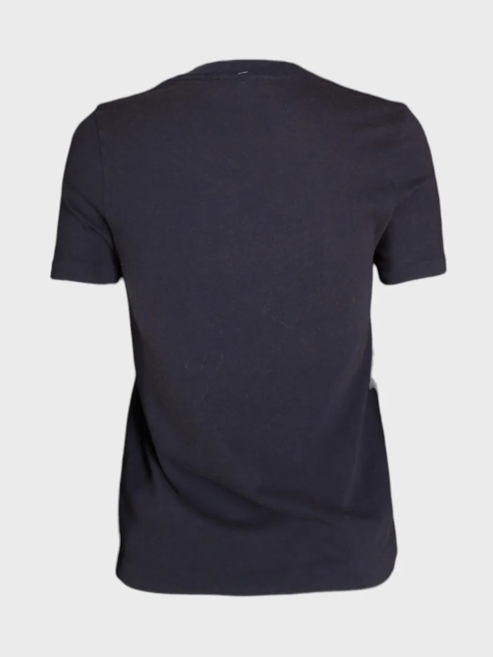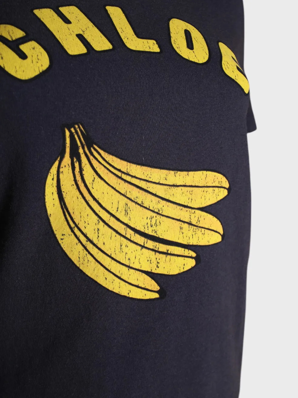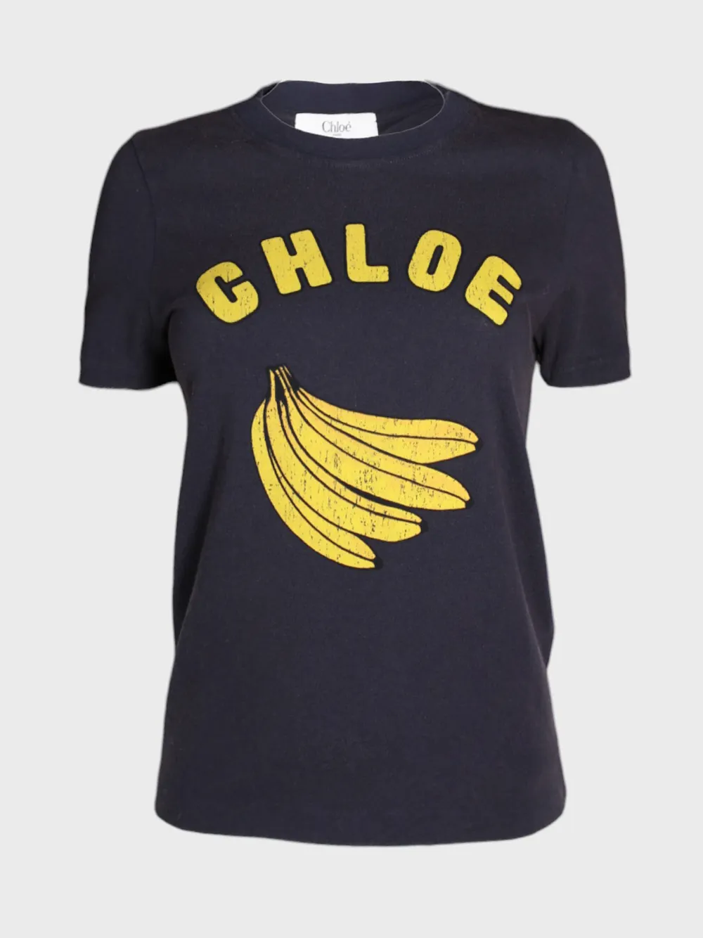 Футболка Chloé выполнена из темно-синей ткани с оригинальным принтом. Модель имеет классический крой с короткими рукавами и круглым вырезом, дополненным крупным логотипом бренда "Chloé" в желтых буквах и изображением банана. Дизайн сочетает минимализм и современный стиль, идеально подходя для повседневной носки или создания модного образа.