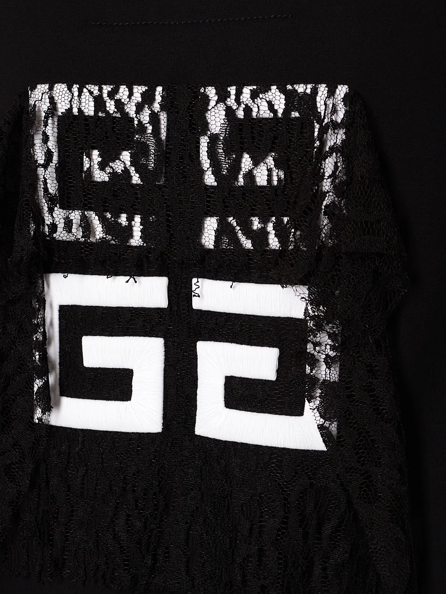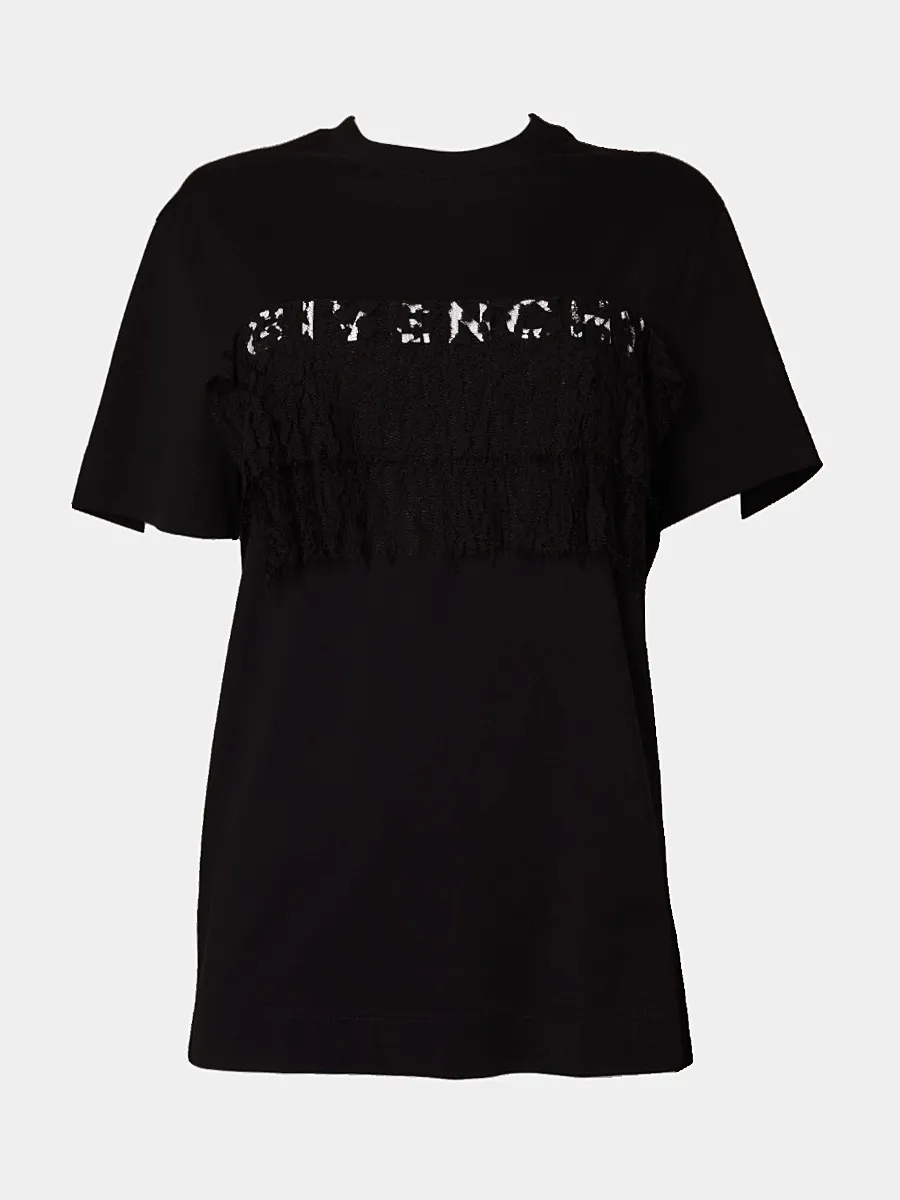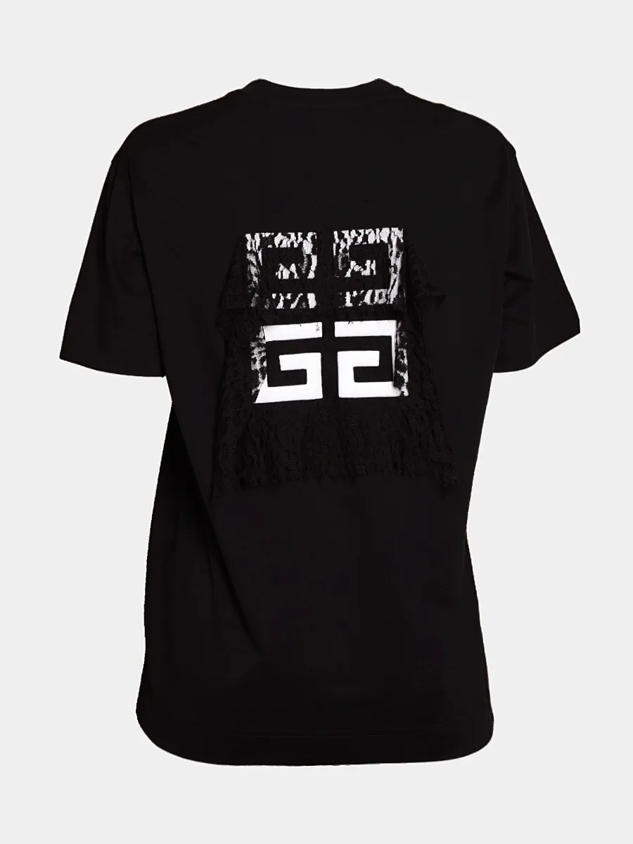 Футболка Givenchy выполнена из черного хлопка с контрастным белым логотипом бренда, вышитым на гипюровой вставке. Модель прямого кроя с короткими рукавами и круглым вырезом декольте создает современный и стильный образ. Особое внимание привлекают тонкие кружевные детали и небольшие оборки по нижней части вставки, добавляющие текстуру и оригинальность дизайну. Идеально для повседневной носки или как базовый элемент модного образа.