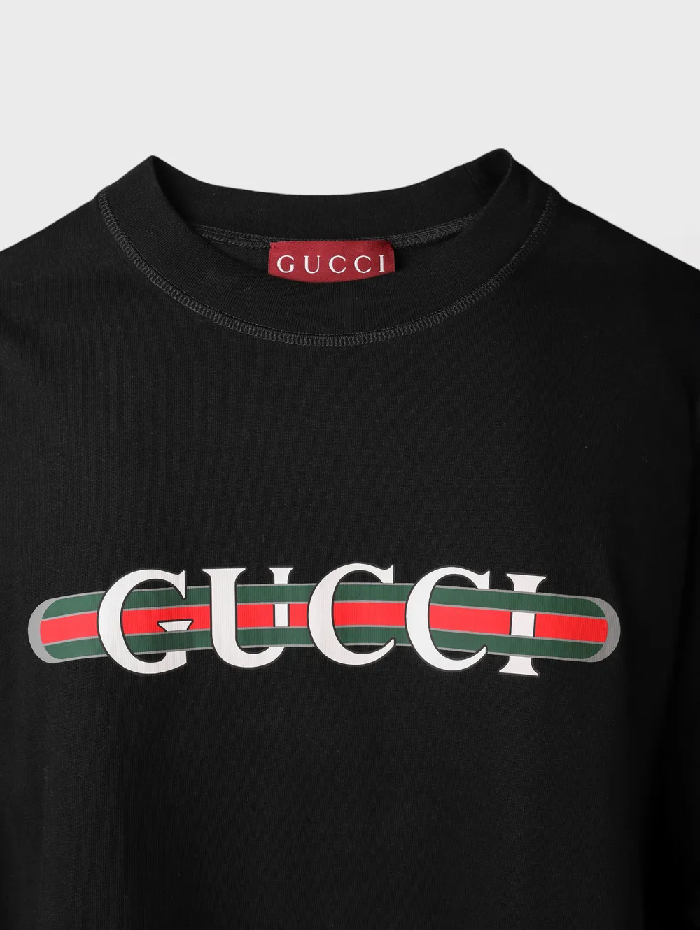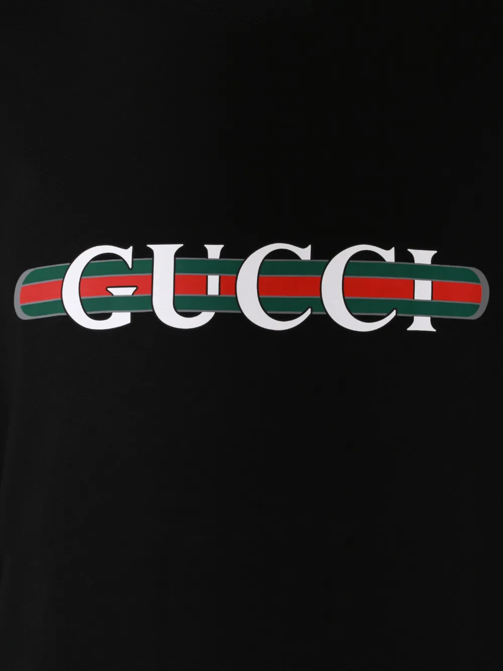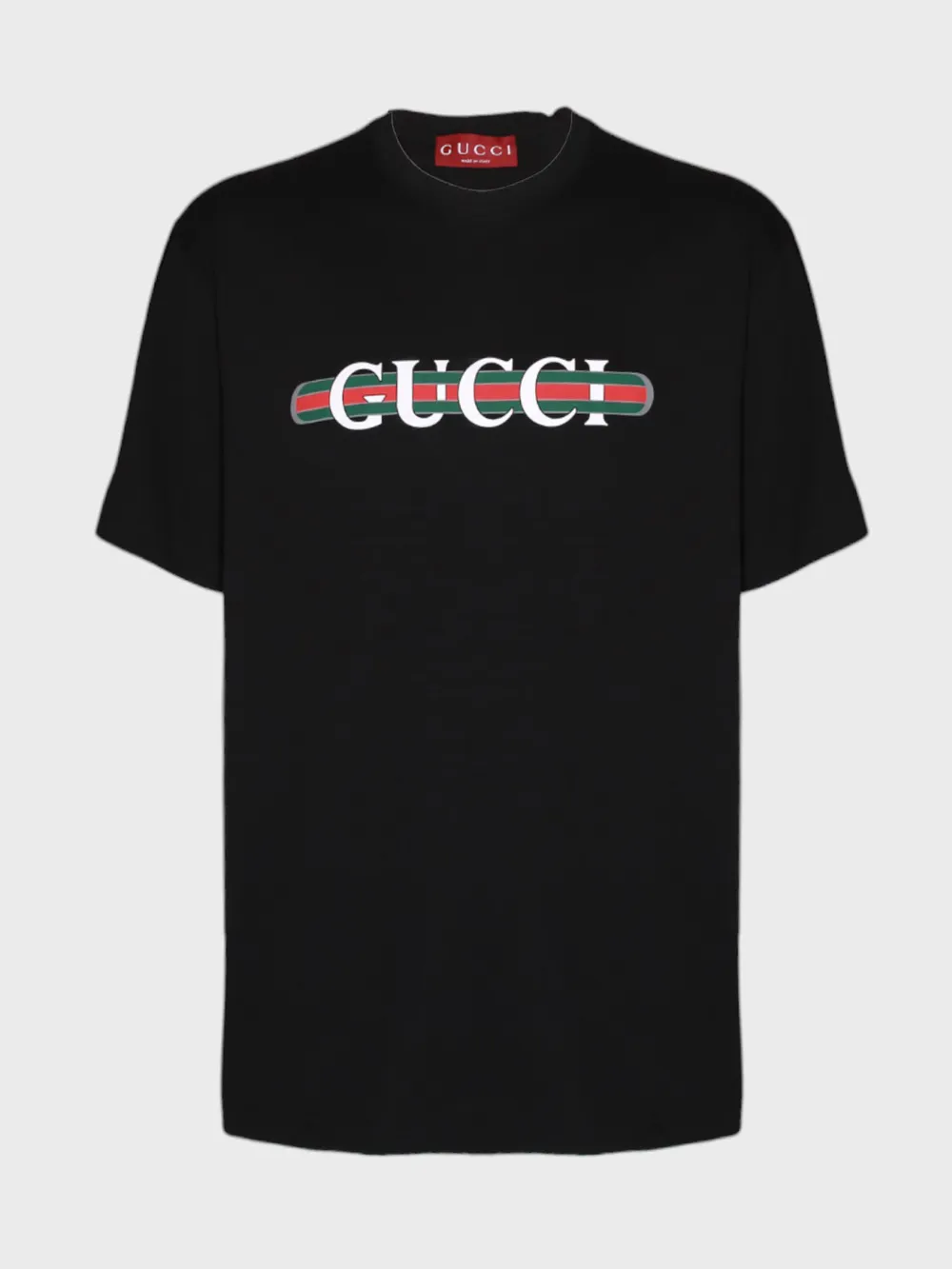 Черная футболка Gucci, выполненная из мягкого и комфортного материала. Модель дополнена крупным белым логотипом бренда "GUCCI", который выделяется контрастными красно-зелеными полосами — узнаваемым элементом дизайна марки. Простой силуэт идеально сочетается как с повседневными, так и с более спортивными образами, подчеркивая безупречный вкус владельца.