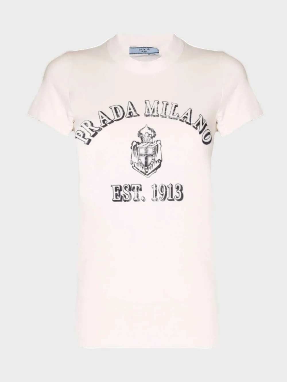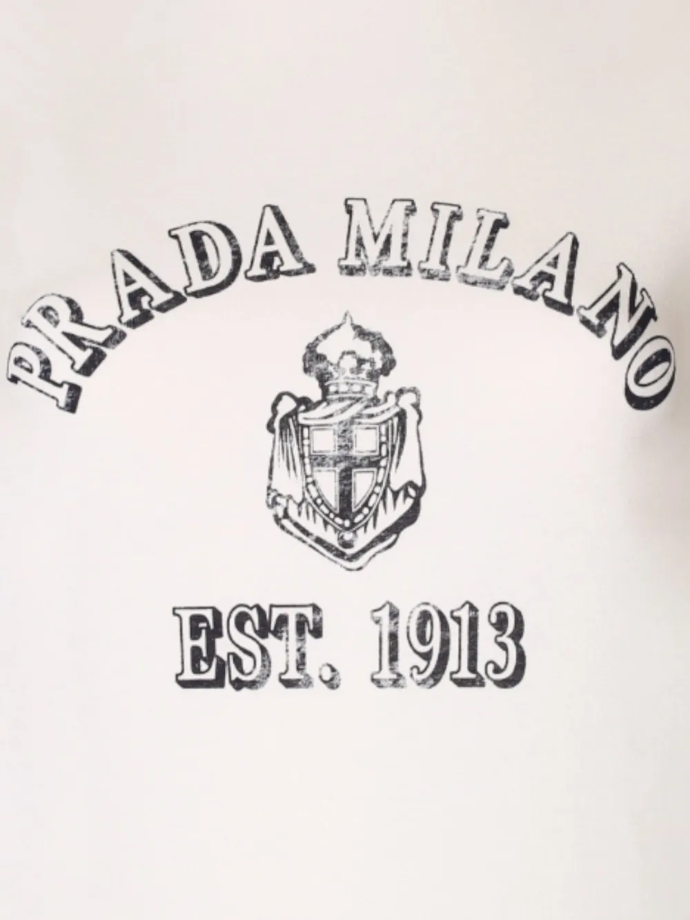 Футболка Prada выполнена из мягкого белого хлопка с классическим дизайном. Модель дополнена крупным принтом на груди, включающим логотип "Prada Milano" и дату основания бренда — 1913 год. На спине расположена тонкая вышивка логотипа. Простой крой и комфортная посадка делают эту футболку универсальным элементом гардероба для повседневного стиля.