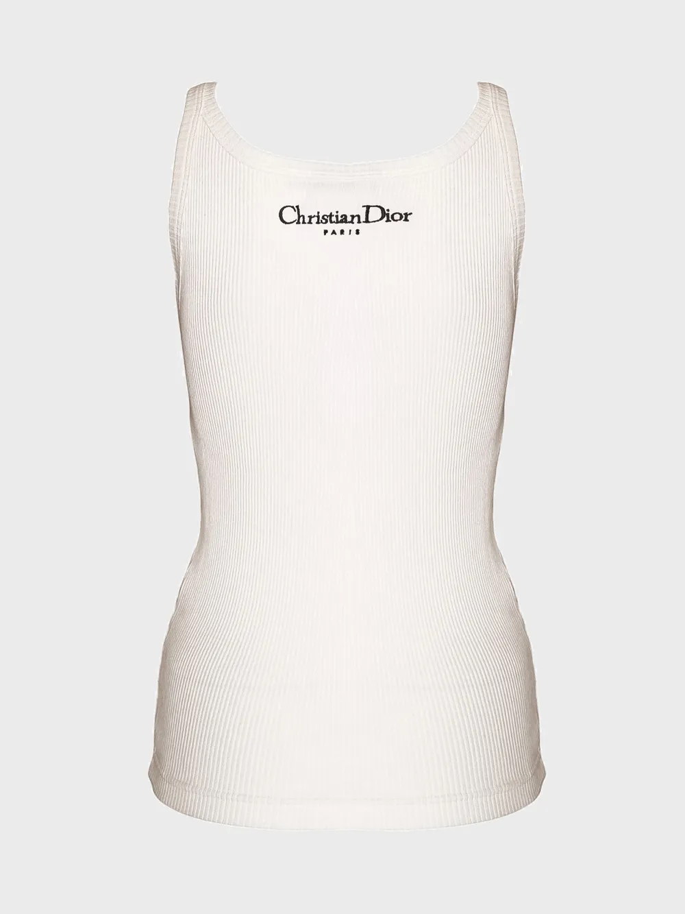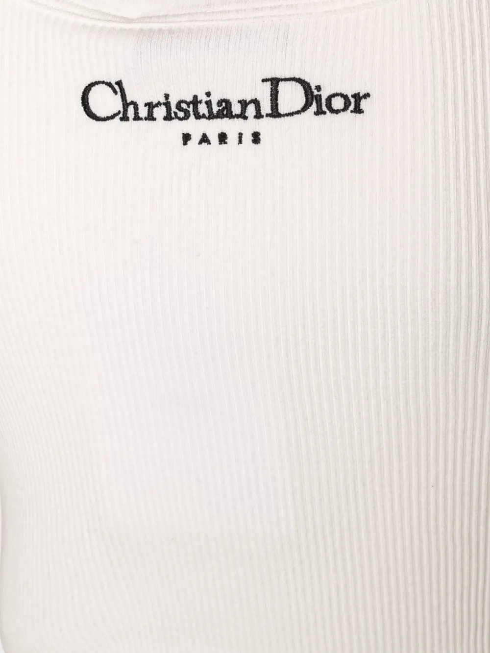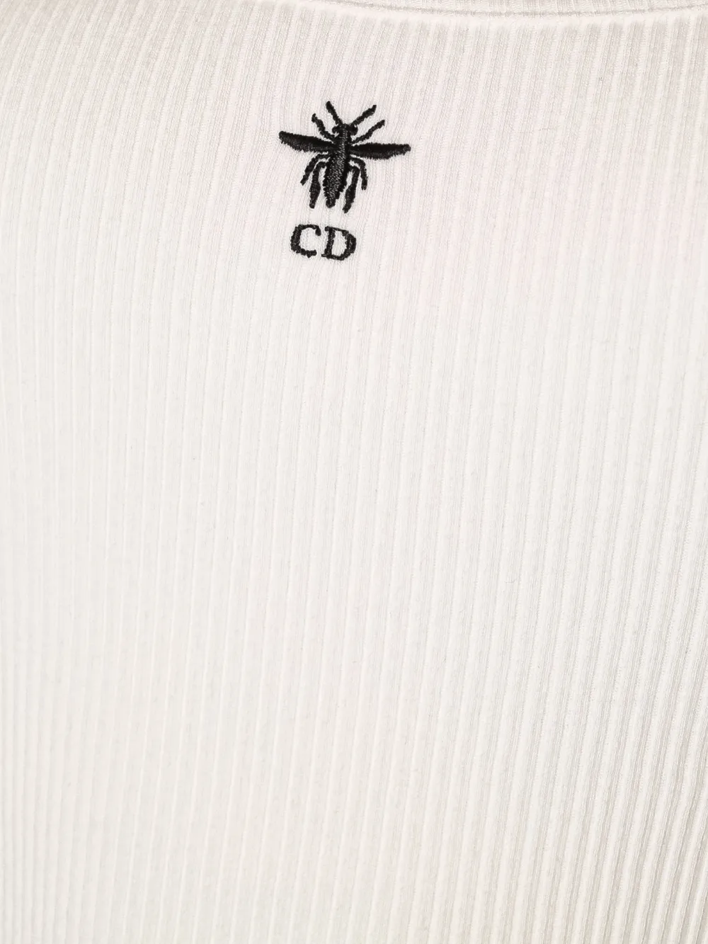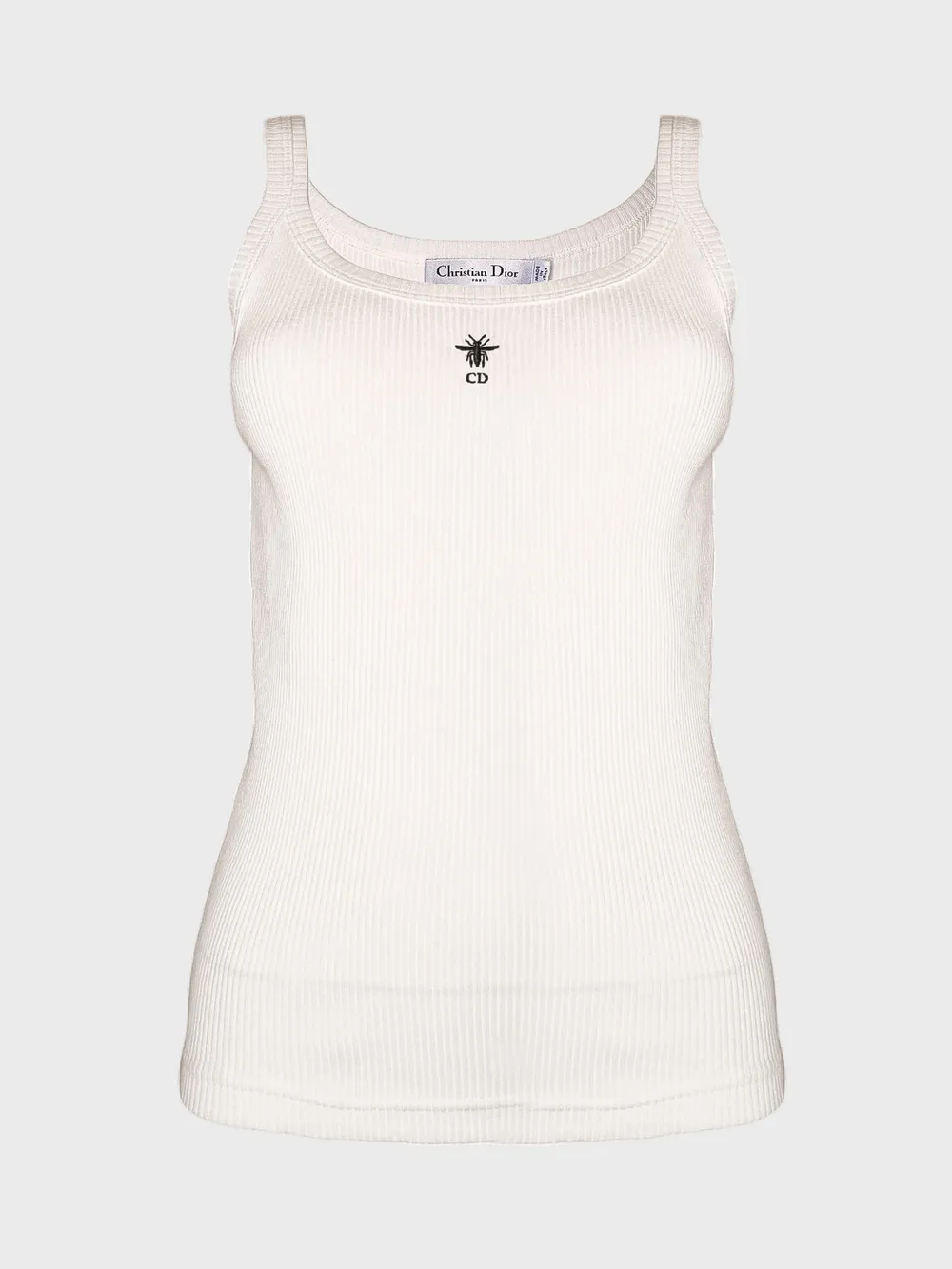Это белое бельевое изделие, вероятно, топ или майка, выполнено из мягкой и эластичной ткани с текстурой в виде вертикальных полос. Модель имеет круглый вырез и без рукавов. На передней части изделия размещена черная вышивка логотипа бренда "Christian Dior", состоящая из двух элементов: силуэта насекомого (скорее всего, пчелы) и надписи "CD". Дизайн сочетает простоту и роскошь, характерные для продукции премиального бренда.