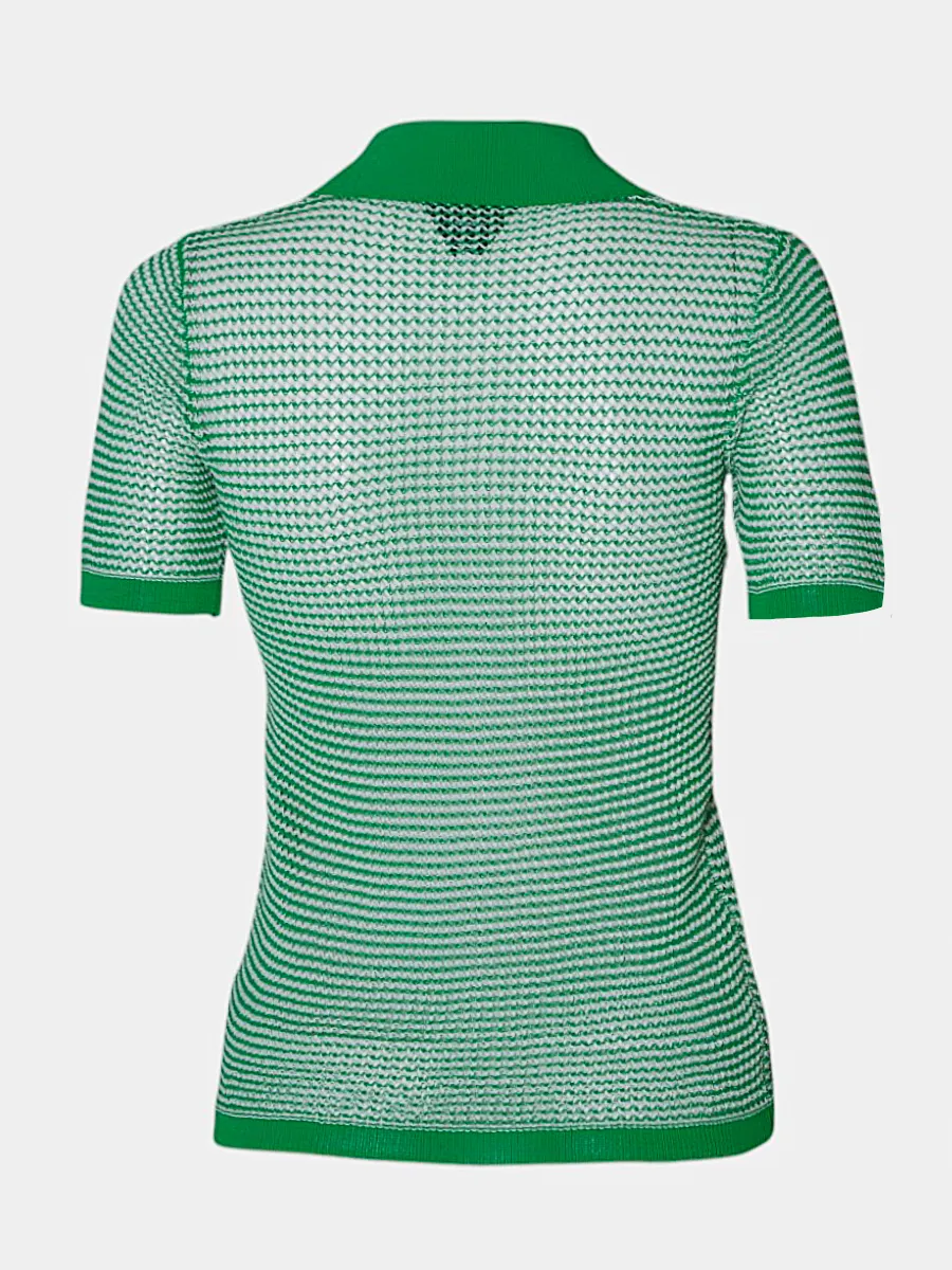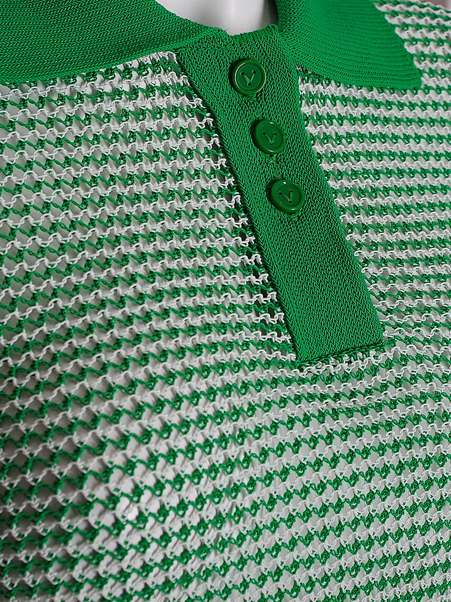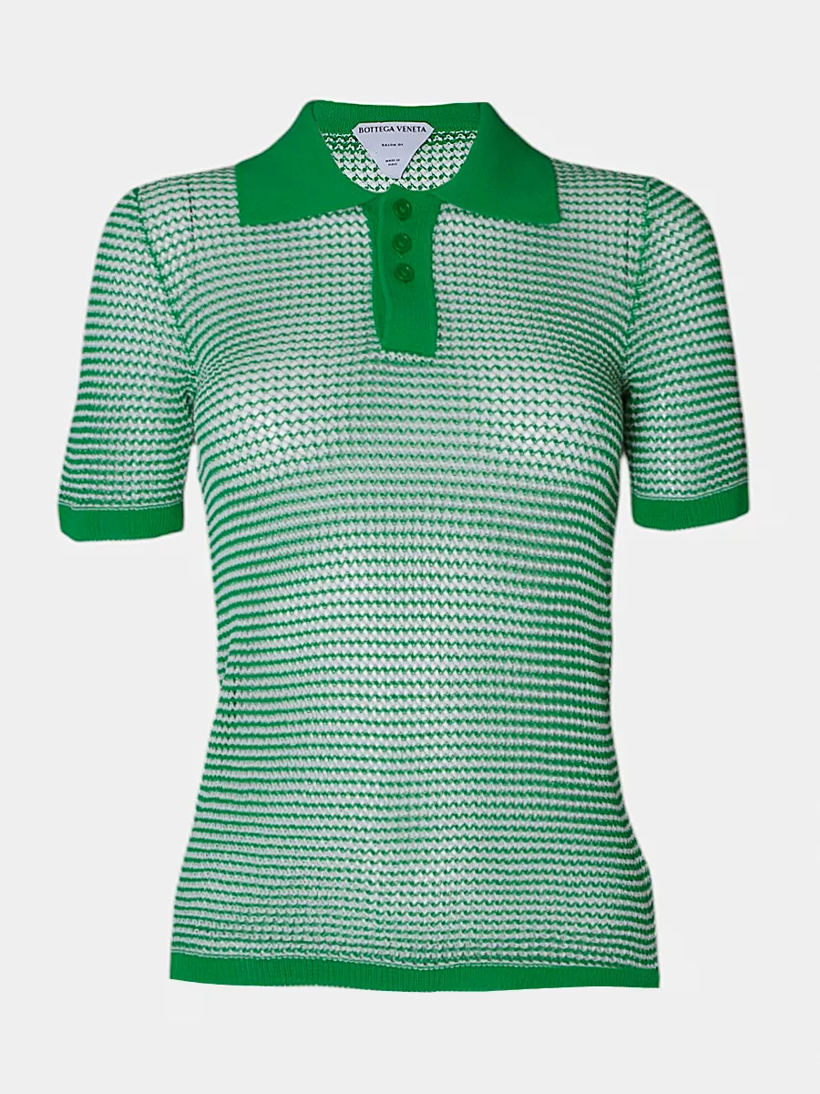 Поло Bottega Veneta выполнено из фактурного вязаного трикотажа с геометрическим узором в зелёно-белой гамме, сочетает классический крой и современную текстуру. Модель с отложным воротником и тонкими пуговицами подчеркивает качество исполнения и стиль — идеальный элемент для элегантных повседневных образов в духе итальянской роскоши.