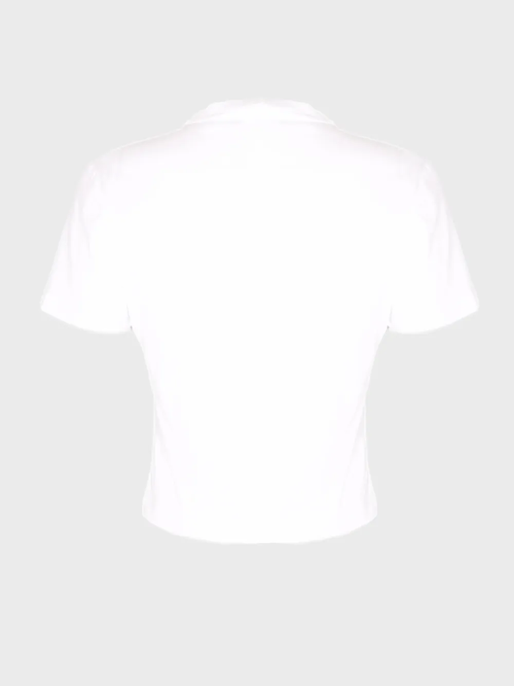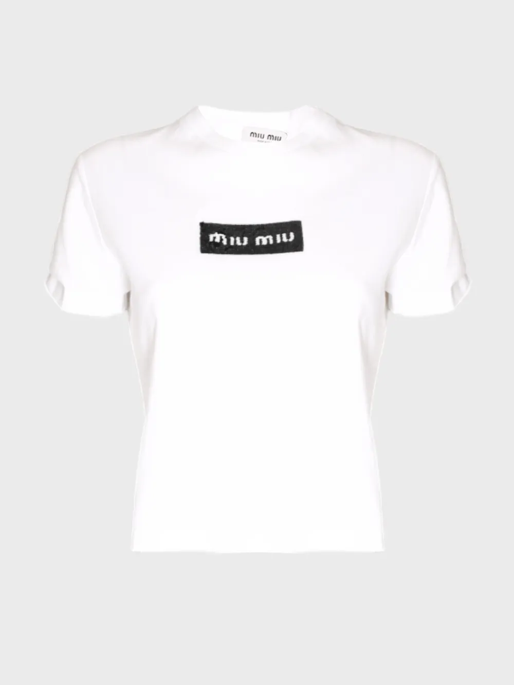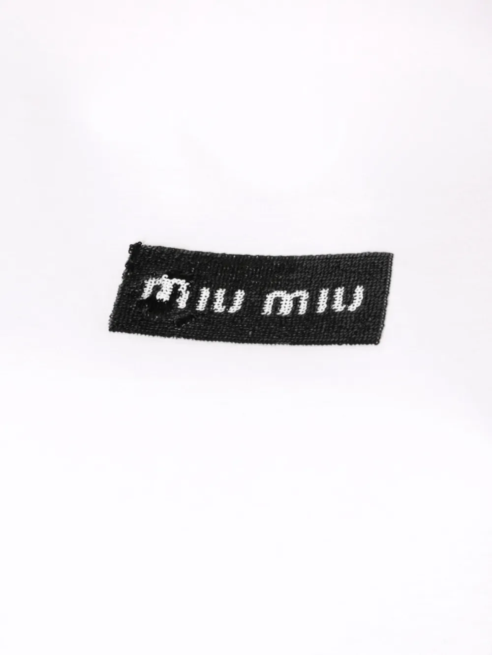 Топ Miu Miu выполнен из белой ткани с лаконичным дизайном. Модель оформлена короткими рукавами и круглым вырезом горловины. На груди расположен вышитый логотип бренда "Miu Miu" на черной фоне, что добавляет изделию узнаваемости и стиля. Топ изготовлен из качественного материала, обеспечивающего комфорт при носке. Идеально подходит для повседневного использования или создания современных образов.
