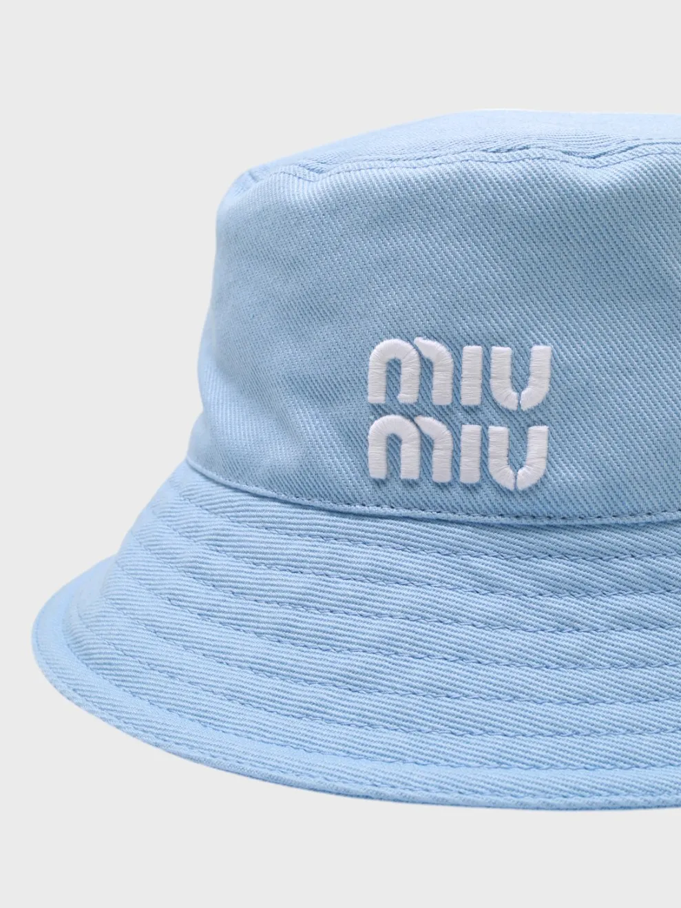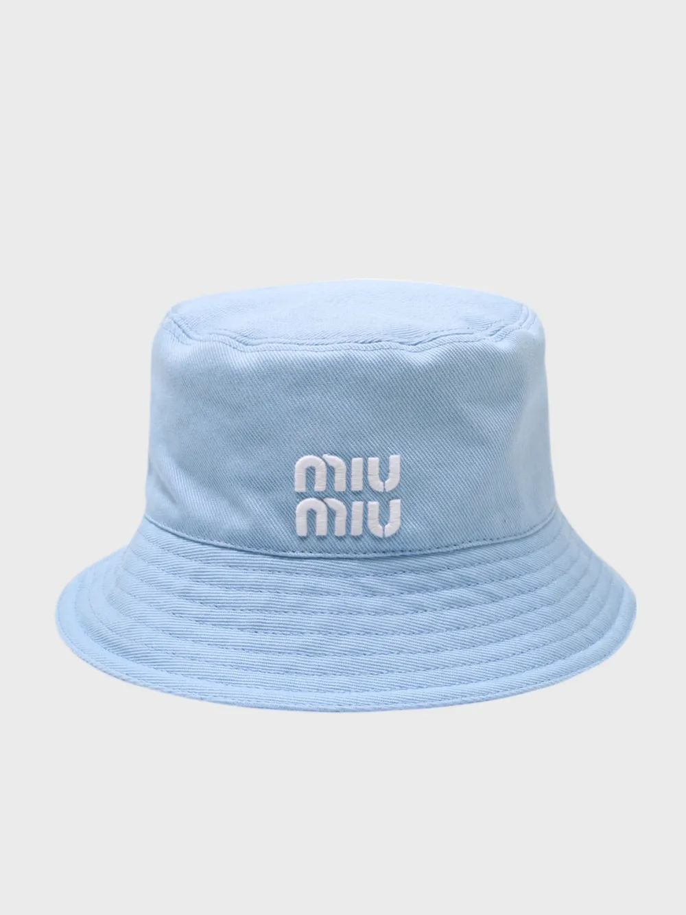 Панама Miu Miu выполнена из качественного хлопкового материала нежно-голубого цвета с текстурой. Модель дополнена вышитым белым логотипом бренда на передней части, придающим аксессуару узнаваемый стиль. Широкая тулья обеспечивает комфортную посадку и защиту от солнца. Идеальный выбор для летнего сезона — сочетает практичность и элегантность в единстве.