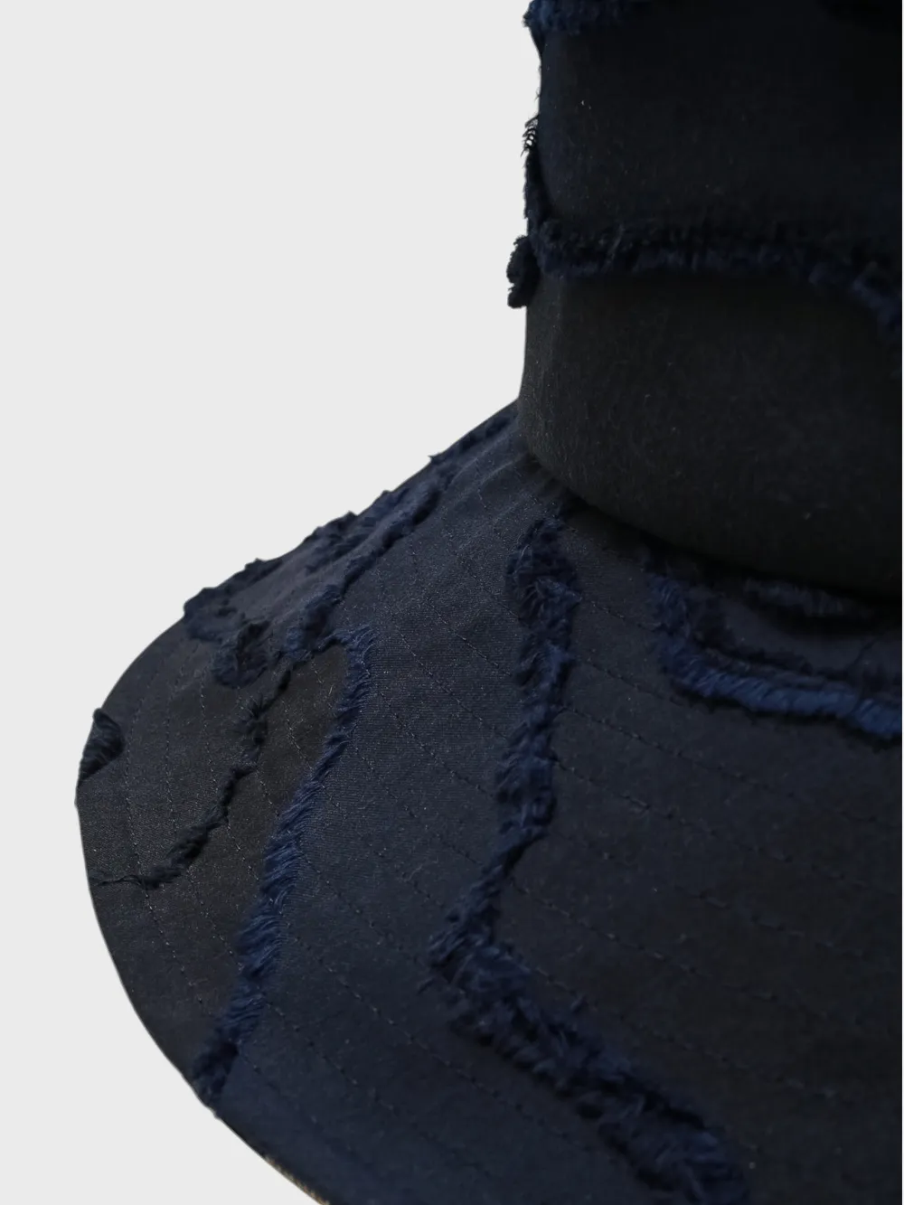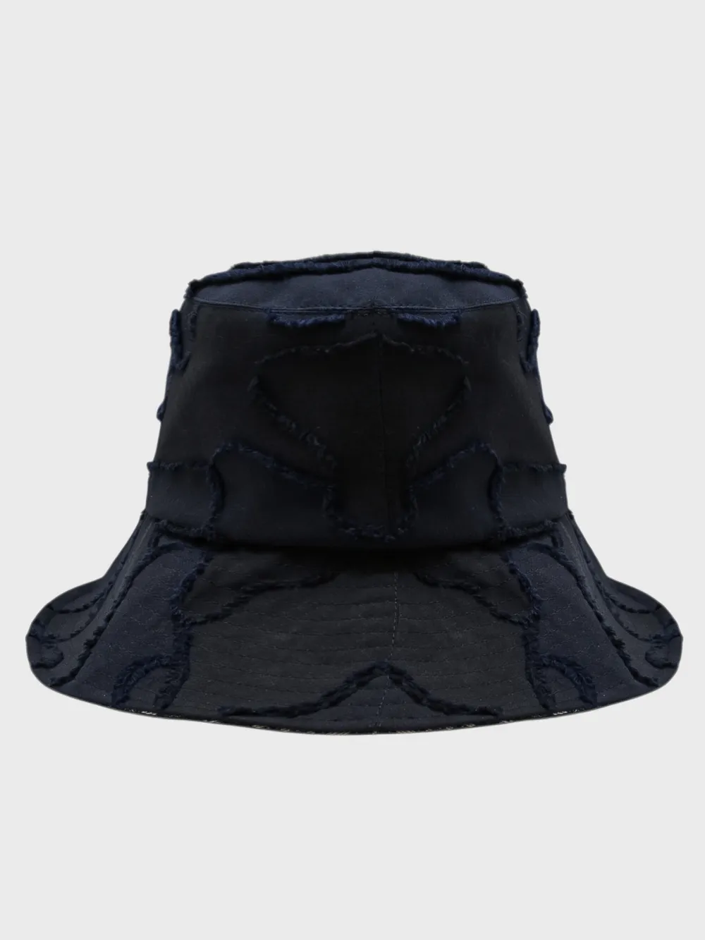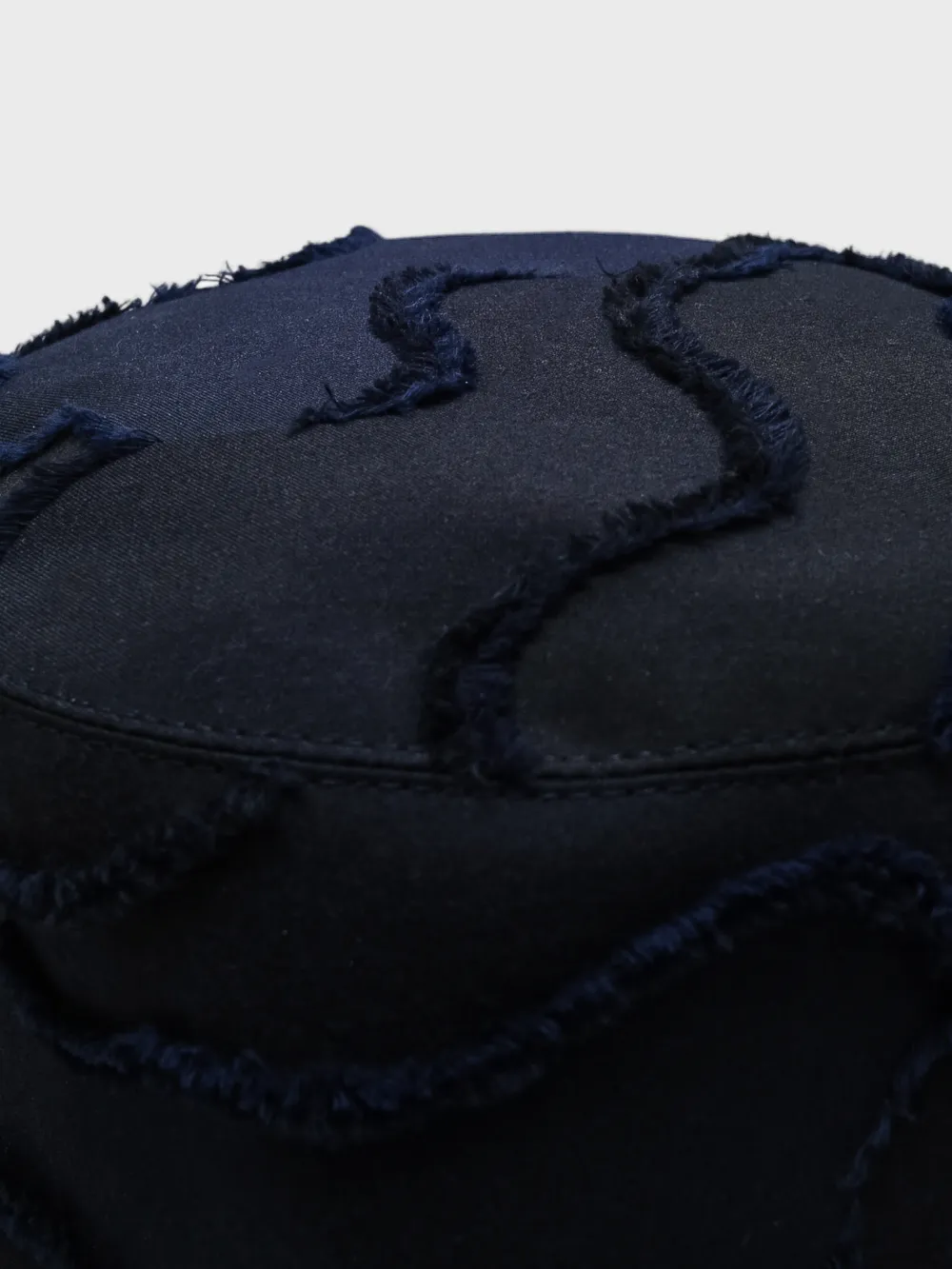 Шляпа выполнена из темно-синей ткани с декоративной отделкой в виде крупных геометрических узоров и потертых деталей. Модель имеет классический крой бейсболки, дополненная оригинальным дизайном, который придает ей современный и стильный вид.