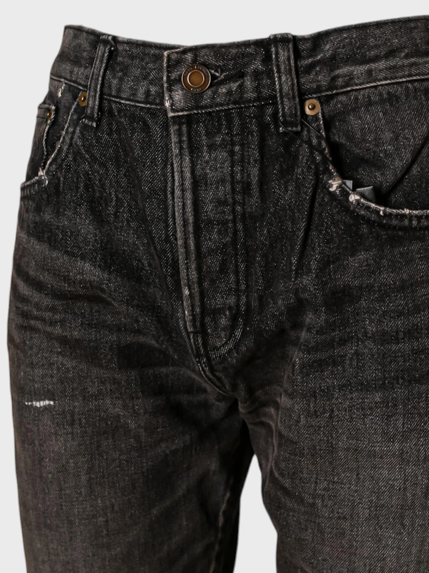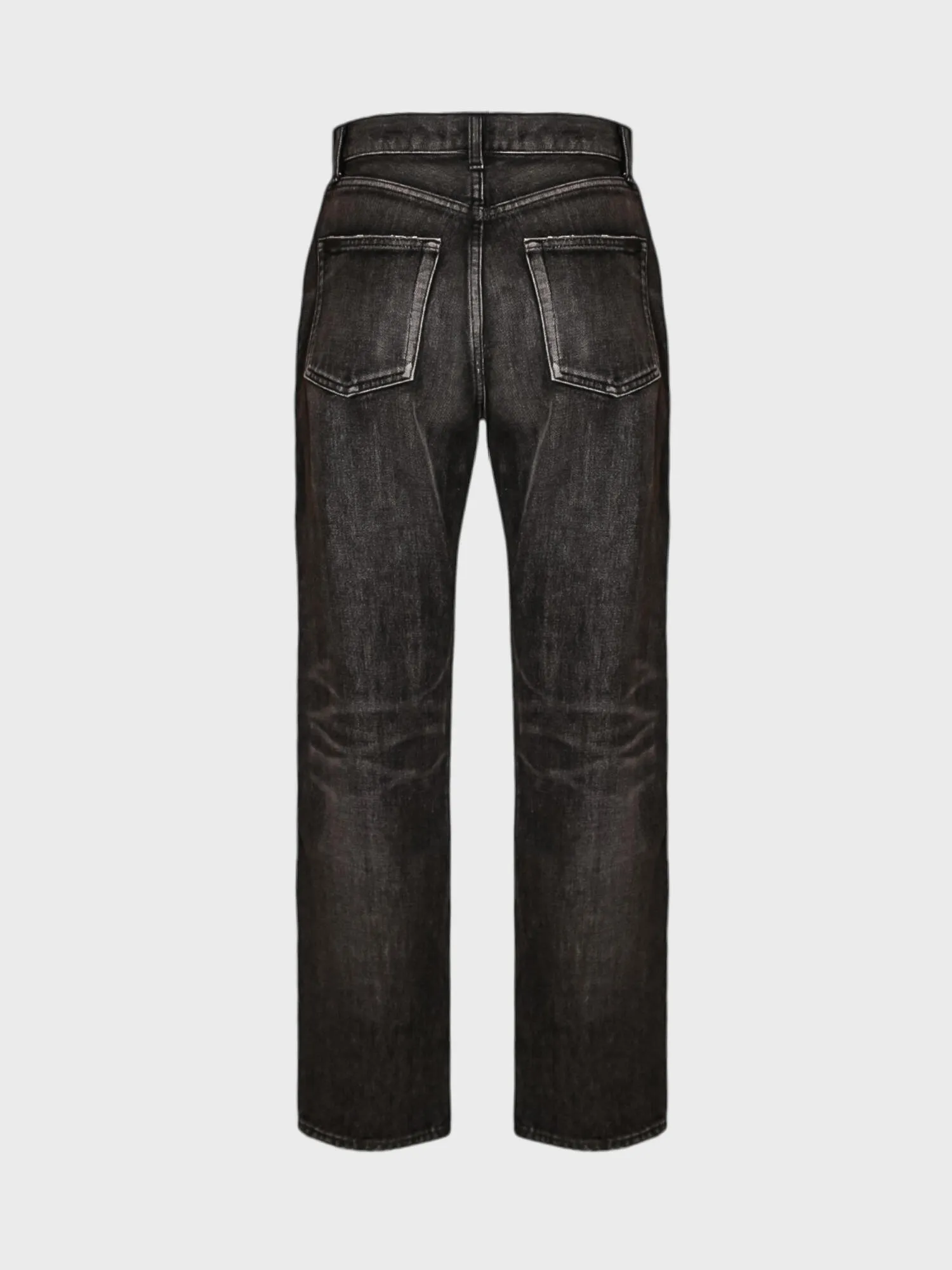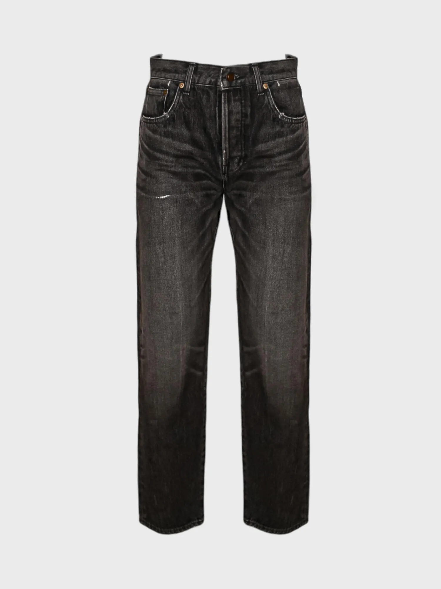 Джинсы Saint Laurent выполнены из высококачественного темного денима с эффектом потертости, что придает изделию утонченный и стильный вид. Модель прямого кроя дополнена классической пятикарманной конструкцией и металлическими заклепками. Высокая посадка обеспечивает комфортную посадку и современный силуэт. Идеальный выбор для повседневного стиля и делового образа.