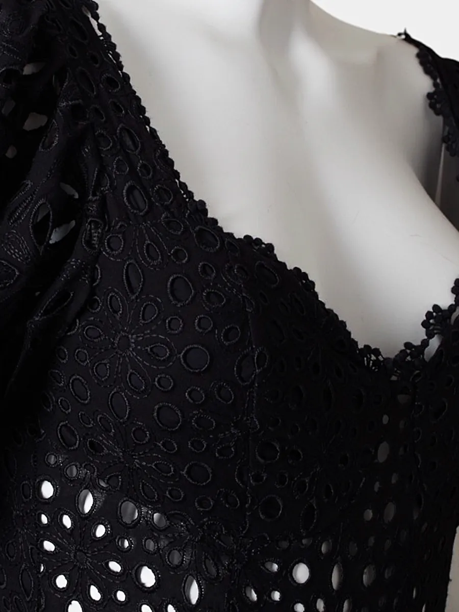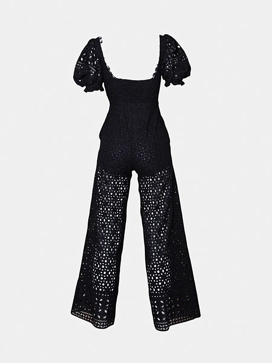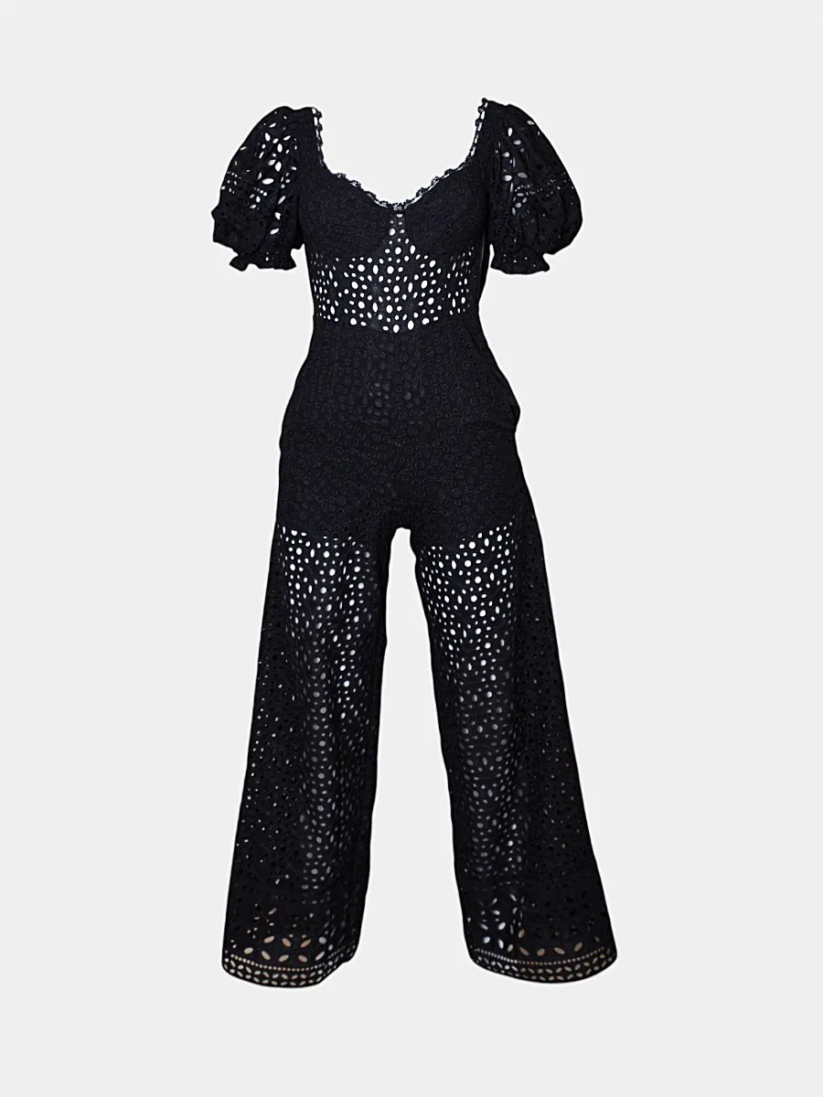Комбинезон Charo Ruiz выполнен из черного фактурного трикотажа с эффектным кружевным узором, созданным методом перфорации. Модель сочетает элегантный V-образный вырез и пышные короткие рукава, подчеркивая женственность силуэта. Широкие брючные ножки придают образу современный и свободный стиль. Утонченная отделка и качественная посадка делают этот комбинезон идеальным выбором для вечерних мероприятий или выходных в стиле casual-chic.