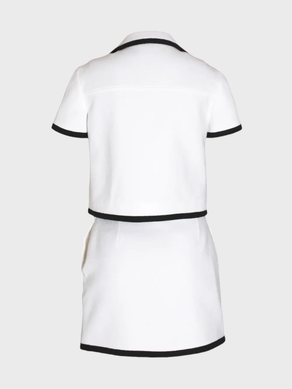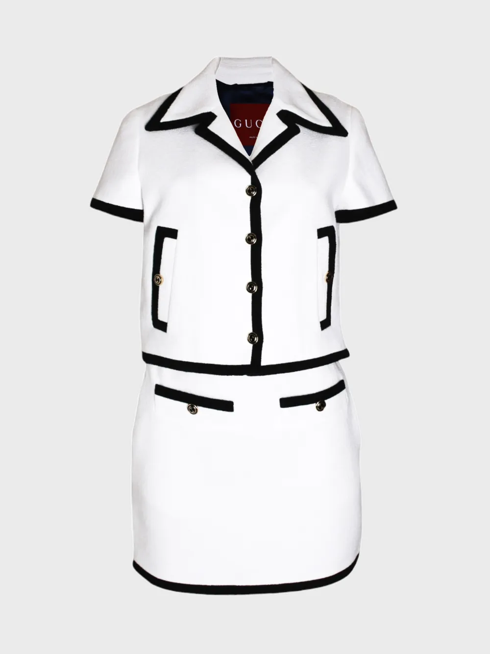 Костюм Gucci выполнен из качественной ткани в черно-белой гамме и состоит из приталенного пиджака с короткими рукавами и прямой юбки. Модель оформлена контрастными черными краями и застежкой на пуговицы, подчеркивая элегантность и современный стиль. Комплект идеально подходит для формальных случаев и сочетает в себе классику с узнаваемым дизайном бренда.