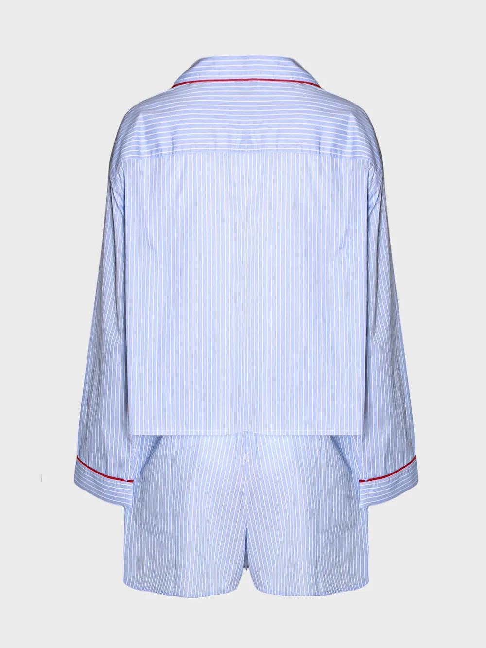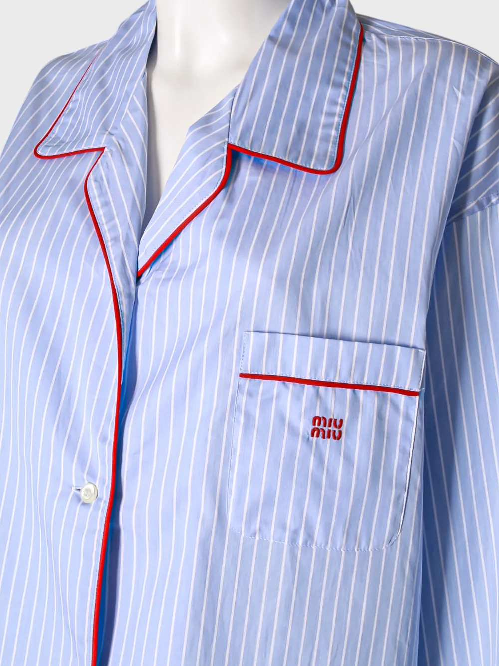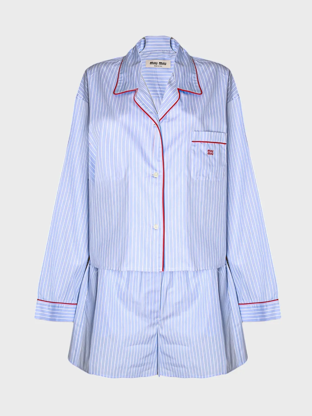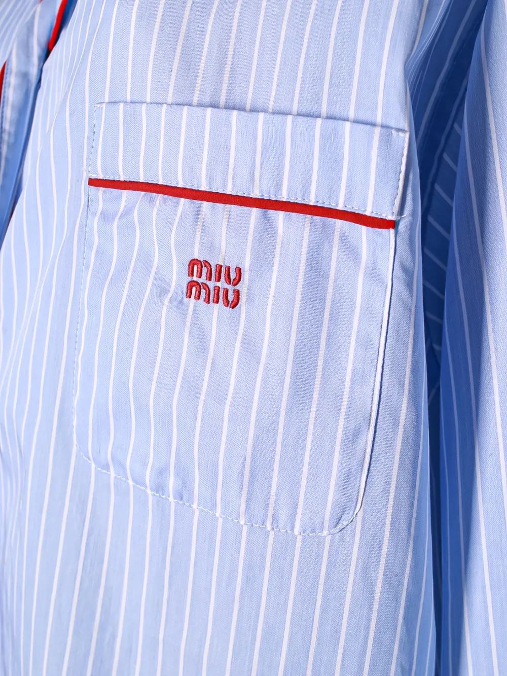 Элегантный комплект из рубашки и шорт от итальянского бренда Miu Miu, выполненный в классическом стиле с современным акцентом. Комплект изготовлен из тонкой хлопковой ткани с вертикальными полосами светло-голубого цвета, что придает ему легкость и свежесть. Особое внимание уделено деталям: контрастные красные строчки на манжетах, карманах и воротнике создают эффектный акцент, подчеркивающий роскошь дизайна. На груди рубашки расположен небольшой вышитый логотип Miu Miu, добавляющий узнаваемости бренда. Шорты прямого кроя с высокой посадкой идеально сочетаются с рубашкой, обеспечивая комфортную посадку и стильный внешний вид. Этот комплект — отличное решение для повседневного использования или летних мероприятий, где требуется безупречный вкус и качество.