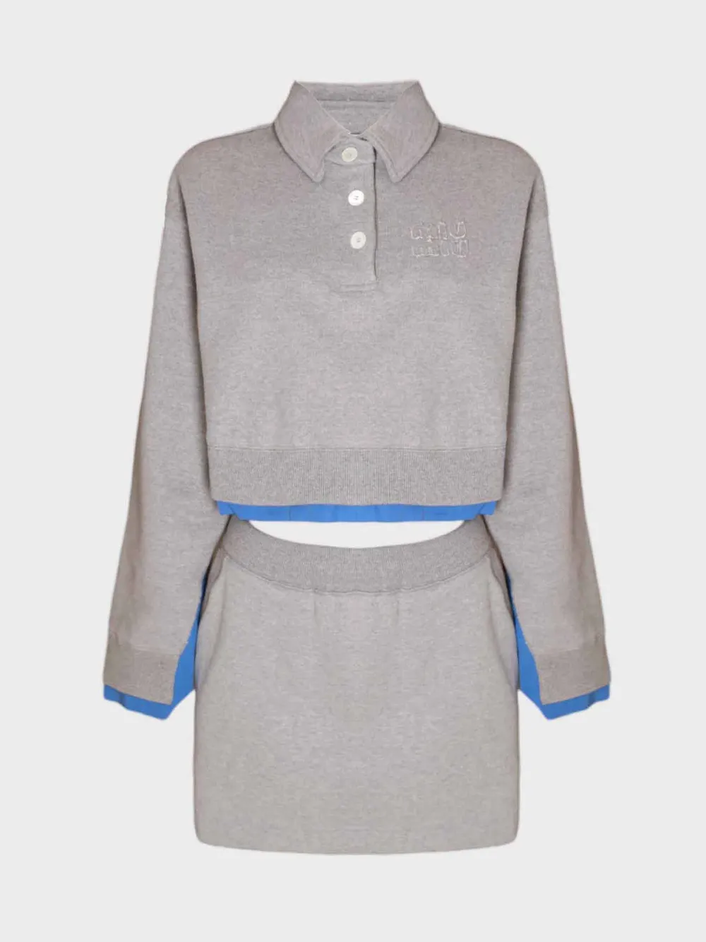 Костюм Miu Miu — современный и элегантный комплект, выполненный в спокойной пастельной гамме. Модель состоит из верхней части с поло-воротником и длинными рукавами, дополненной контрастными синими деталями на манжетах и пояснице. На груди вышит логотип бренда, который добавляет узнаваемости дизайну. Нижняя часть костюма представляет собой укороченную юбку или шорты, которые гармонично сочетаются с верхней частью. Комплект выполнен из мягкого трикотажного материала, что обеспечивает комфорт при носке. Этот костюм идеально подходит для повседневных выходов, демонстрируя стиль и безупречное чувство моды.