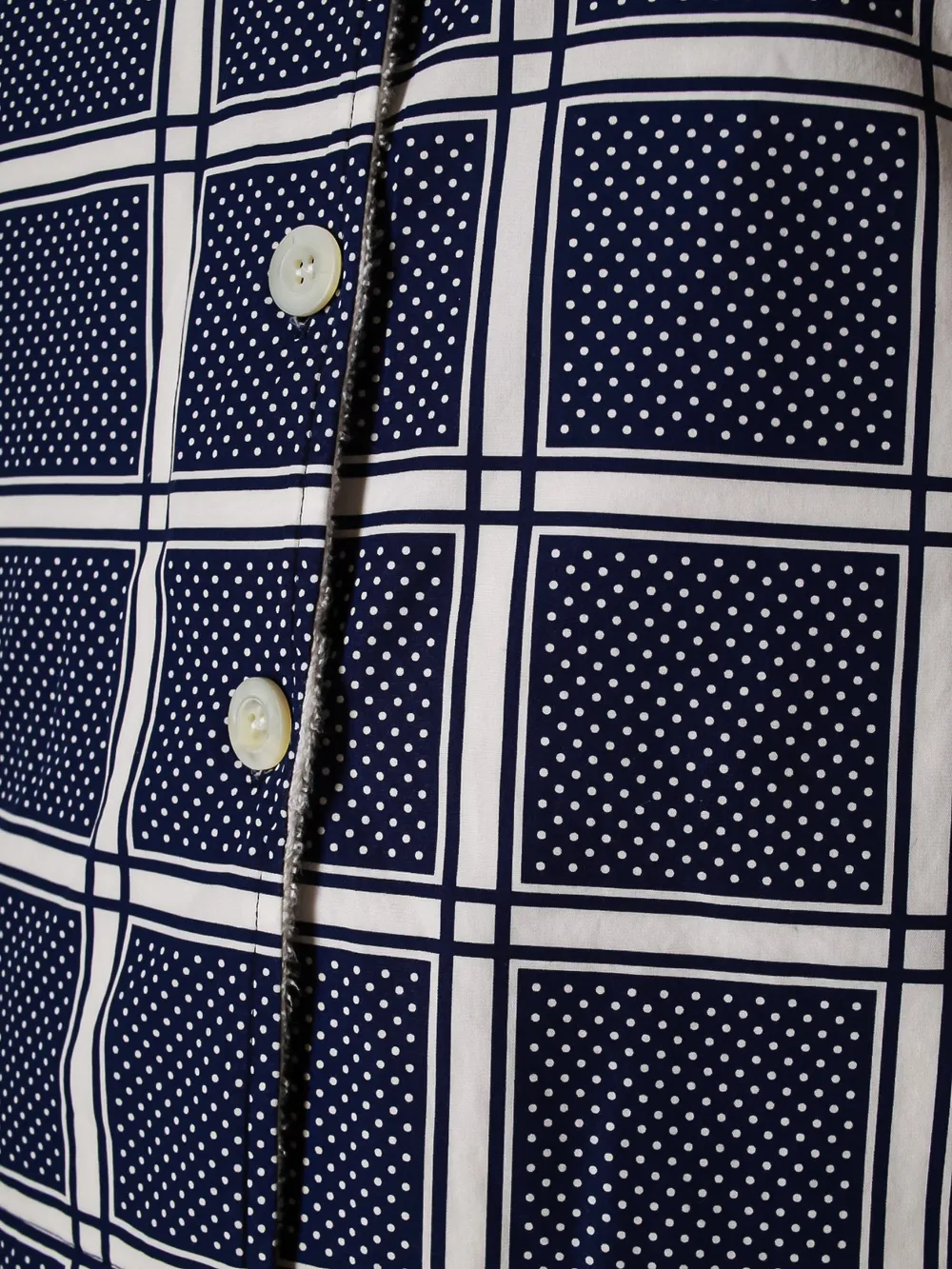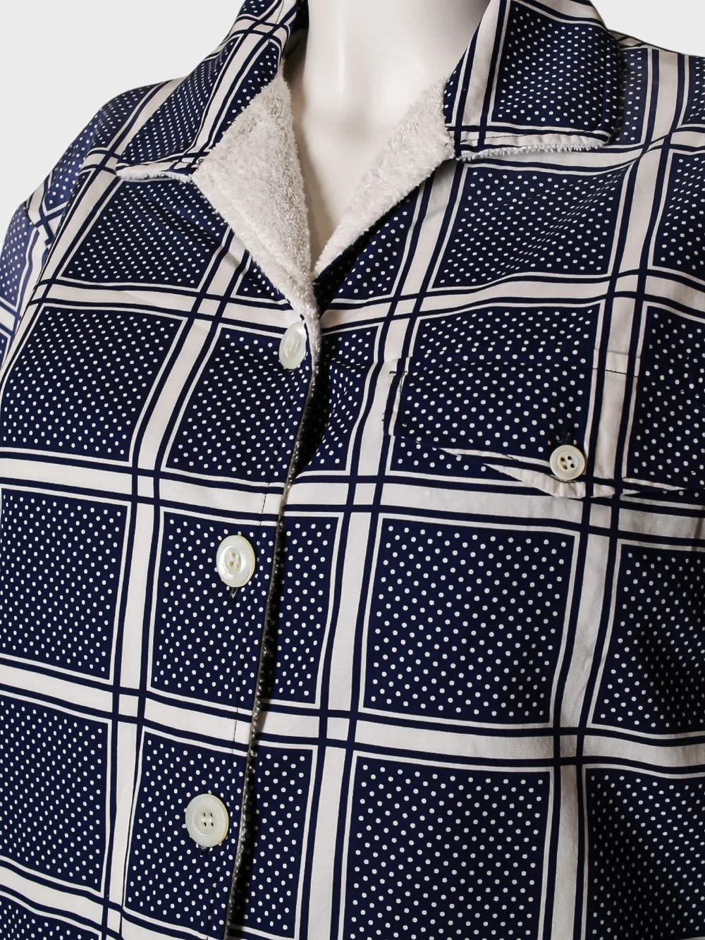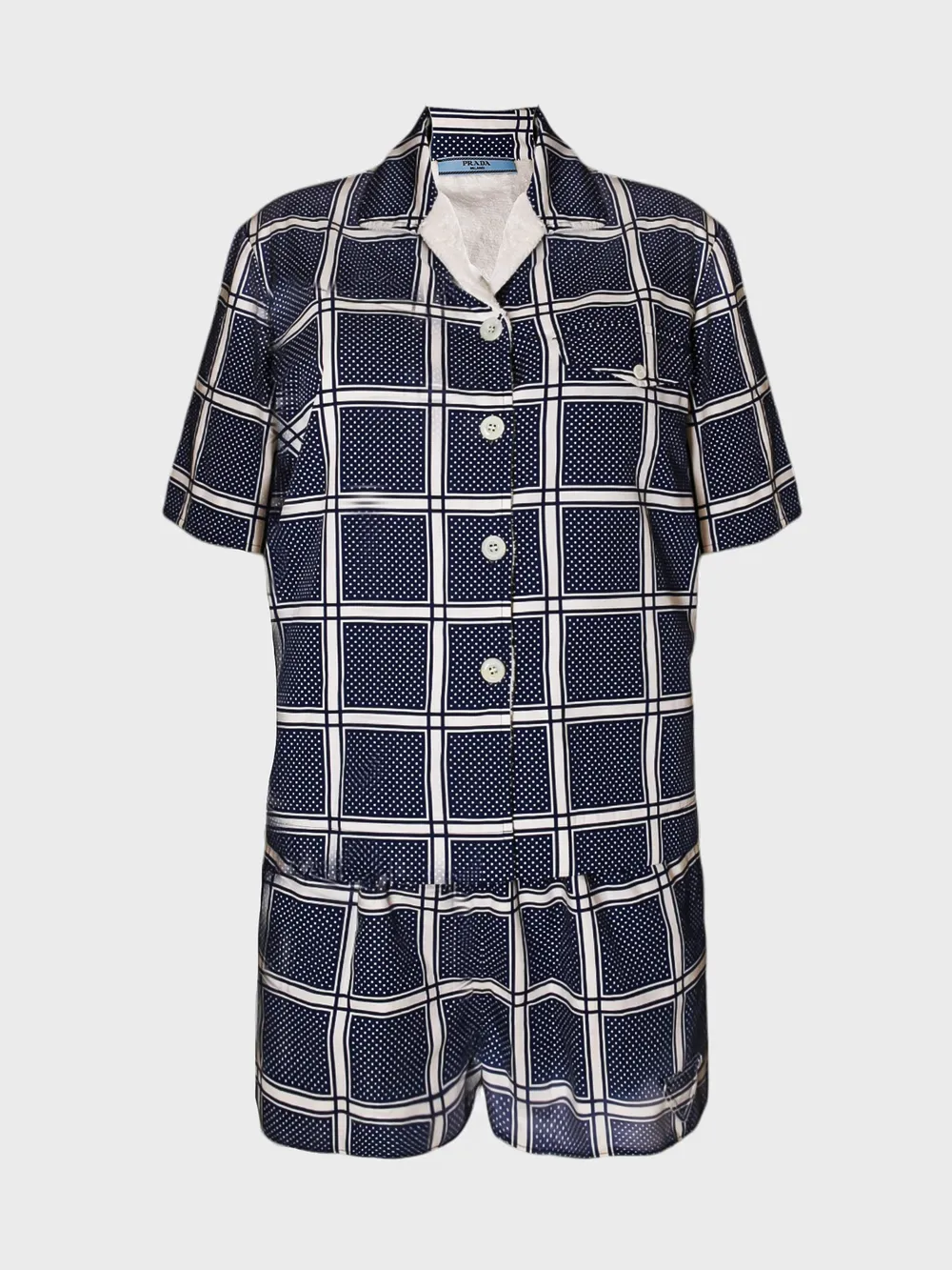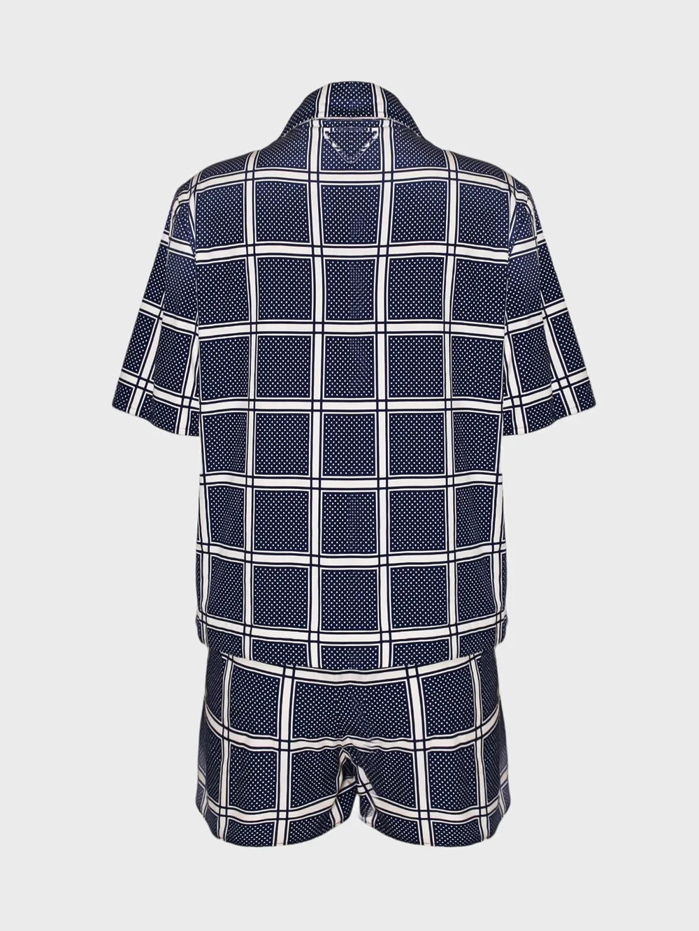 Костюм Prada состоит из комплекта пижамы, выполненного в темно-синем цвете с крупным клетчатым узором и точечным принтом. Комплект включает рубашку с короткими рукавами и брюки-шорты. Рубашка дополнена белыми пуговицами и контрастной подкладкой из мягкого меха на воротнике, что придает ей комфортную посадку и теплый внешний вид. Прямой крой и классический дизайн обеспечивают удобство носки. Идеально подходит для создания расслабленных домашних образов или отдыха.