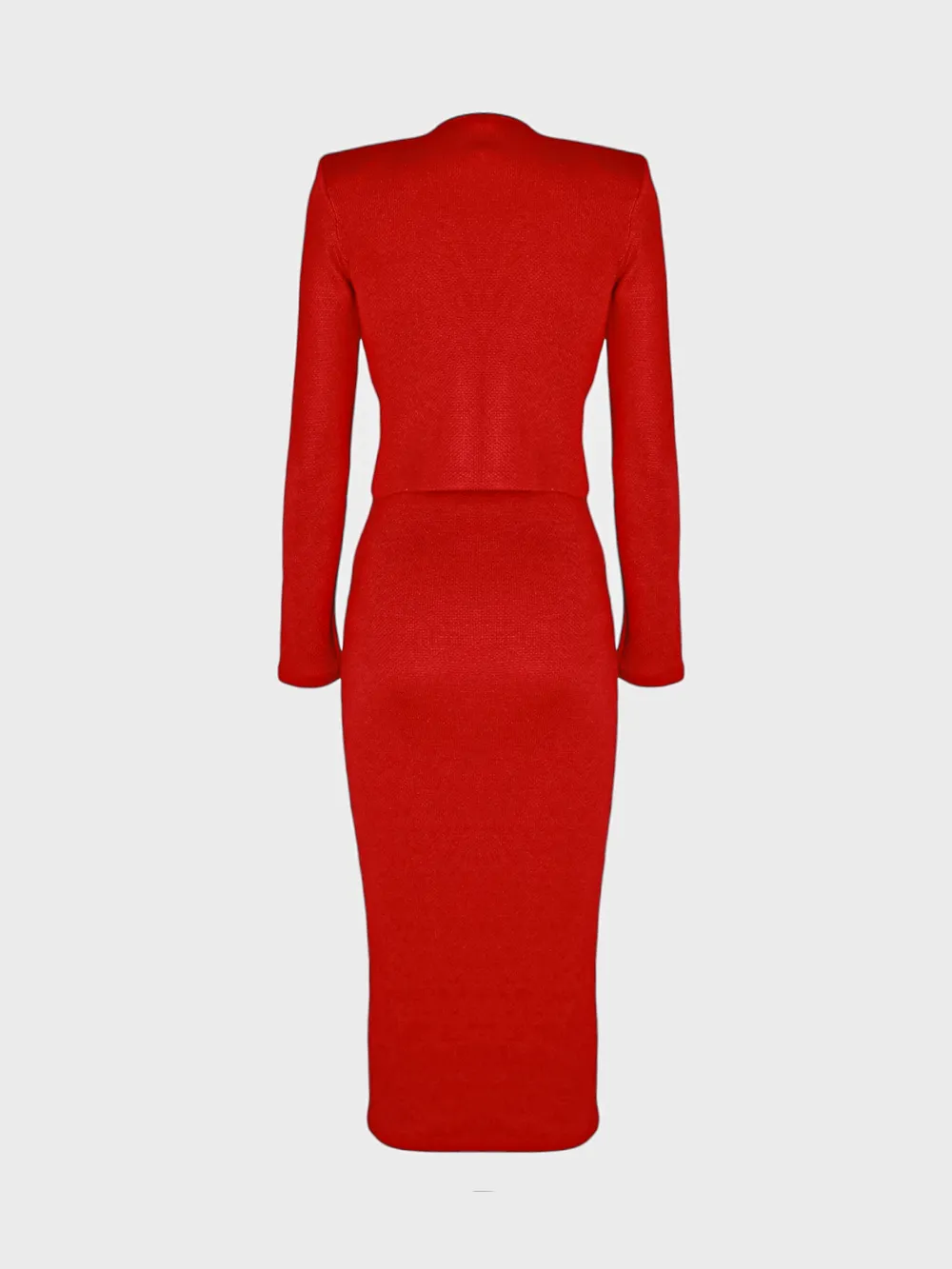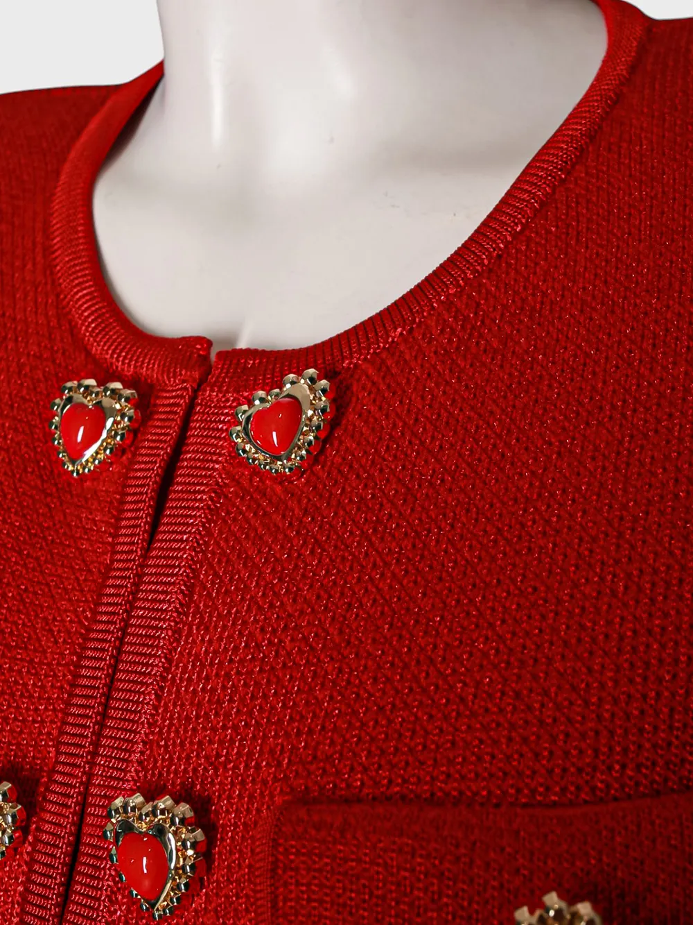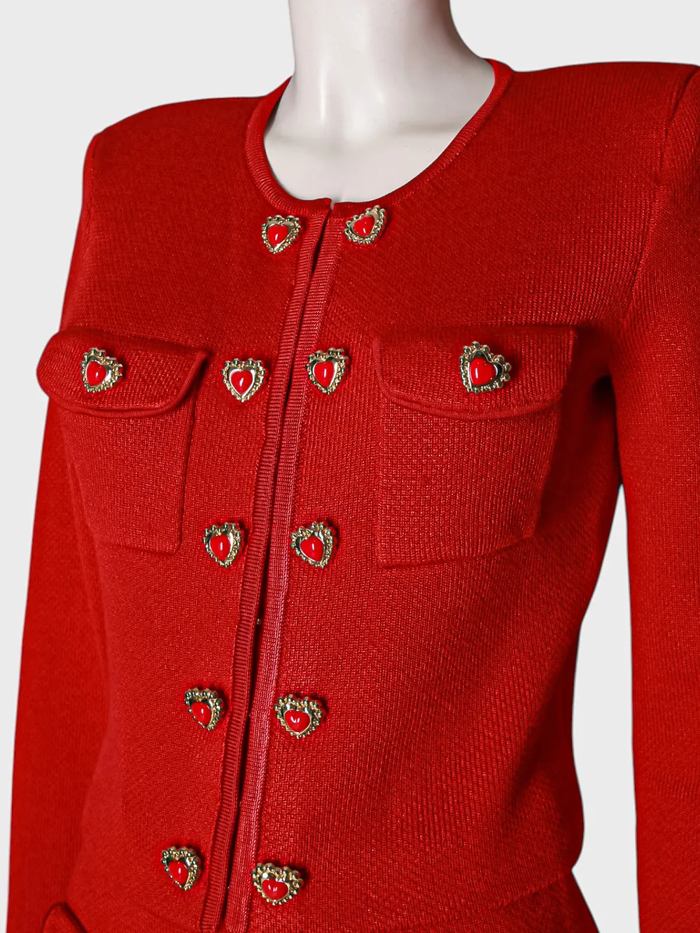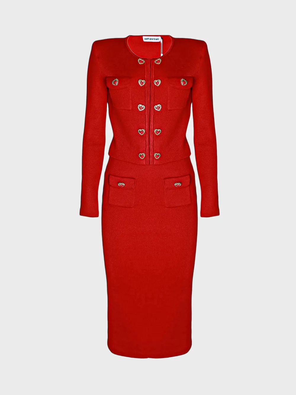 Платье Self-Portrait выполнено из ярко-красной фактурной ткани, создавая эффектный и праздничный образ. Модель прямого кроя с длинными рукавами и круглым вырезом подчеркивает фигуру благодаря облегающему силуэту. Особое внимание привлекают декоративные элементы — красные пуговицы в форме сердец с золотыми деталями, которые украшают переднюю часть платья, добавляя нарядности и изысканности. Ткань отличается текстурой, придавая изделию устойчивый и элегантный вид. Простой силуэт и длина до колена делают этот наряд универсальным для особых случаев или вечерних мероприятий, где требуется сочетание стиля и комфорта.