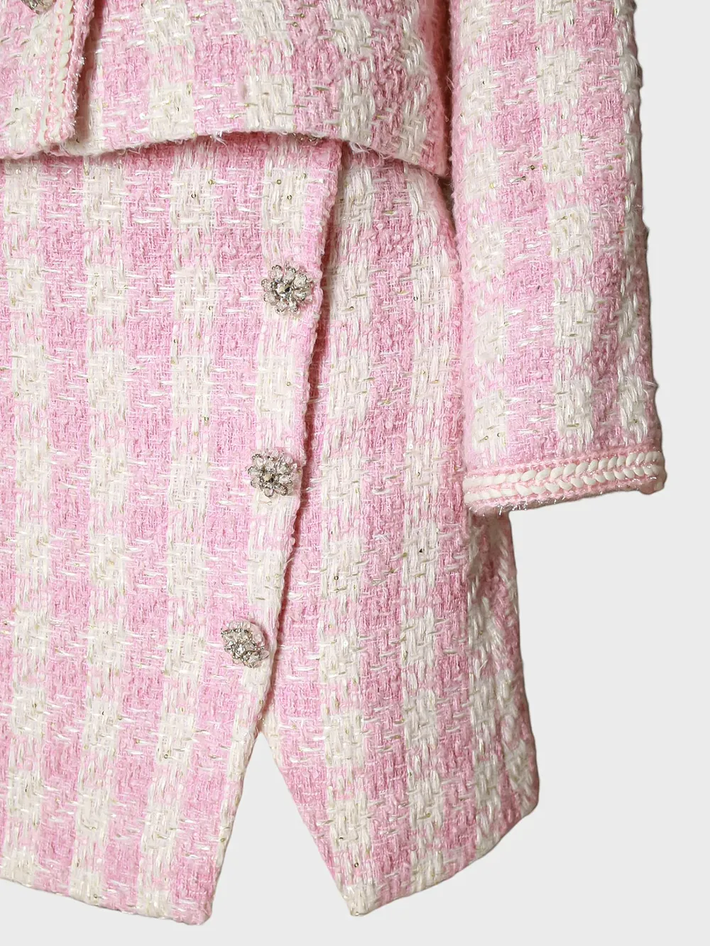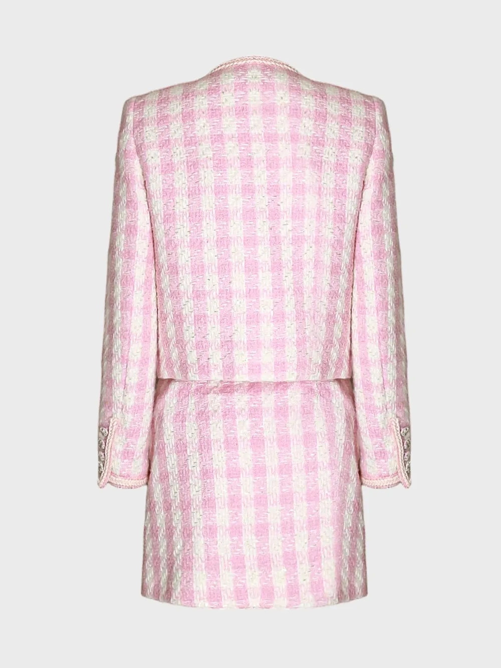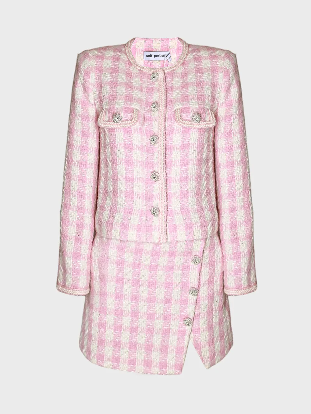 Костюм Self-Portrait выполнен из высококачественного твида в розово-белую клетку, создавая нежный и элегантный образ. Модель состоит из приталенного пиджака с двубортной застежкой и декоративными кристаллическими кнопками, а также мини-юбки с завышенной талией. Ткань отличается фактурным плетением, придающим изделию уютный и дорогой вид. Детали, такие как контрастные строчки и акценты из блестящих элементов, добавляют изысканности и женственности. Идеальный выбор для особых случаев или деловых встреч, где требуется сочетание стиля и комфорта.