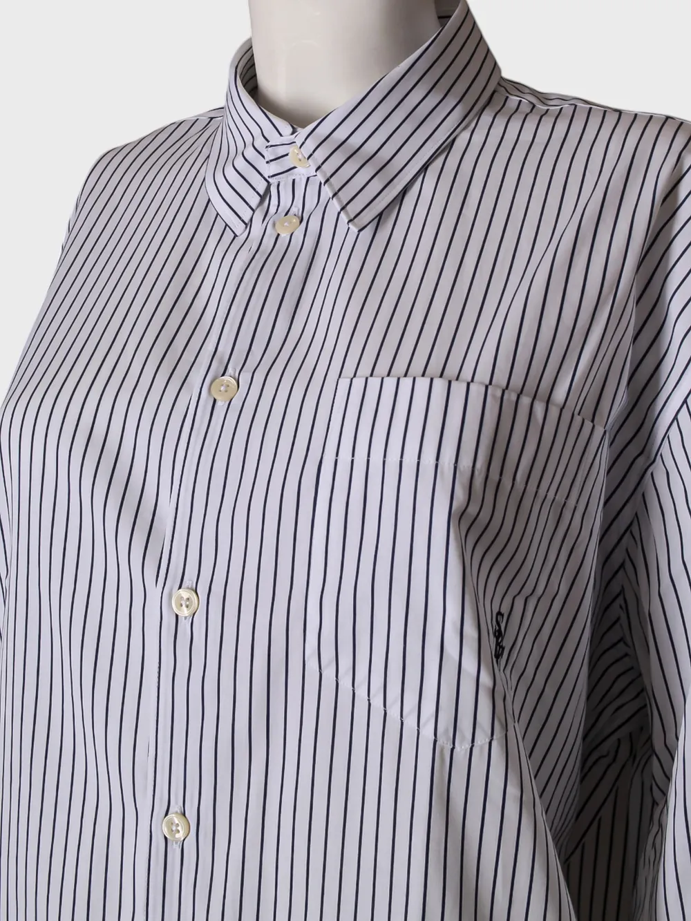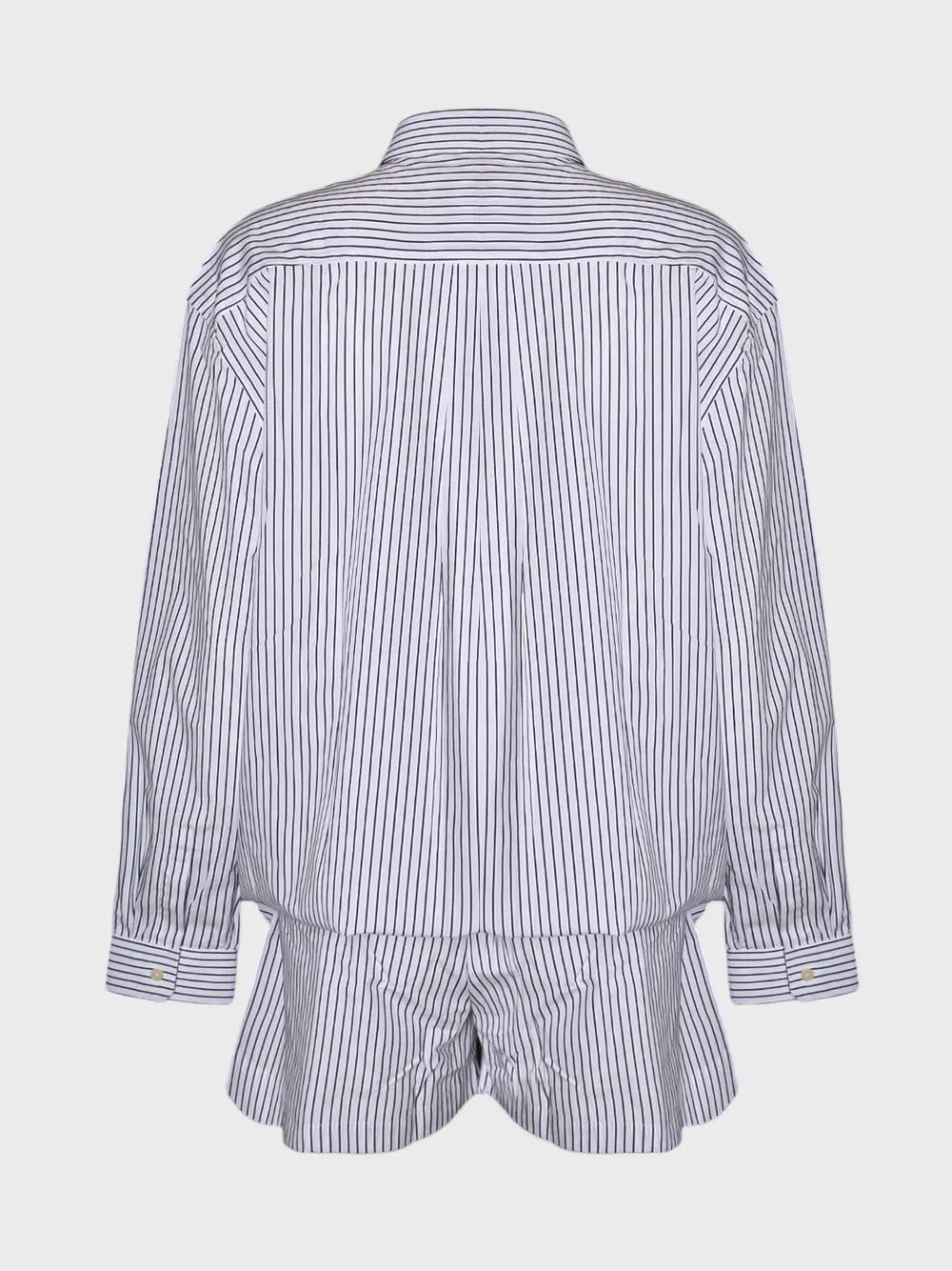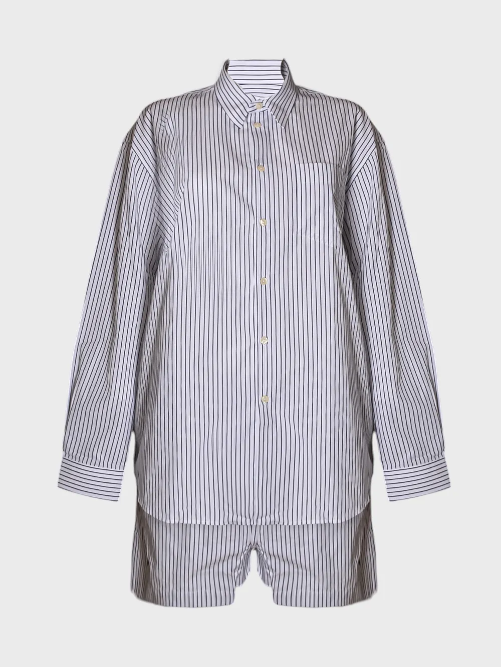 Костюм Sporty & Rich состоит из комплекта пижамы, выполненного в белом цвете с тонкими черными вертикальными полосами. Комплект включает рубашку с длинными рукавами и брюки-шорты. Рубашка дополнена классическим воротником-стойкой и застежкой на пуговицы, что придает ей элегантный вид. Прямой крой и комфортная посадка обеспечивают удобство носки. Идеально подходит для создания расслабленных домашних образов или отдыха.