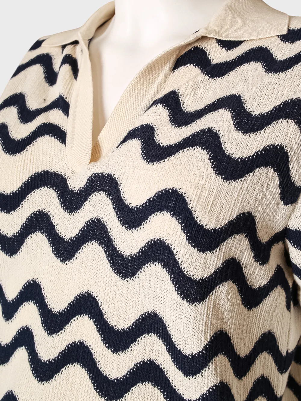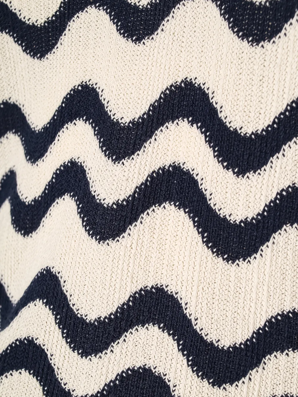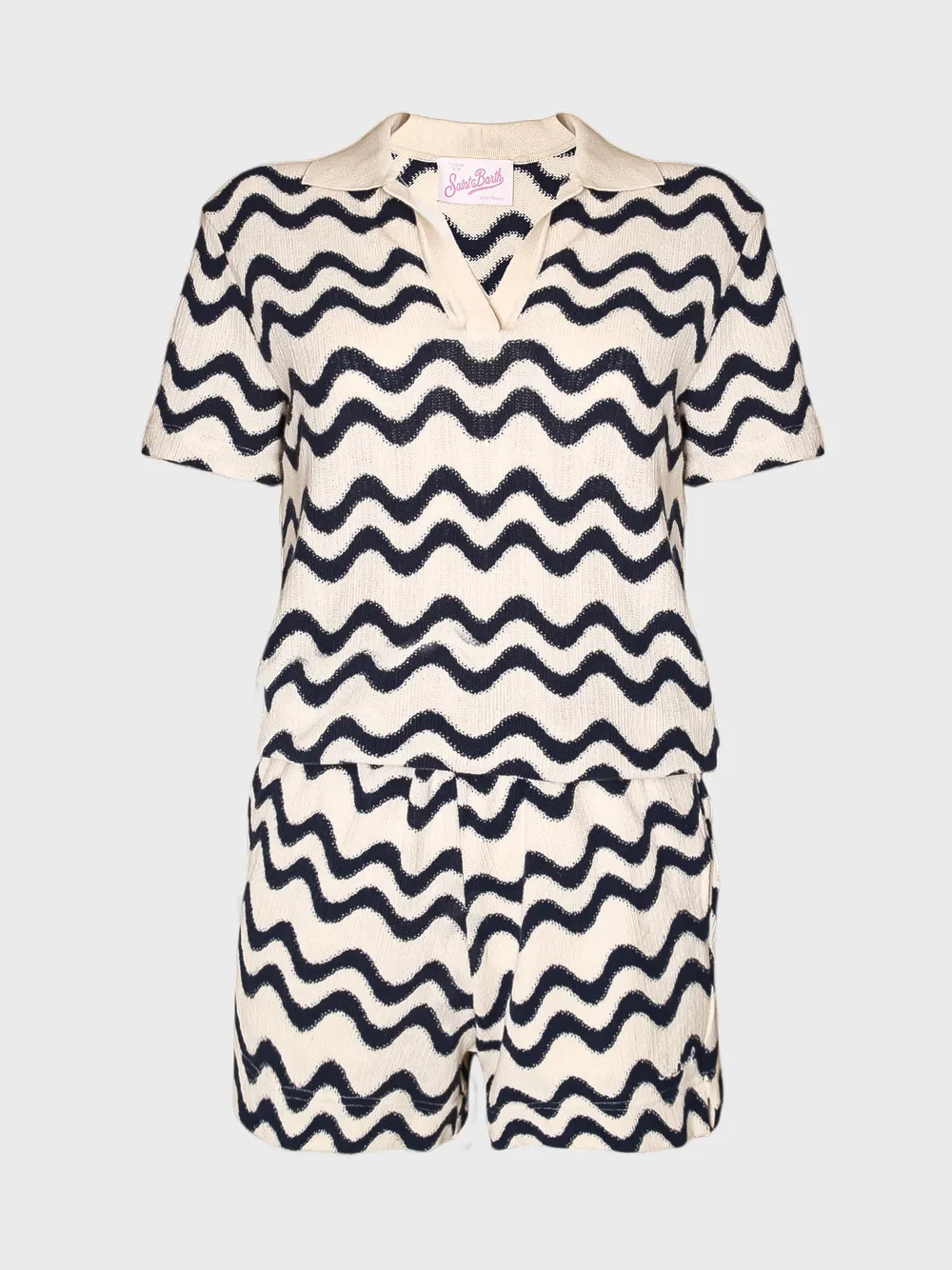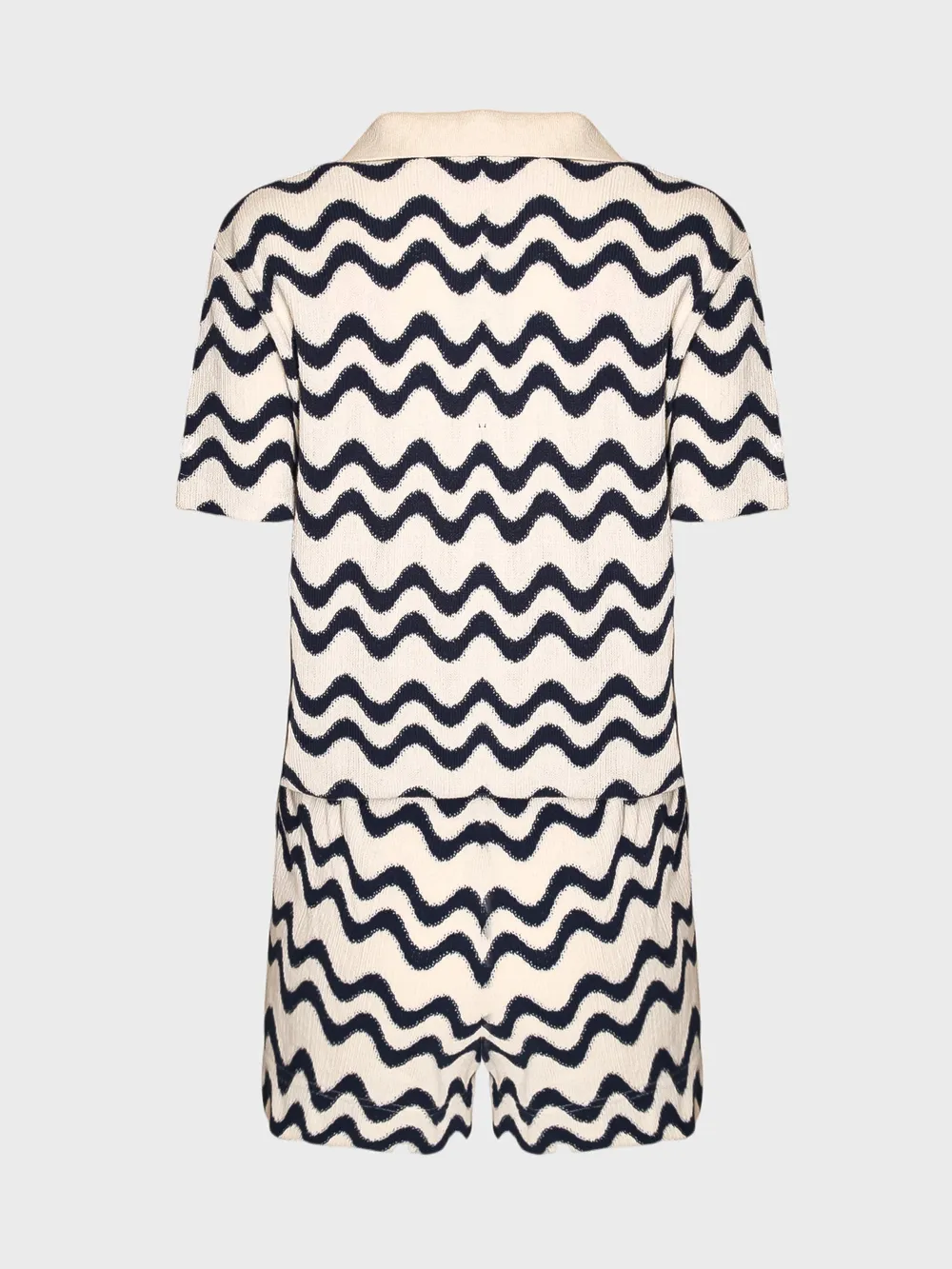 Костюм Saint Barth выполнен из качественного трикотажа с текстурным рельефом, придающим ему мягкость и комфорт. Модель оформлена винтажным узором из черно-белых волн, который создает динамичный и современный вид. Костюм состоит из короткой рубашки с V-образным вырезом и брюк с высокой посадкой, идеально подходящих для летнего сезона. Простой дизайн и удобная посадка делают этот костюм универсальным выбором для отдыха или повседневного использования.