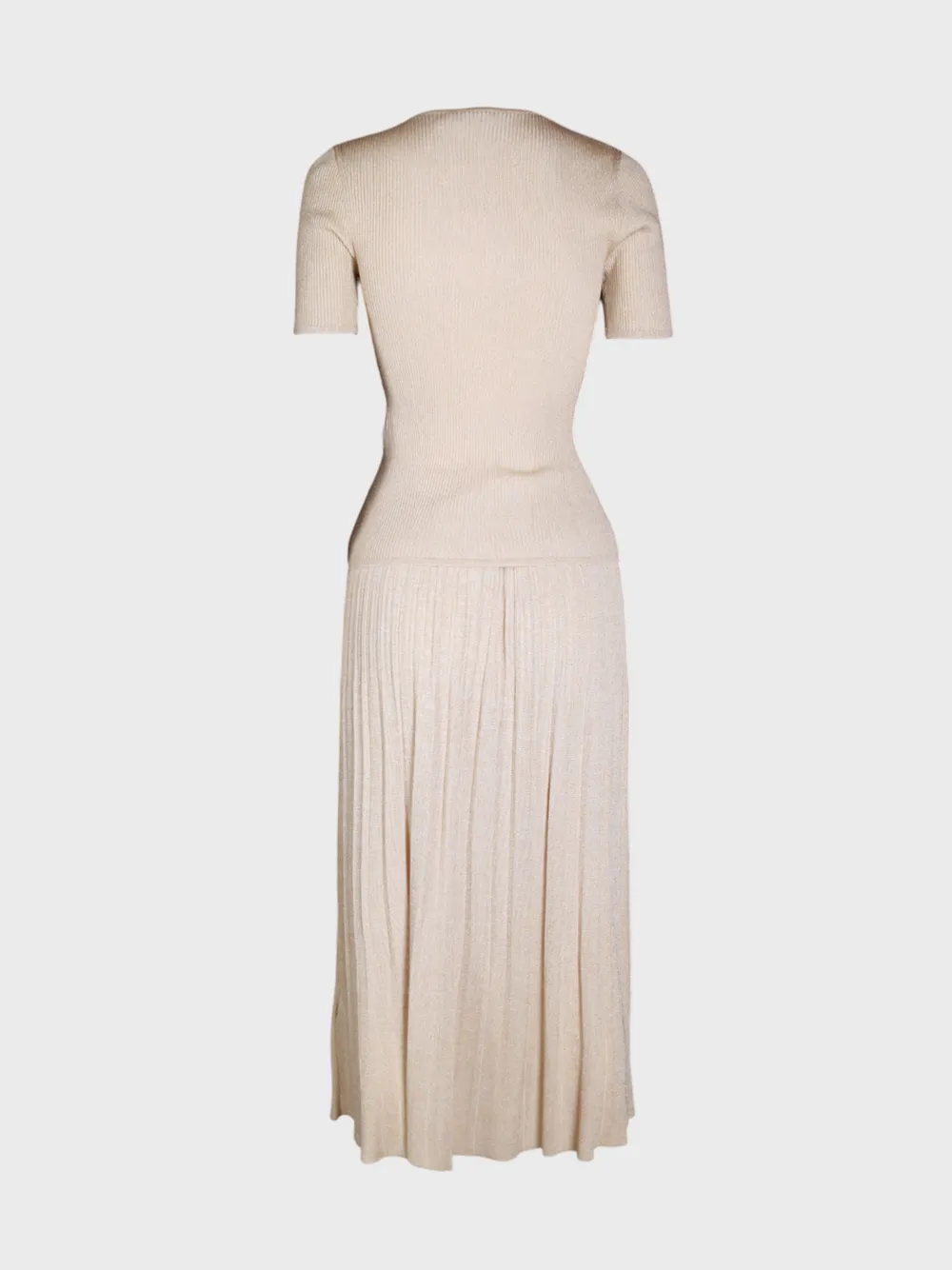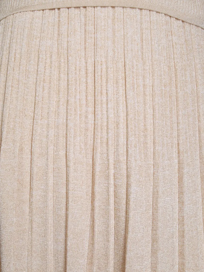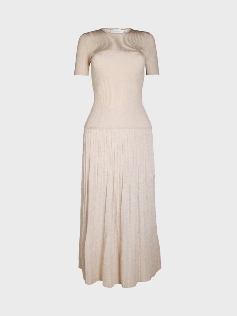 Костюм Zimmermann выполнен из фактурного трикотажа нежного бежевого оттенка, сочетает облегающий топ с короткими рукавами и длинную плиссированную юбку; модель подчёркивает силуэт, создавая элегантный и современный образ для деловых и вечерних мероприятий.