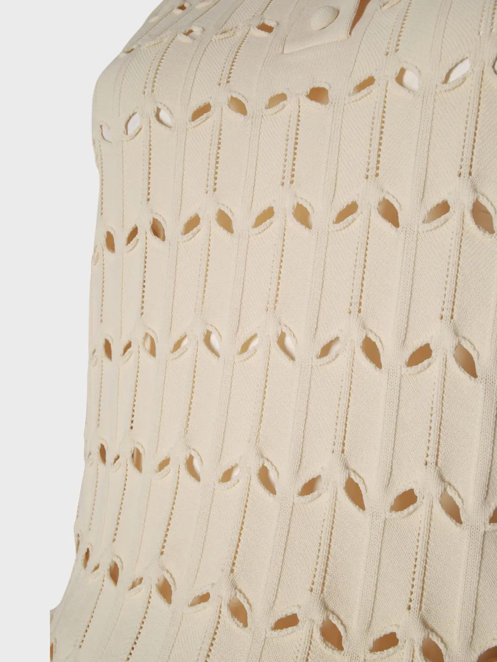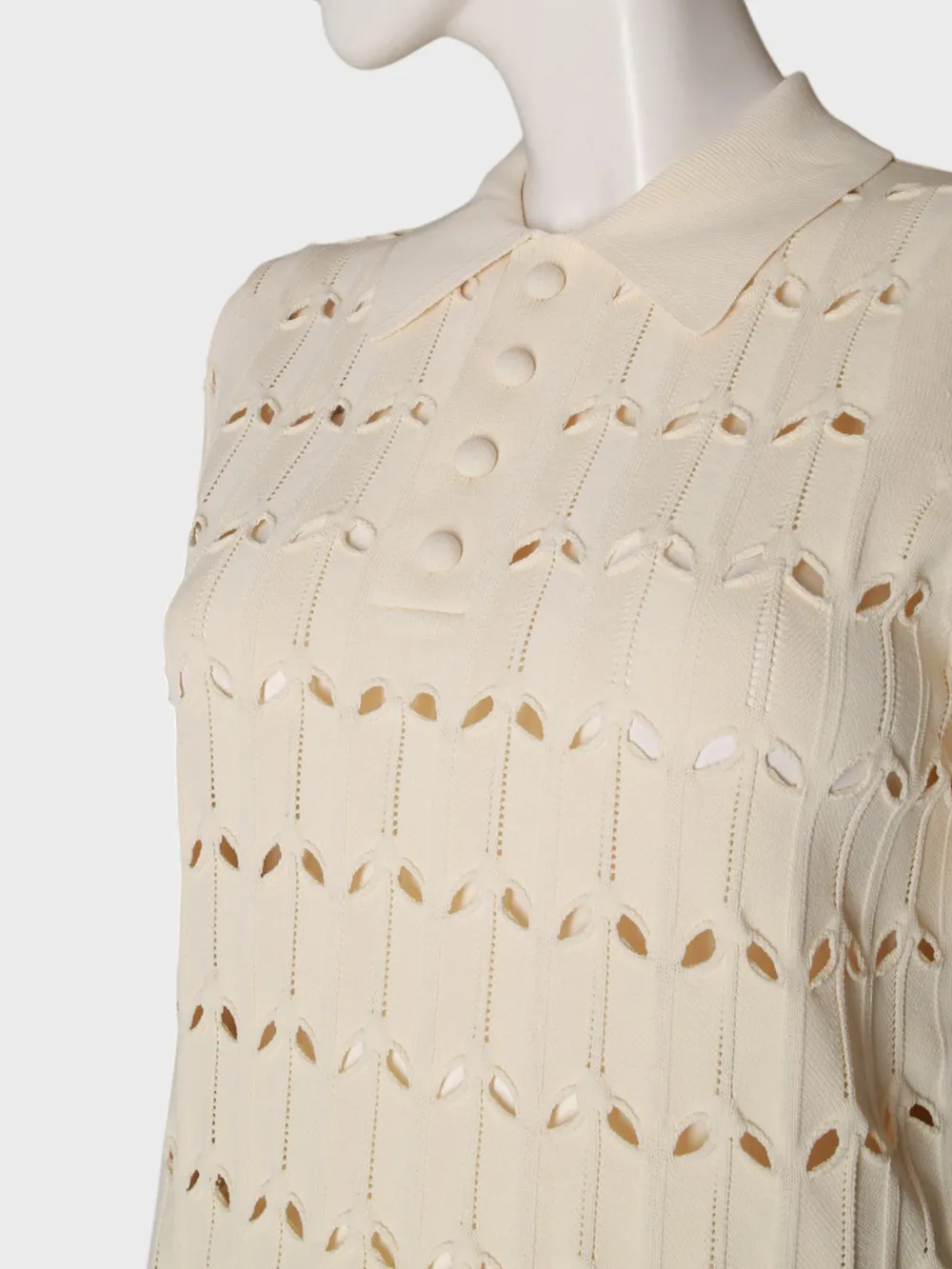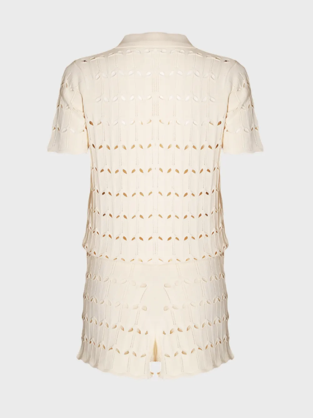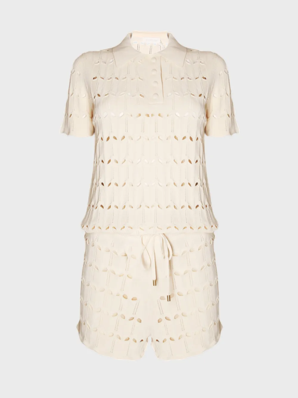 Костюм Zimmermann выполнен из легкой фактурной ткани кремового цвета с оригинальным перфорированным узором, сочетает рубашку-поло с короткими рукавами и шорты на завязке — воздушный, изысканный и комфортный образ для летнего отдыха в стиле современной элегантности.