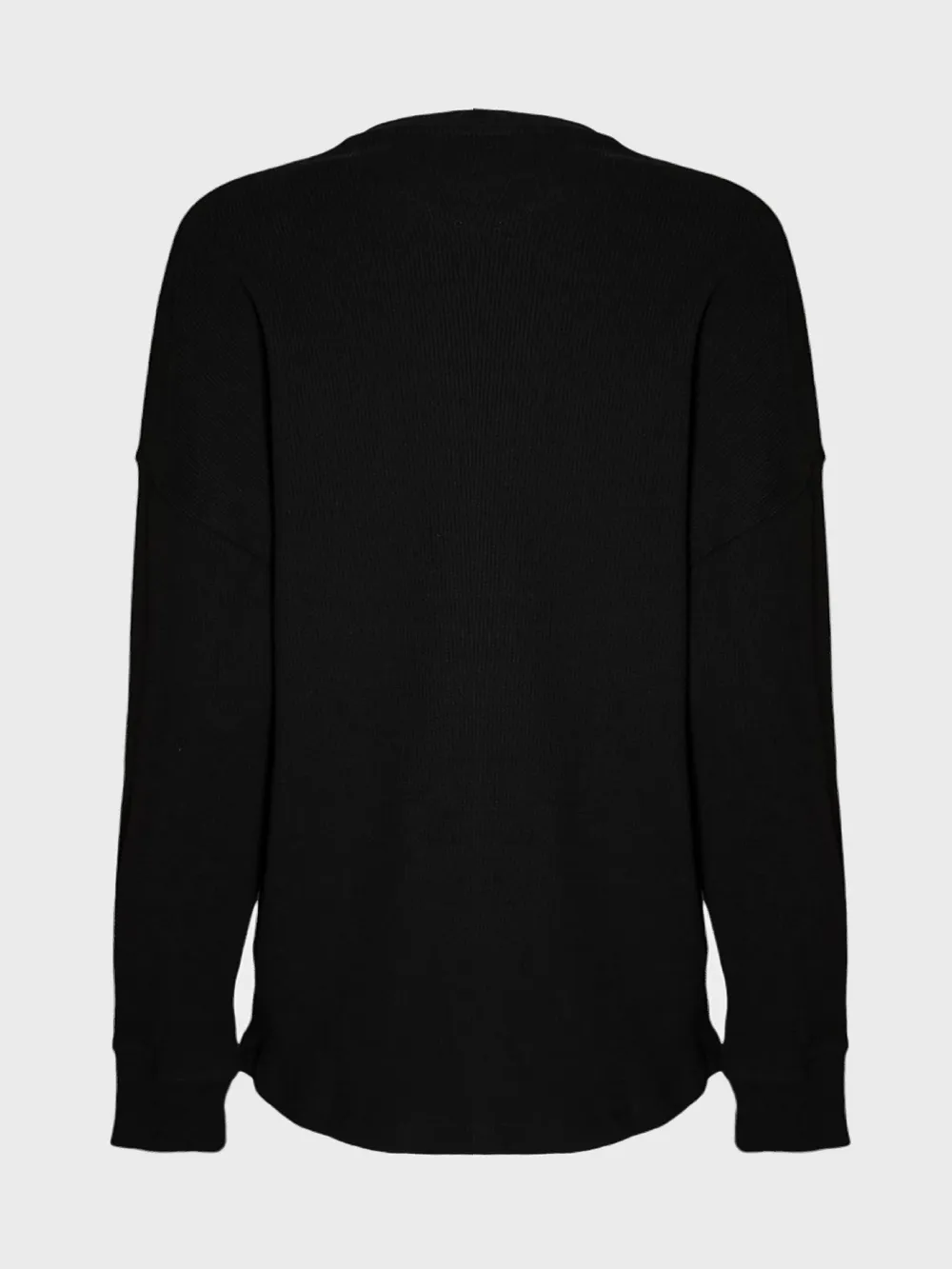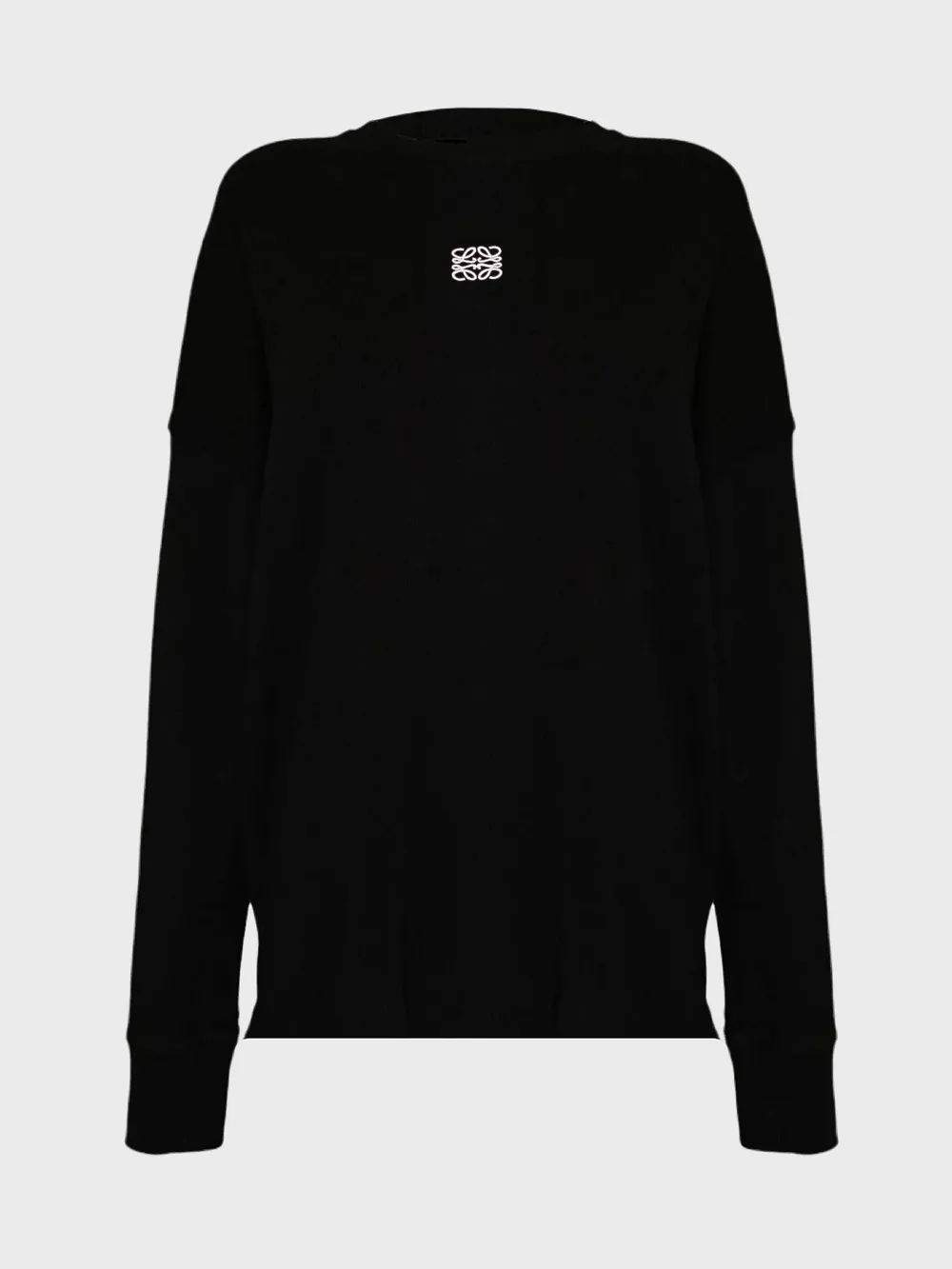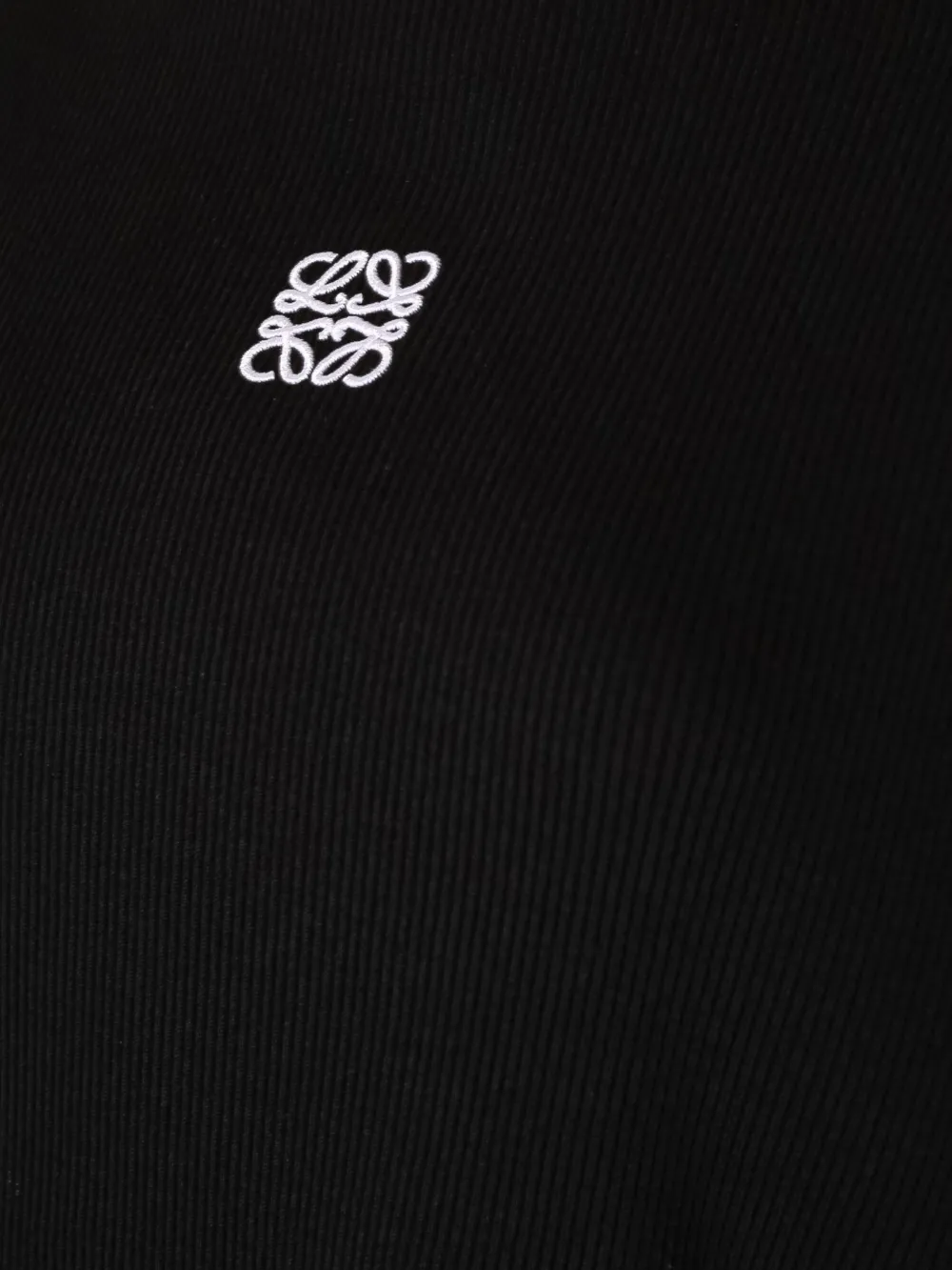 Лонгслив выполнен из высококачественного темно-черного трикотажа с текстурой рибана, обеспечивающей комфорт и тепло. Дизайн лаконичный и элегантный, акцентирован брендовым логотипом "LOEWE" в белом цвете на груди. Модель оснащена круглым вырезом и длинными рукавами, создавая универсальный силуэт для повседневной носки. Прочный материал и качественная отделка гарантируют долговечность и стильный внешний вид. Идеально подходит для прохладных дней или как базовый элемент гардероба.