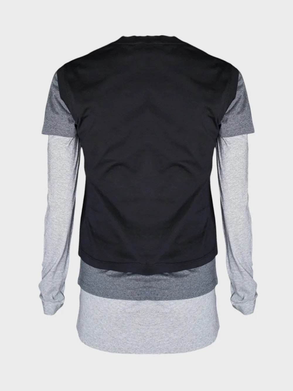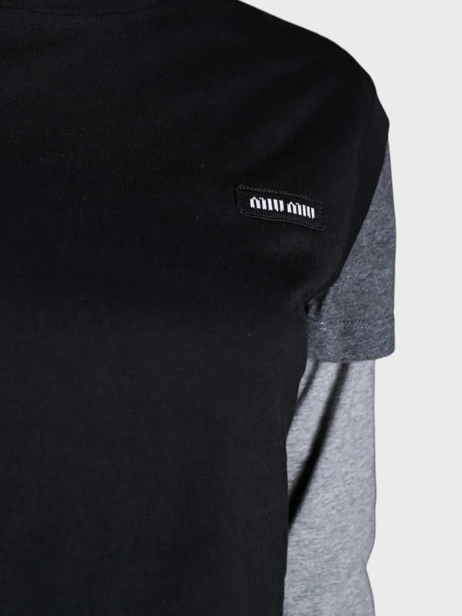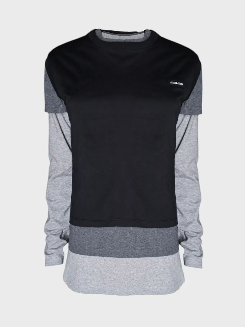Лонгслив Miu Miu выполнен в черно-серых тонах с контрастными вставками и логотипом бренда на груди. Модель сочетает плотную и мягкую ткани, обеспечивая комфорт и стиль. Простой крой делает его универсальным элементом повседневного гардероба.