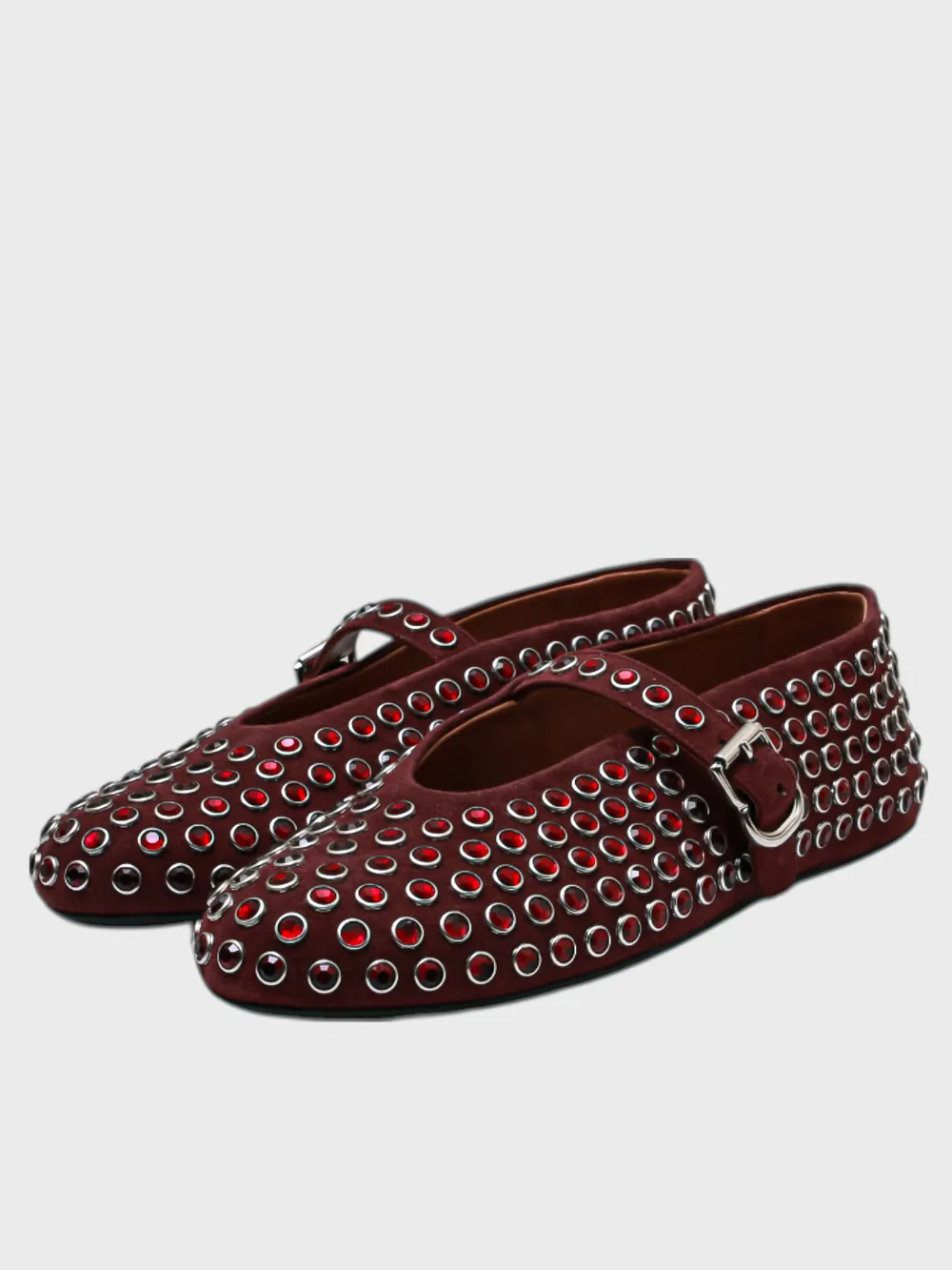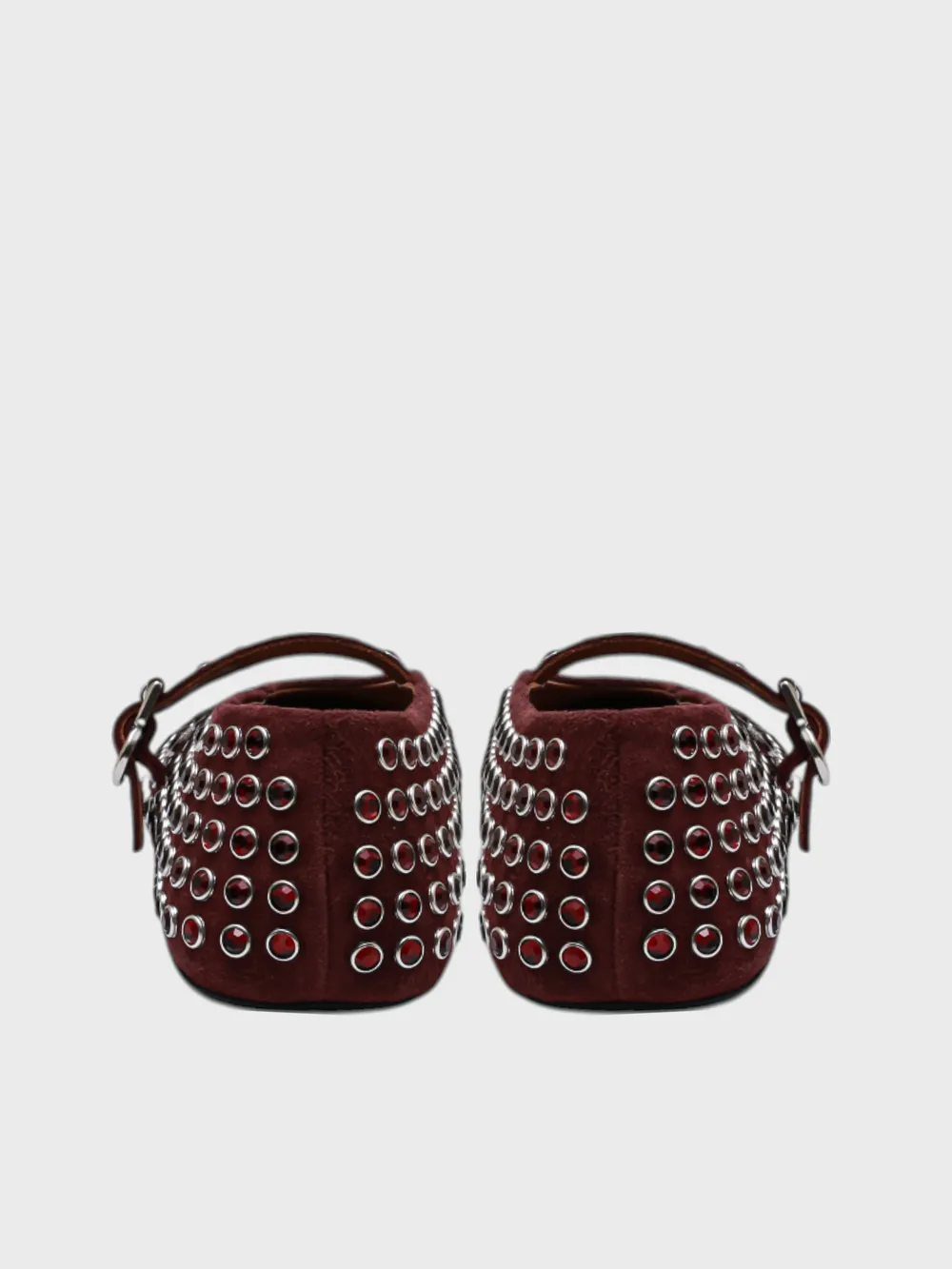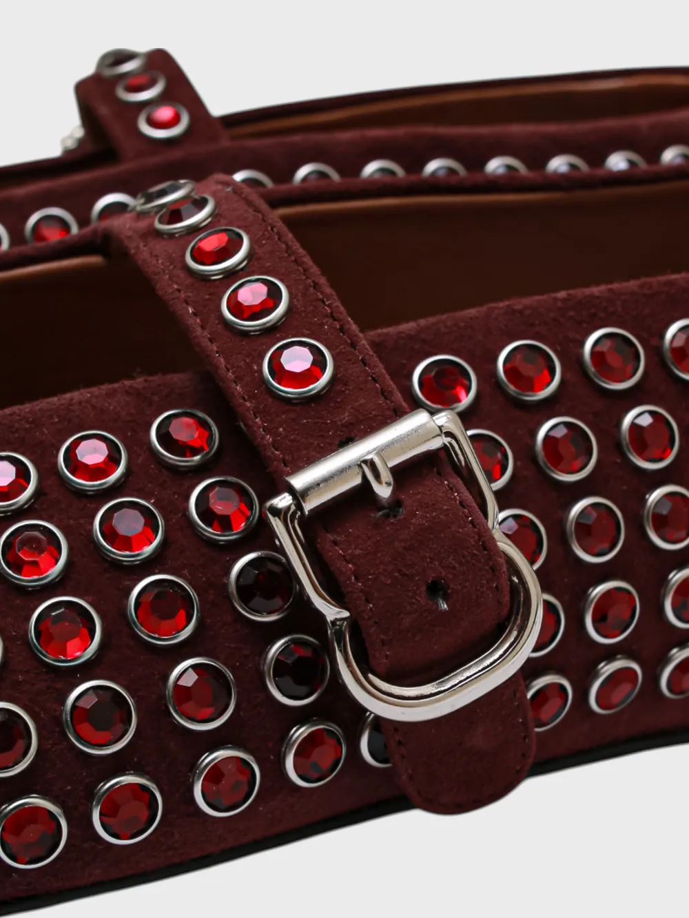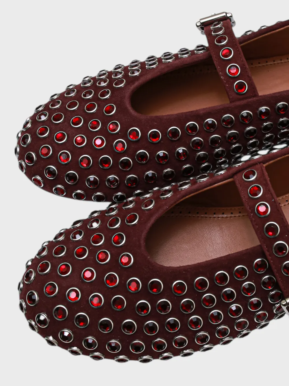 Балетки Alaïa выполнены из бордового замши с модным дизайном и декоративными элементами. Модель дополнена ремешком на лодыжке с металлической пряжкой и украшена множеством красных страз, которые создают эффектное сверкание. Стильные и элегантные — идеальный выбор для вечернего или особого случая, сочетающий роскошь и современность.