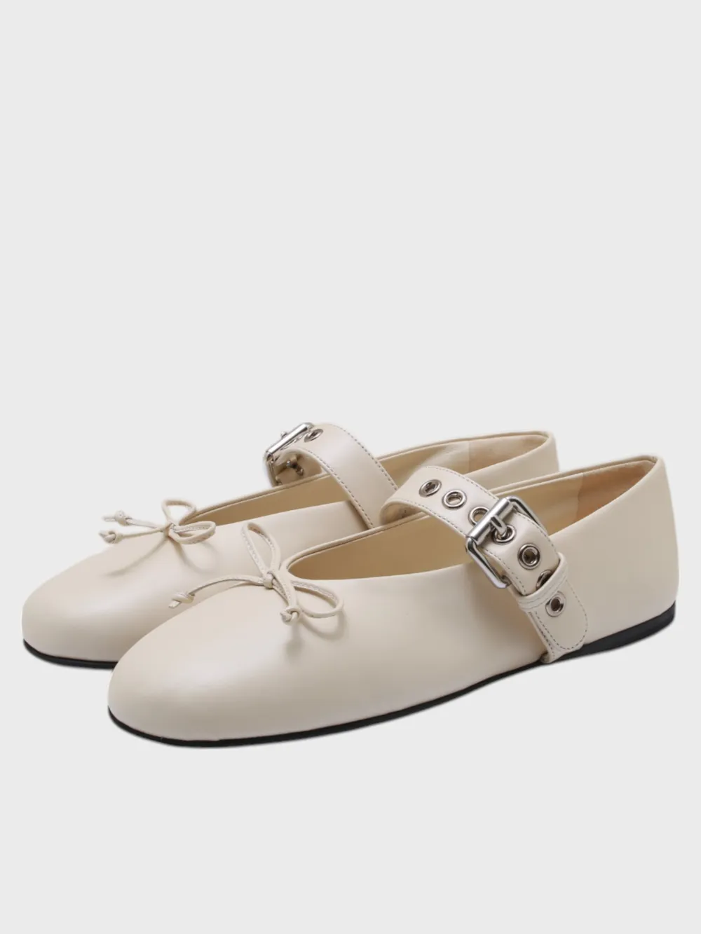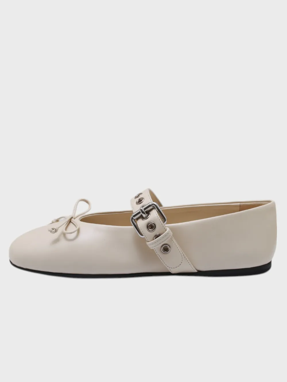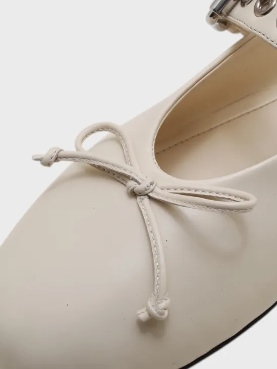 Балетки Miu Miu выполнены из качественной натуральной кожи кремового цвета с гладкой фактурой. Модель дополнена элегантной металлической пряжкой и декоративным бантом, придающим обуви нежный и романтичный стиль. Плоская подошва обеспечивает комфортную посадку, а округлая форма делает их универсальными для повседневного образа. Идеальное сочетание классики и современности для любительниц утонченного стиля.