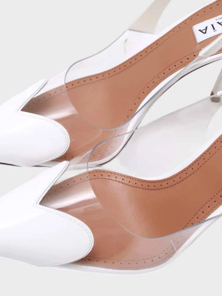 Босоножки Alaia выполнены из качественной глянцевой кожи белого цвета с контрастной кожаной подошвой. Модель оформлена элегантным дизайном: острым носком, тонким ремешком на щиколотке и металлической пряжкой. Высокий устойчивый каблук обеспечивает комфорт при длительной носке. Идеальный выбор для вечерних мероприятий или делового стиля.
