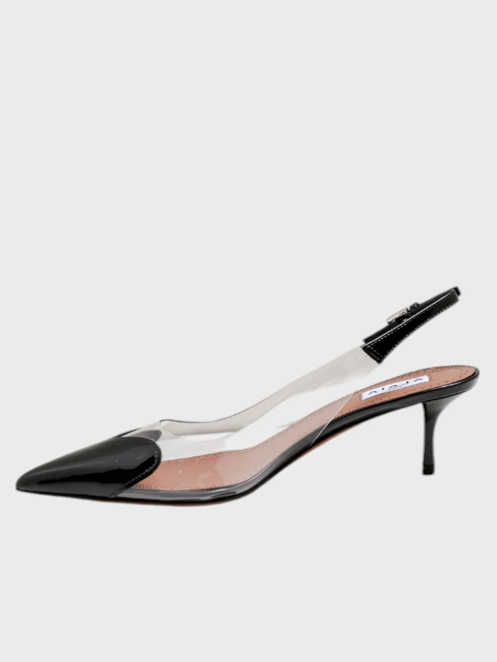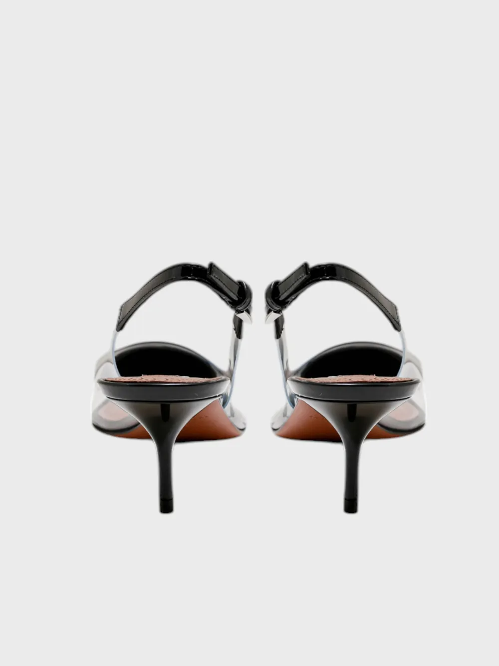 Босоножки ALAIA выполнены из глянцевой чёрной кожи и прозрачного пластика с острым носком и тонким каблуком; модель с ремешком на щиколотке и минималистичным дизайном — сочетание элегантности, современности и узнаваемого стиля бренда, идеально подходящее для вечернего или делового образа.