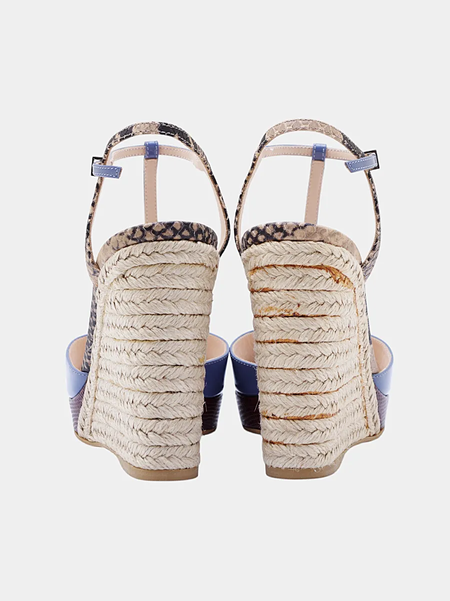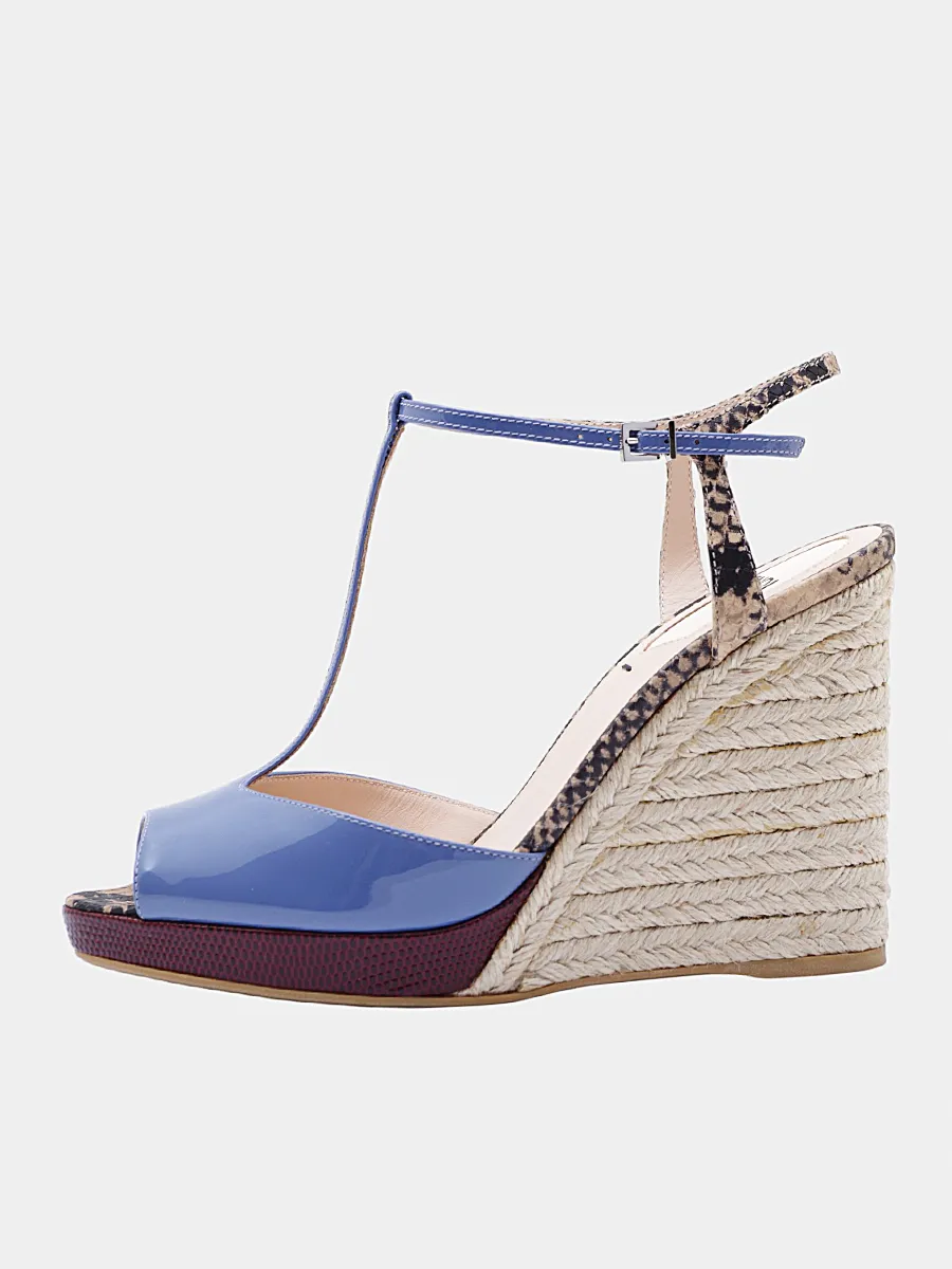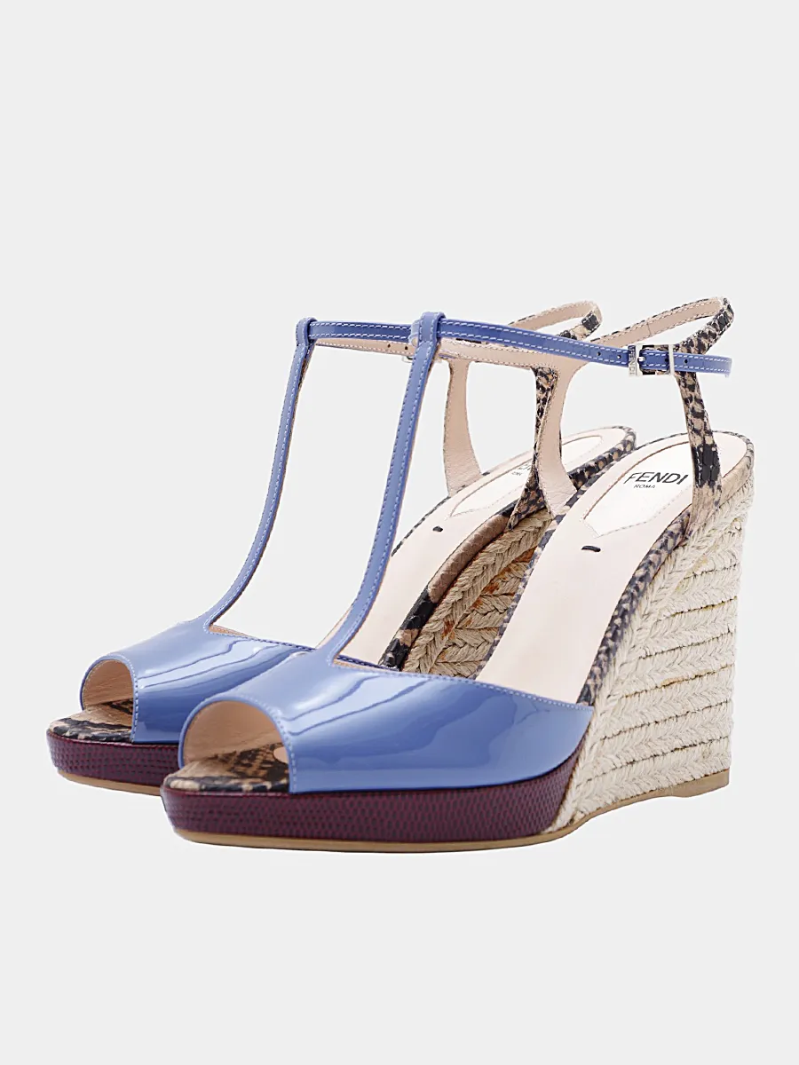 Босоножки Fendi выполнены из лаковой кожи синего цвета и декорированы контрастной красной подошвой. Модель дополнена ремешками на щиколотке, застежкой-пряжкой и массивным плетеным каблуком в стиле эспадрильи, обеспечивающим комфортную посадку. Лаконичный дизайн и яркие цветовые акценты делают эти босоножки стильным выбором для летнего гардероба.