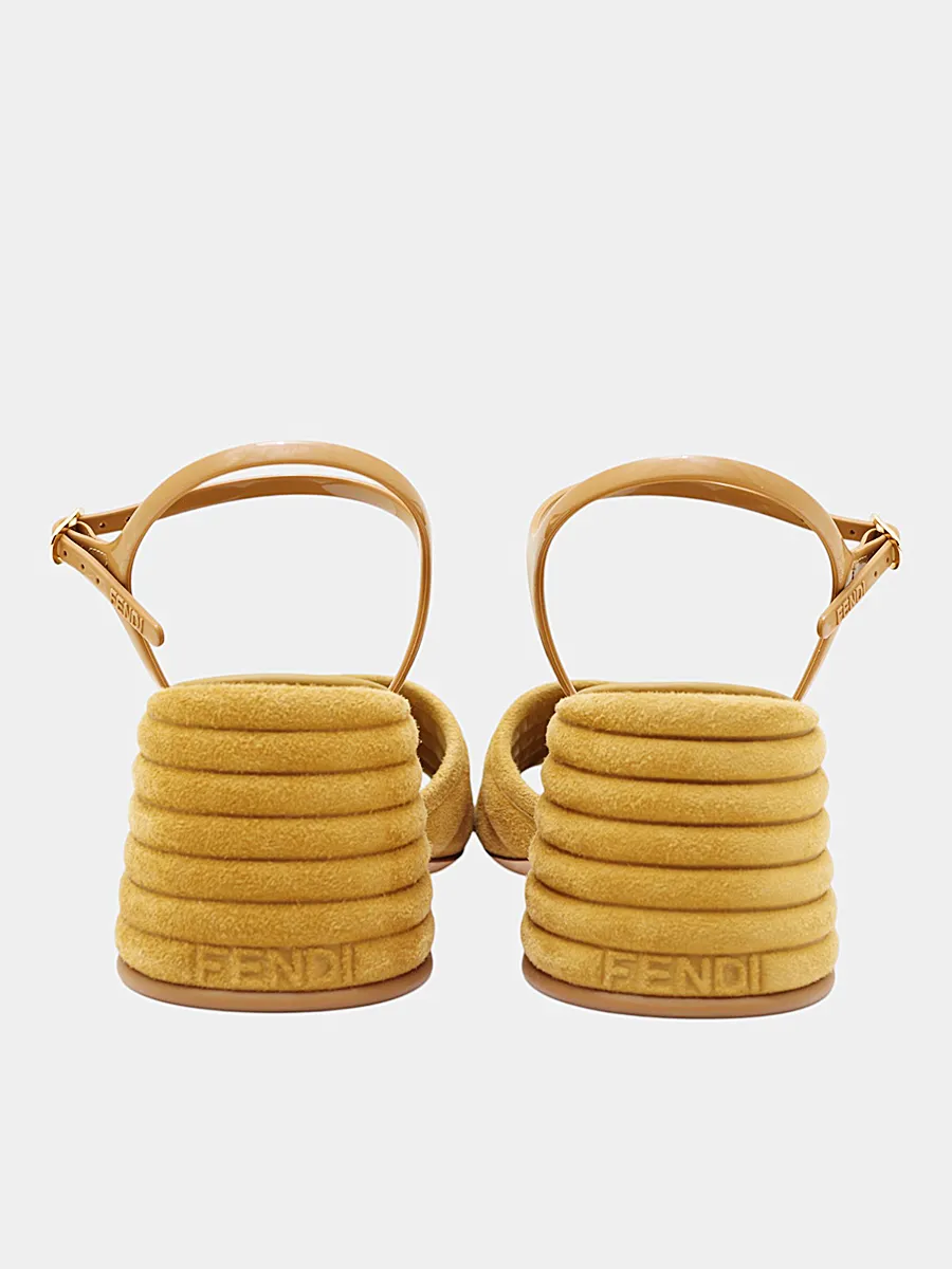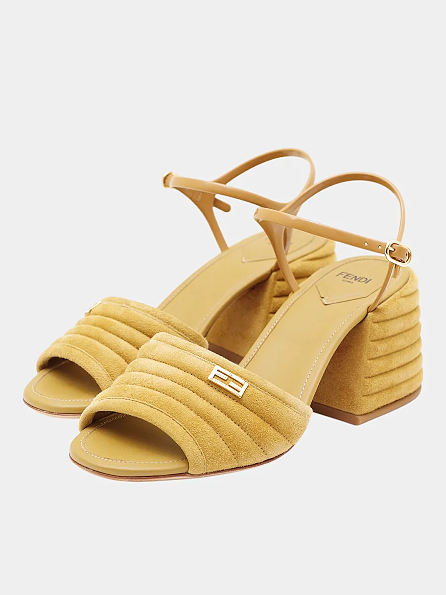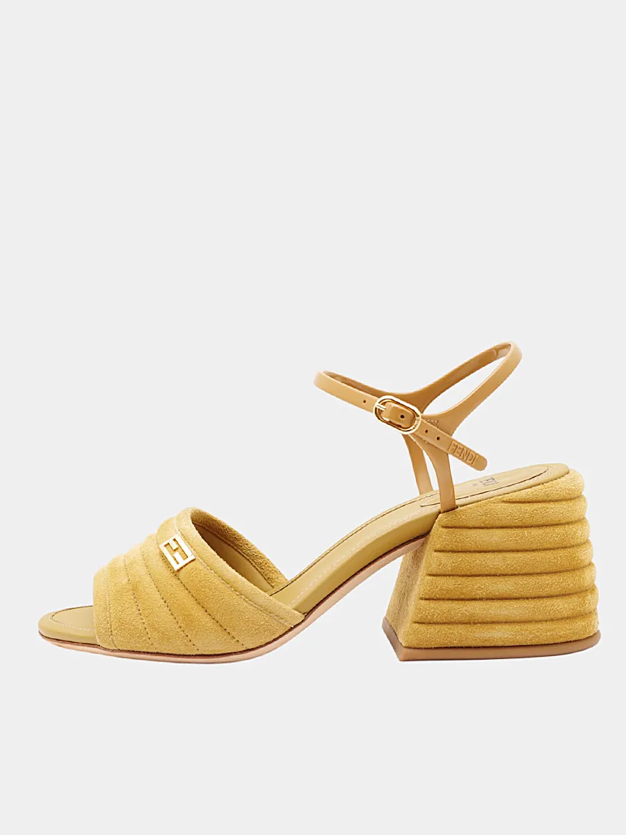 Босоножки Fendi выполнены из качественной замши ярко-желтого цвета с лаконичным дизайном. Модель дополнена декоративной отделкой в виде металлического логотипа бренда "FF" на передней части и ремешком на щиколотке для комфортной посадки. Каблук оформлен текстурой, имитирующей слоистую конструкцию, что придает изделию современный и стильный вид. Идеально подходят для вечерних и особенных случаев.