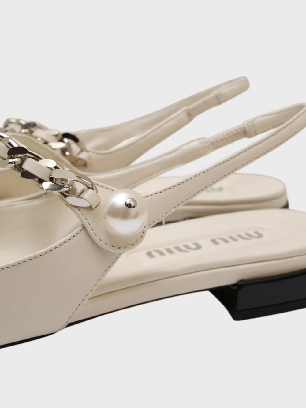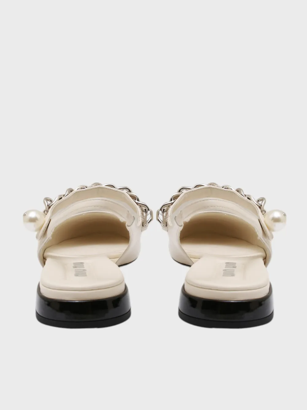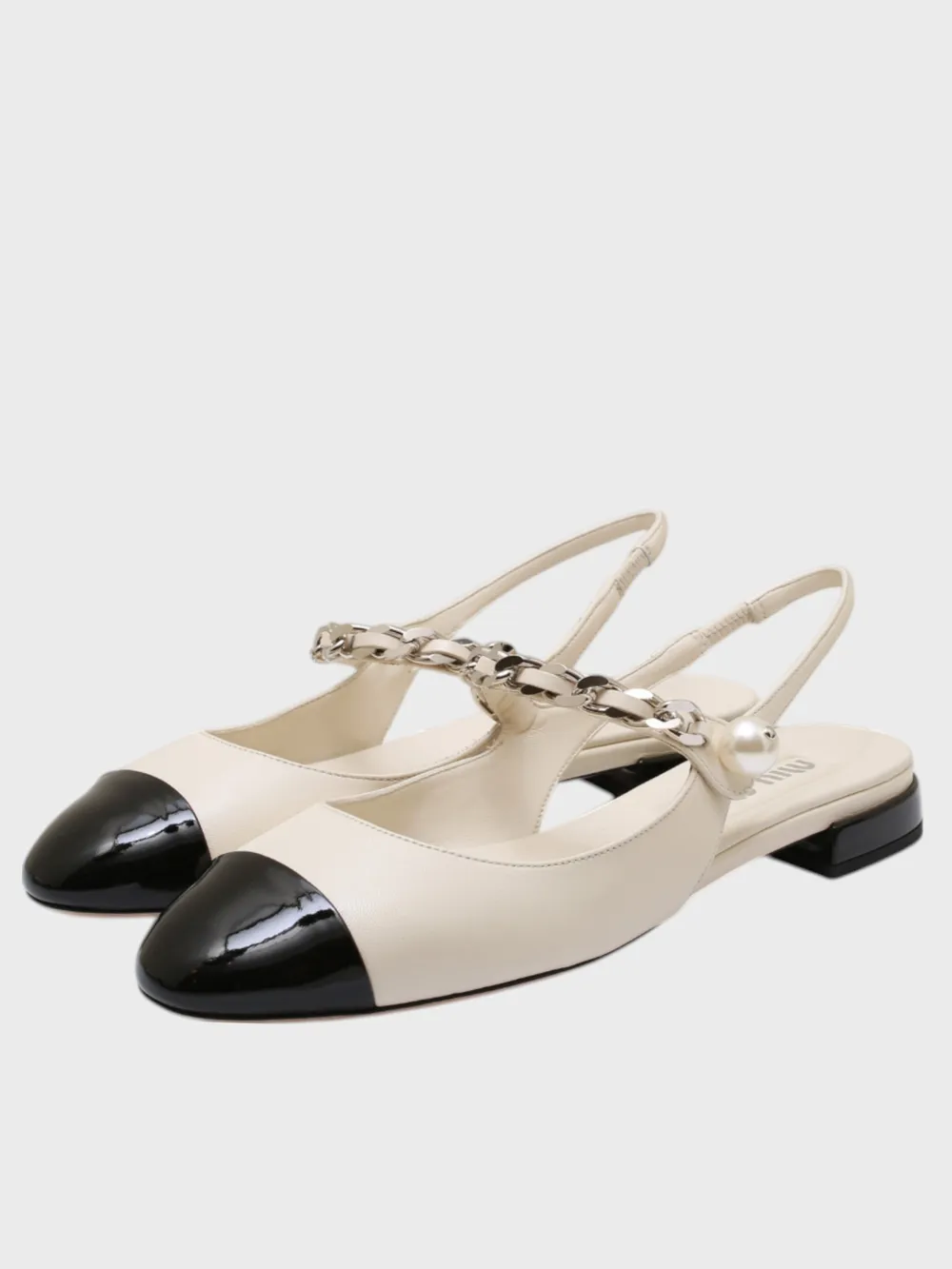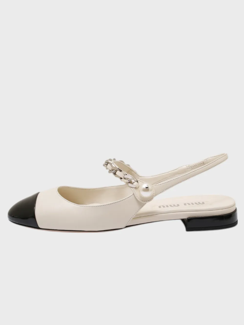 Босоножки Miu Miu выполнены из черно-белой гладкой кожи с контрастным дизайном и металлическими деталями. Модель дополнена декоративной цепочкой на щиколотке, жемчужиной в качестве застежки и устойчивым каблуком. Стильные и элегантные — идеальный выбор для вечернего или делового образа, сочетающий современность и роскошь.